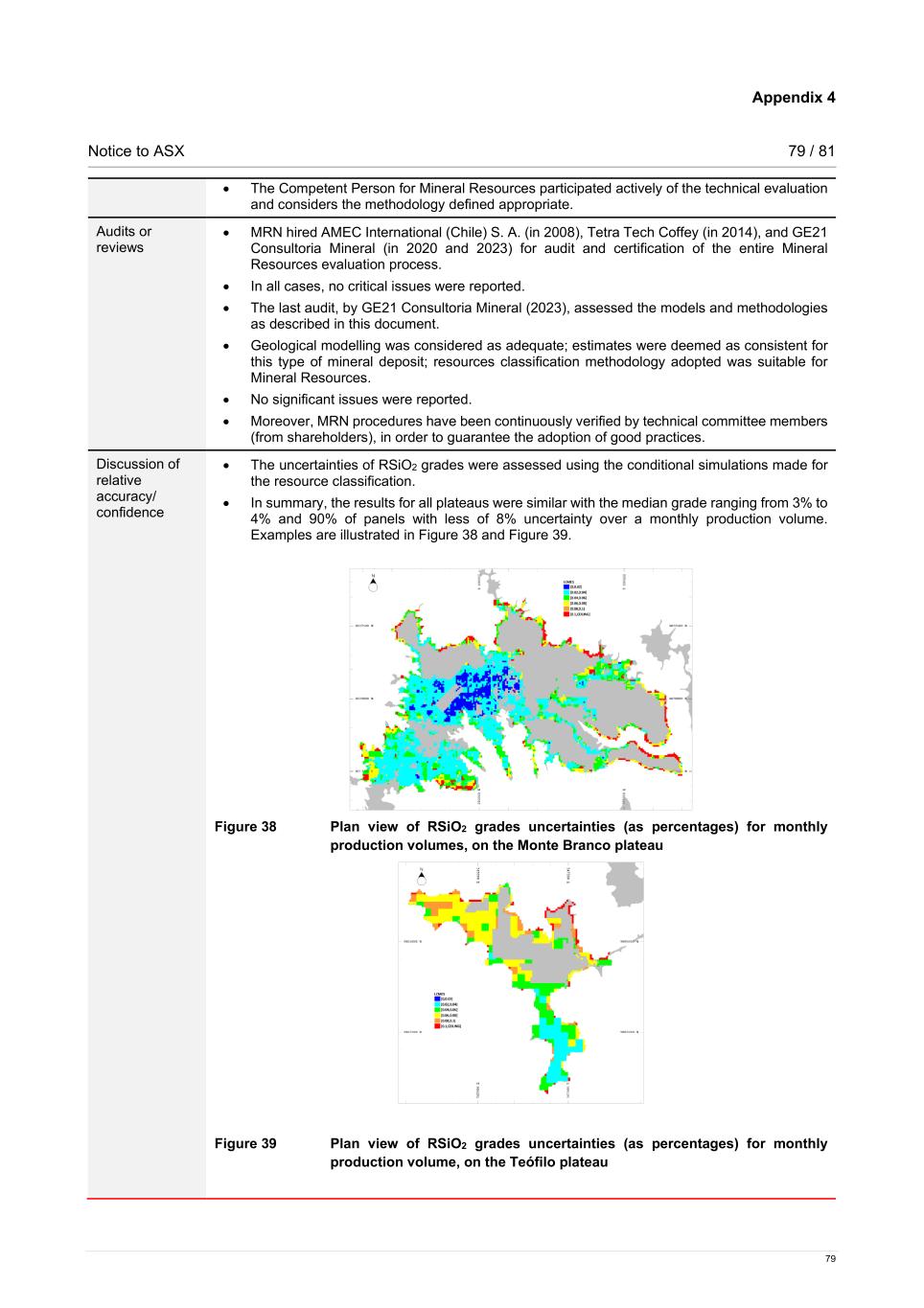 Appendix 4 Notice to ASX 79 / 81 79 • The Competent Person for Mineral Resources participated actively of the technical evaluation and considers the methodology defined appropriate. Audits or reviews • MRN hired AMEC International (Chile) S. A. (in 2008), Tetra Tech Coffey (in 2014), and GE21 Consultoria Mineral (in 2020 and 2023) for audit and certification of the entire Mineral Resources evaluation process. • In all cases, no critical issues were reported. • The last audit, by GE21 Consultoria Mineral (2023), assessed the models and methodologies as described in this document. • Geological modelling was considered as adequate; estimates were deemed as consistent for this type of mineral deposit; resources classification methodology adopted was suitable for Mineral Resources. • No significant issues were reported. • Moreover, MRN procedures have been continuously verified by technical committee members (from shareholders), in order to guarantee the adoption of good practices. Discussion of relative accuracy/ confidence • The uncertainties of RSiO2 grades were assessed using the conditional simulations made for the resource classification. • In summary, the results for all plateaus were similar with the median grade ranging from 3% to 4% and 90% of panels with less of 8% uncertainty over a monthly production volume. Examples are illustrated in Figure 38 and Figure 39. Figure 38 Plan view of RSiO2 grades uncertainties (as percentages) for monthly production volumes, on the Monte Branco plateau Figure 39 Plan view of RSiO2 grades uncertainties (as percentages) for monthly production volume, on the Teófilo plateau