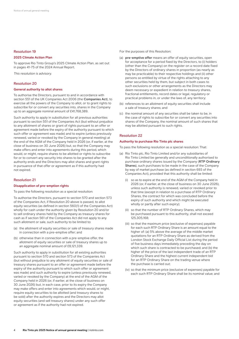 Notice of annual general meeting Resolution 19 2025 Climate Action Plan To approve Rio Tinto Group’s 2025 Climate Action Plan, as set out in pages 41-75 of the 2024 Annual Report. This resolution is advisory. Resolution 20 General authority to allot shares To authorise the Directors, pursuant to and in accordance with section 551 of the UK Companies Act 2006 (the Companies Act), to exercise all the powers of the Company to allot, or to grant rights to subscribe for or convert any securities into, shares in the Company up to an aggregate nominal amount of £41,768,389. Such authority to apply in substitution for all previous authorities pursuant to section 551 of the Companies Act (but without prejudice to any allotment of shares or grant of rights pursuant to an offer or agreement made before the expiry of the authority pursuant to which such offer or agreement was made) and to expire (unless previously renewed, varied or revoked by the Company in general meeting) at the end of the AGM of the Company held in 2026 (or, if earlier, at the close of business on 30 June 2026) but, so that the Company may make offers and enter into agreements during this period, which would, or might, require shares to be allotted or rights to subscribe for or to convert any security into shares to be granted after the authority ends and the Directors may allot shares and grant rights in pursuance of that offer or agreement as if this authority had not expired. Resolution 21 Disapplication of pre-emption rights To pass the following resolution as a special resolution: To authorise the Directors, pursuant to section 570 and section 573 of the Companies Act, if Resolution 20 above is passed, to allot equity securities (as defined in section 560(1) of the Companies Act) wholly for cash under the authority given by Resolution 20 and/or to sell ordinary shares held by the Company as treasury shares for cash as if section 561 of the Companies Act did not apply to any such allotment or sale, such authority to be limited to: (a) the allotment of equity securities or sale of treasury shares made in connection with a pre-emptive offer; and (b) otherwise than in connection with a pre-emptive offer, the allotment of equity securities or sale of treasury shares up to an aggregate nominal amount of £8,121,339. Such authority to apply in substitution for all existing authorities pursuant to section 570 and section 573 of the Companies Act (but without prejudice to any allotment of equity securities or sale of treasury shares pursuant to an offer or agreement made before the expiry of the authority pursuant to which such offer or agreement was made) and such authority to expire (unless previously renewed, varied or revoked by the Company) at the end of the AGM of the Company held in 2026 (or, if earlier, at the close of business on 30 June 2026) but, in each case, prior to its expiry the Company may make offers and enter into agreements which would, or might, require equity securities to be allotted (and treasury shares to be sold) after the authority expires and the Directors may allot equity securities (and sell treasury shares) under any such offer or agreement as if the authority had not expired. For the purposes of this Resolution: (a) pre-emptive offer means an offer of equity securities, open for acceptance for a period fixed by the Directors, to (i) holders (other than the Company) on the register on a record date fixed by the Directors of ordinary shares in proportion (as nearly as may be practicable) to their respective holdings and (ii) other persons so entitled by virtue of the rights attaching to any other securities held by them, but subject in both cases to such exclusions or other arrangements as the Directors may deem necessary or expedient in relation to treasury shares, fractional entitlements, record dates or legal, regulatory or practical problems in, or under the laws of, any territory; (b) references to an allotment of equity securities shall include a sale of treasury shares; and (c) the nominal amount of any securities shall be taken to be, in the case of rights to subscribe for or convert any securities into shares of the Company, the nominal amount of such shares that may be allotted pursuant to such rights. Resolution 22 Authority to purchase Rio Tinto plc shares To pass the following resolution as a special resolution: That: (a) Rio Tinto plc, Rio Tinto Limited and/or any subsidiaries of Rio Tinto Limited be generally and unconditionally authorised to purchase ordinary shares issued by the Company (RTP Ordinary Shares), such purchases to be made in the case of the Company by way of market purchase (as defined in section 693 of the Companies Act), provided that this authority shall be limited: (i) so as to expire at the end of the AGM of the Company held in 2026 (or, if earlier, at the close of business on 30 June 2026), unless such authority is renewed, varied or revoked prior to that time (except in relation to a purchase of RTP Ordinary Shares, the contract for which was concluded before the expiry of such authority and which might be executed wholly or partly after such expiry); (ii) so that the number of RTP Ordinary Shares, which may be purchased pursuant to this authority, shall not exceed 125,305,168; (iii) so that the maximum price (exclusive of expenses) payable for each such RTP Ordinary Share is an amount equal to the higher of: (a) 5% above the average of the middle market quotations for an RTP Ordinary Share as derived from the London Stock Exchange Daily Official List during the period of five business days immediately preceding the day on which such share is contracted to be purchased; and (b) the higher of the price of the last independent trade of an RTP Ordinary Share and the highest current independent bid for an RTP Ordinary Share on the trading venue where the purchase is carried out; (iv) so that the minimum price (exclusive of expenses) payable for each such RTP Ordinary 