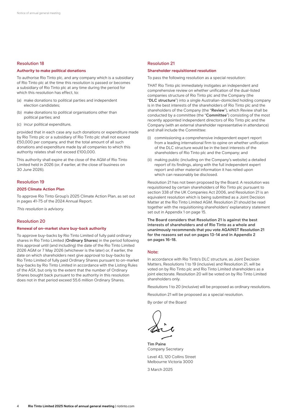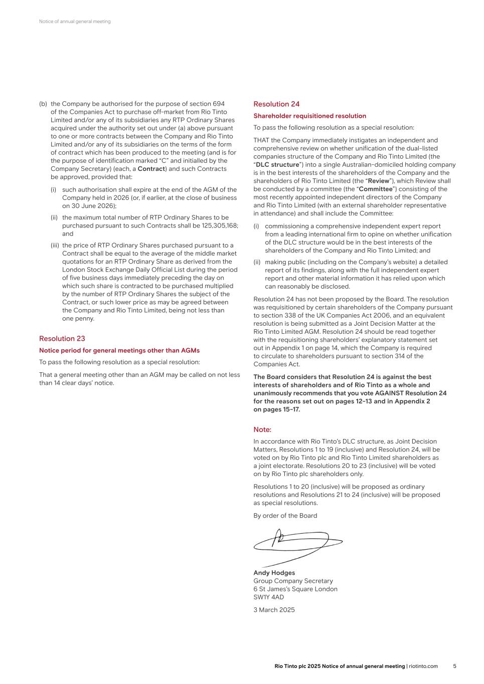 Notice of annual general meeting (b) the Company be authorised for the purpose of section 694 of the Companies Act to purchase off-market from Rio Tinto Limited and/or any of its subsidiaries any RTP Ordinary Shares acquired under the authority set out under (a) above pursuant to one or more contracts between the Company and Rio Tinto Limited and/or any of its subsidiaries on the terms of the form of contract which has been produced to the meeting (and is for the purpose of identification marked “C” and initialled by the Company Secretary) (each, a Contract) and such Contracts be approved, provided that: (i) such authorisation shall expire at the end of the AGM of the Company held in 2026 (or, if earlier, at the close of business on 30 June 2026); (ii) the maximum total number of RTP Ordinary Shares to be purchased pursuant to such Contracts shall be 125,305,168; and (iii) the price of RTP Ordinary Shares purchased pursuant to a Contract shall be equal to the average of the middle market quotations for an RTP Ordinary Share as derived from the London Stock Exchange Daily Official List during the period of five business days immediately preceding the day on which such share is contracted to be purchased multiplied by the number of RTP Ordinary Shares the subject of the Contract, or such lower price as may be agreed between the Company and Rio Tinto Limited, being not less than one penny. Resolution 23 Notice period for general meetings other than AGMs To pass the following resolution as a special resolution: That a general meeting other than an AGM may be called on not less than 14 clear days’ notice. Resolution 24 Shareholder requisitioned resolution To pass the following resolution as a special resolution: THAT the Company immediately instigates an independent and comprehensive review on whether unification of the dual-listed companies structure of the Company and Rio Tinto Limited (the “DLC structure”) into a single Australian-domiciled holding company is in the best interests of the shareholders of the Company and the shareholders of Rio Tinto Limited (the “Review”), which Review shall be conducted by a committee (the “Committee”) consisting of the most recently appointed independent directors of the Company and Rio Tinto Limited (with an external shareholder representative in attendance) and shall include the Committee: (i) commissioning a comprehensive independent expert report from a leading international firm to opine on whether unification of the DLC structure would be in the best interests of the shareholders of the Company and Rio Tinto Limited; and (ii) making public (including on the Company’s website) a detailed report of its findings, along with the full independent expert report and other material information it has relied upon which can reasonably be disclosed. Resolution 24 has not been proposed by the Board. The resolution was requisitioned by certain shareholders of the Company pursuant to section 338 of the UK Companies Act 2006, and an equivalent resolution is being submitted as a Joint Decision Matter at the Rio Tinto Limited AGM. Resolution 24 should be read together with the requisitioning shareholders’ explanatory statement set out in Appendix 1 on page 14, which the Company is required to circulate to shareholders pursuant to section 314 of the Companies Act. The Board considers that Resolution 24 is against the best interests of shareholders and of Rio Tinto as a whole and unanimously recommends that you vote AGAINST Resolution 24 for the reasons set out on pages 12-13 and in Appendix 2 on pages 15-17. Note: In accordance with Rio Tinto’s DLC structure, as Joint Decision Matters, Resolutions 1 to 19 (inclusive) and Resolution 24, will be voted on by Rio Tinto plc and Rio Tinto Limited shareholders as a joint electorate. Resolutions 20 to 23 (inclusive) will be voted on by Rio Tinto plc shareholders only. Resolutions 1 to 20 (inclusive) will be proposed as ordinary resolutions and Resolutions 21 to 24 (inclusive) will be proposed as special resolutions. By order of the Board Andy Hodges Group Company Secretary 6 St James’s Square London SW1Y 4AD 3 March 2025 5Rio Tinto plc 2025 Notice of annual general meeting | riotinto.com