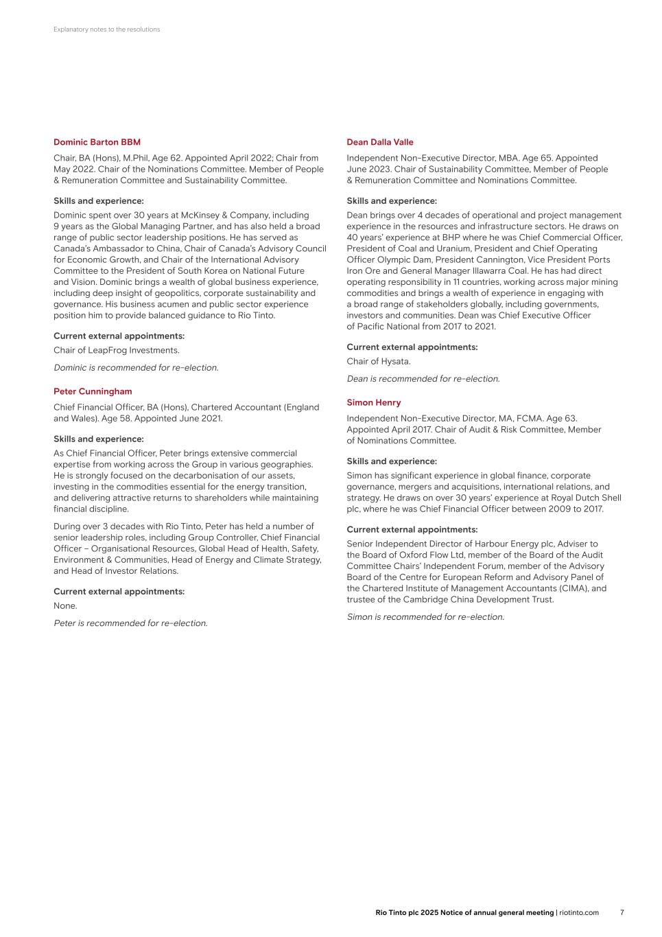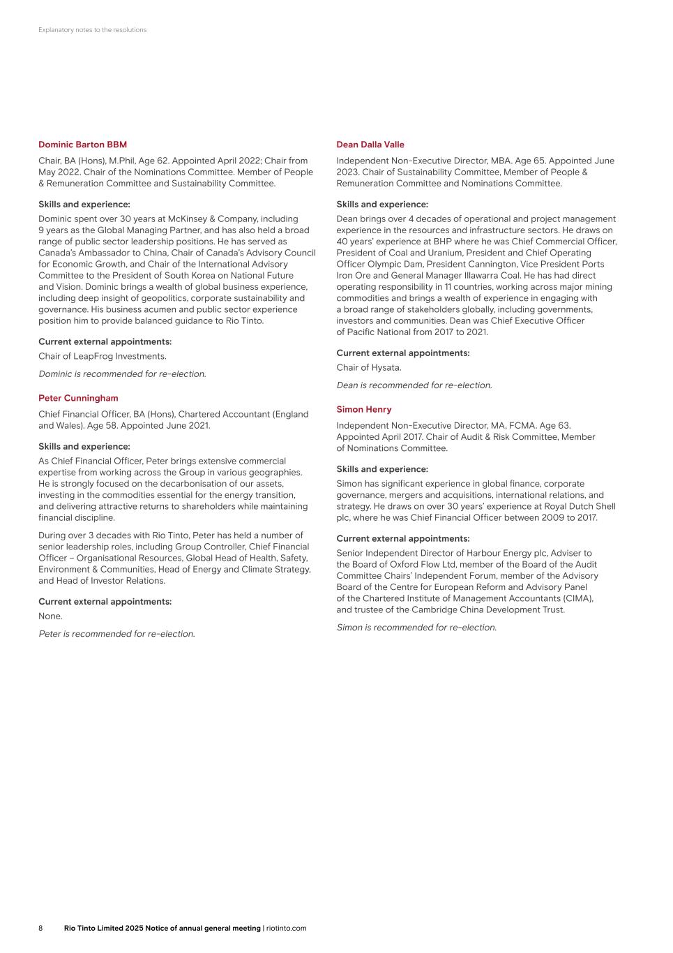 Explanatory notes to the resolutions Dominic Barton BBM Chair, BA (Hons), M.Phil, Age 62. Appointed April 2022; Chair from May 2022. Chair of the Nominations Committee. Member of People & Remuneration Committee and Sustainability Committee. Skills and experience: Dominic spent over 30 years at McKinsey & Company, including 9 years as the Global Managing Partner, and has also held a broad range of public sector leadership positions. He has served as Canada’s Ambassador to China, Chair of Canada’s Advisory Council for Economic Growth, and Chair of the International Advisory Committee to the President of South Korea on National Future and Vision. Dominic brings a wealth of global business experience, including deep insight of geopolitics, corporate sustainability and governance. His business acumen and public sector experience position him to provide balanced guidance to Rio Tinto. Current external appointments: Chair of LeapFrog Investments. Dominic is recommended for re-election. Peter Cunningham Chief Financial Officer, BA (Hons), Chartered Accountant (England and Wales). Age 58. Appointed June 2021. Skills and experience: As Chief Financial Officer, Peter brings extensive commercial expertise from working across the Group in various geographies. He is strongly focused on the decarbonisation of our assets, investing in the commodities essential for the energy transition, and delivering attractive returns to shareholders while maintaining financial discipline. During over 3 decades with Rio Tinto, Peter has held a number of senior leadership roles, including Group Controller, Chief Financial Officer – Organisational Resources, Global Head of Health, Safety, Environment & Communities, Head of Energy and Climate Strategy, and Head of Investor Relations. Current external appointments: None. Peter is recommended for re-election. Dean Dalla Valle Independent Non-Executive Director, MBA. Age 65. Appointed June 2023. Chair of Sustainability Committee, Member of People & Remuneration Committee and Nominations Committee. Skills and experience: Dean brings over 4 decades of operational and project management experience in the resources and infrastructure sectors. He draws on 40 years’ experience at BHP where he was Chief Commercial Officer, President of Coal and Uranium, President and Chief Operating Officer Olympic Dam, President Cannington, Vice President Ports Iron Ore and General Manager Illawarra Coal. He has had direct operating responsibility in 11 countries, working across major mining commodities and brings a wealth of experience in engaging with a broad range of stakeholders globally, including governments, investors and communities. Dean was Chief Executive Officer of Pacific National from 2017 to 2021. Current external appointments: Chair of Hysata. Dean is recommended for re-election. Simon Henry Independent Non-Executive Director, MA, FCMA. Age 63. Appointed April 2017. Chair of Audit & Risk Committee, Member of Nominations Committee. Skills and experience: Simon has significant experience in global finance, corporate governance, mergers and acquisitions, international relations, and strategy. He draws on over 30 years’ experience at Royal Dutch Shell plc, where he was Chief Financial Officer between 2009 to 2017. Current external appointments: Senior Independent Director of Harbour Energy plc, Adviser to the Board of Oxford Flow Ltd, member of the Board of the Audit Committee Chairs’ Independent Forum, member of the Advisory Board of the Centre for European Reform and Advisory Panel of the Chartered Institute of Management Accountants (CIMA), and trustee of the Cambridge China Development Trust. Simon is recommended for re-election. 7Rio Tinto plc 2025 Notice of annual general meeting | riotinto.com