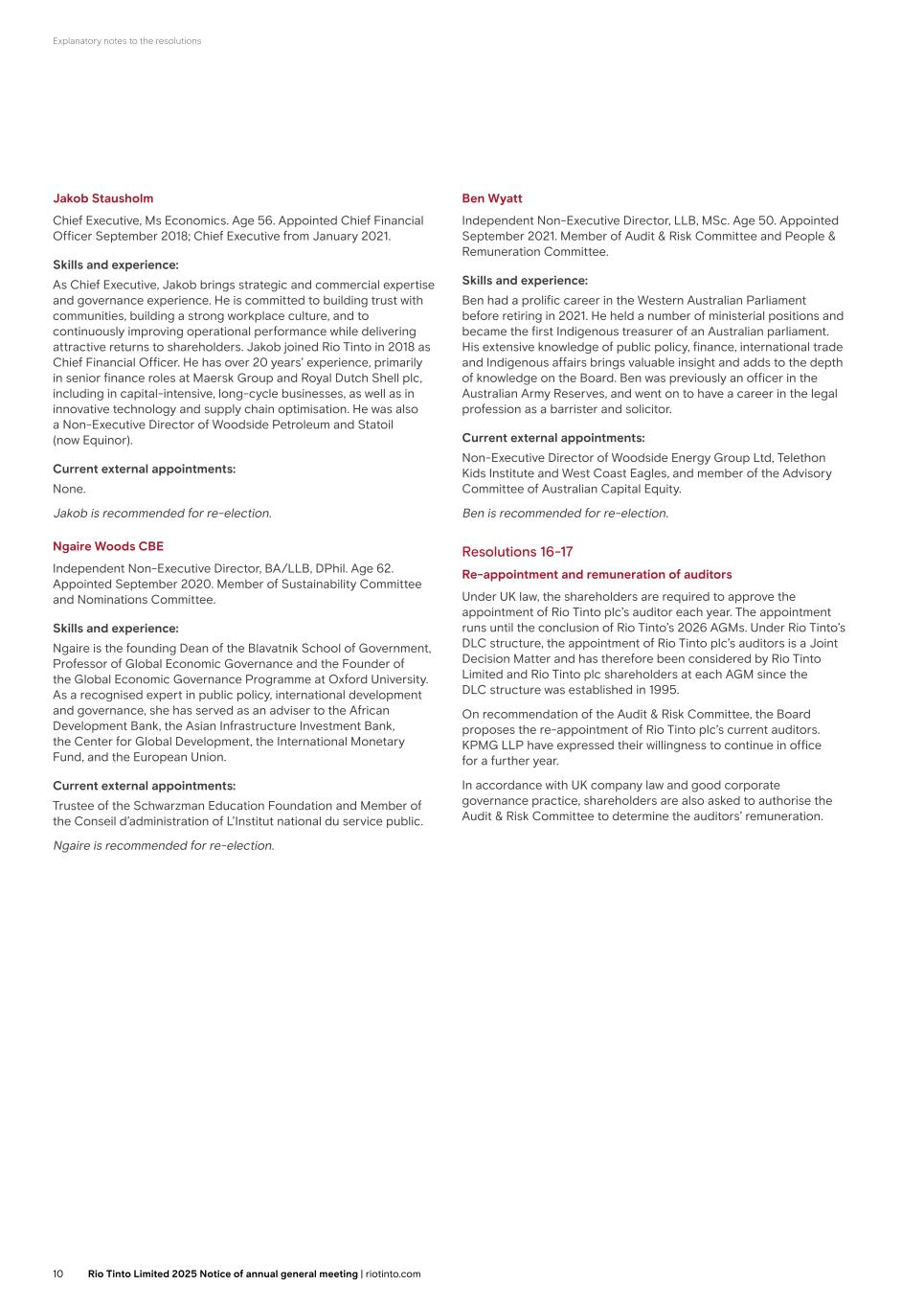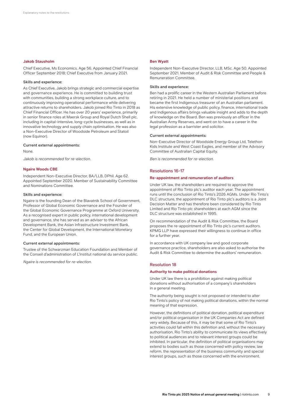 Explanatory notes to the resolutions Jakob Stausholm Chief Executive, Ms Economics. Age 56. Appointed Chief Financial Officer September 2018; Chief Executive from January 2021. Skills and experience: As Chief Executive, Jakob brings strategic and commercial expertise and governance experience. He is committed to building trust with communities, building a strong workplace culture, and to continuously improving operational performance while delivering attractive returns to shareholders. Jakob joined Rio Tinto in 2018 as Chief Financial Officer. He has over 20 years’ experience, primarily in senior finance roles at Maersk Group and Royal Dutch Shell plc, including in capital-intensive, long-cycle businesses, as well as in innovative technology and supply chain optimisation. He was also a Non-Executive Director of Woodside Petroleum and Statoil (now Equinor). Current external appointments: None. Jakob is recommended for re-election. Ngaire Woods CBE Independent Non-Executive Director, BA/LLB, DPhil. Age 62. Appointed September 2020. Member of Sustainability Committee and Nominations Committee. Skills and experience: Ngaire is the founding Dean of the Blavatnik School of Government, Professor of Global Economic Governance and the Founder of the Global Economic Governance Programme at Oxford University. As a recognised expert in public policy, international development and governance, she has served as an adviser to the African Development Bank, the Asian Infrastructure Investment Bank, the Center for Global Development, the International Monetary Fund, and the European Union. Current external appointments: Trustee of the Schwarzman Education Foundation and Member of the Conseil d’administration of L’Institut national du service public. Ngaire is recommended for re-election. Ben Wyatt Independent Non-Executive Director, LLB, MSc. Age 50. Appointed September 2021. Member of Audit & Risk Committee and People & Remuneration Committee. Skills and experience: Ben had a prolific career in the Western Australian Parliament before retiring in 2021. He held a number of ministerial positions and became the first Indigenous treasurer of an Australian parliament. His extensive knowledge of public policy, finance, international trade and Indigenous affairs brings valuable insight and adds to the depth of knowledge on the Board. Ben was previously an officer in the Australian Army Reserves, and went on to have a career in the legal profession as a barrister and solicitor. Current external appointments: Non-Executive Director of Woodside Energy Group Ltd, Telethon Kids Institute and West Coast Eagles, and member of the Advisory Committee of Australian Capital Equity. Ben is recommended for re-election. Resolutions 16-17 Re-appointment and remuneration of auditors Under UK law, the shareholders are required to approve the appointment of Rio Tinto plc’s auditor each year. The appointment runs until the conclusion of Rio Tinto’s 2026 AGMs. Under Rio Tinto’s DLC structure, the appointment of Rio Tinto plc’s auditors is a Joint Decision Matter and has therefore been considered by Rio Tinto Limited and Rio Tinto plc shareholders at each AGM since the DLC structure was established in 1995. On recommendation of the Audit & Risk Committee, the Board proposes the re-appointment of Rio Tinto plc’s current auditors. KPMG LLP have expressed their willingness to continue in office for a further year. In accordance with UK company law and good corporate governance practice, shareholders are also asked to authorise the Audit & Risk Committee to determine the auditors’ remuneration. Resolution 18 Authority to make political donations Under UK law there is a prohibition against making political donations without authorisation of a company’s shareholders in a general meeting. The authority being sought is not proposed or intended to alter Rio Tinto’s policy of not making political donations, within the normal meaning of that expression. However, the definitions of political donation, political expenditure and/or political organisation in the UK Companies Act are defined very widely. Because of this, it may be that some of Rio Tinto’s activities could fall within this definition and, without the necessary authorisation, Rio Tinto’s ability to communicate its views effectively to political audiences and to relevant interest groups could be inhibited. In particular, the definition of political organisations may extend to bodies such as those concerned with policy review, law reform, the representation of the business community and special interest groups, such as those concerned with the environment. 9Rio Tinto plc 2025 Notice of annual general meeting | riotinto.com