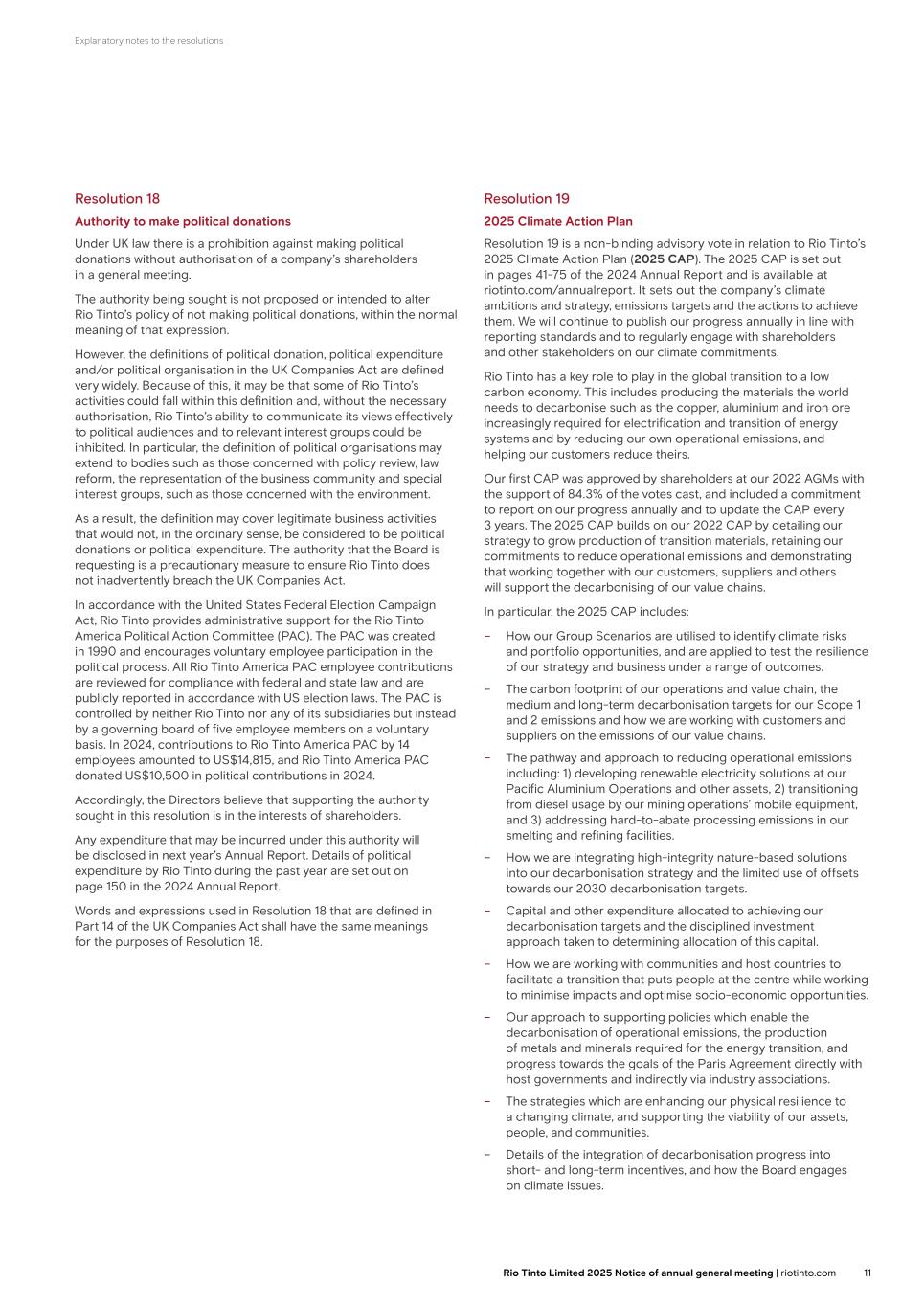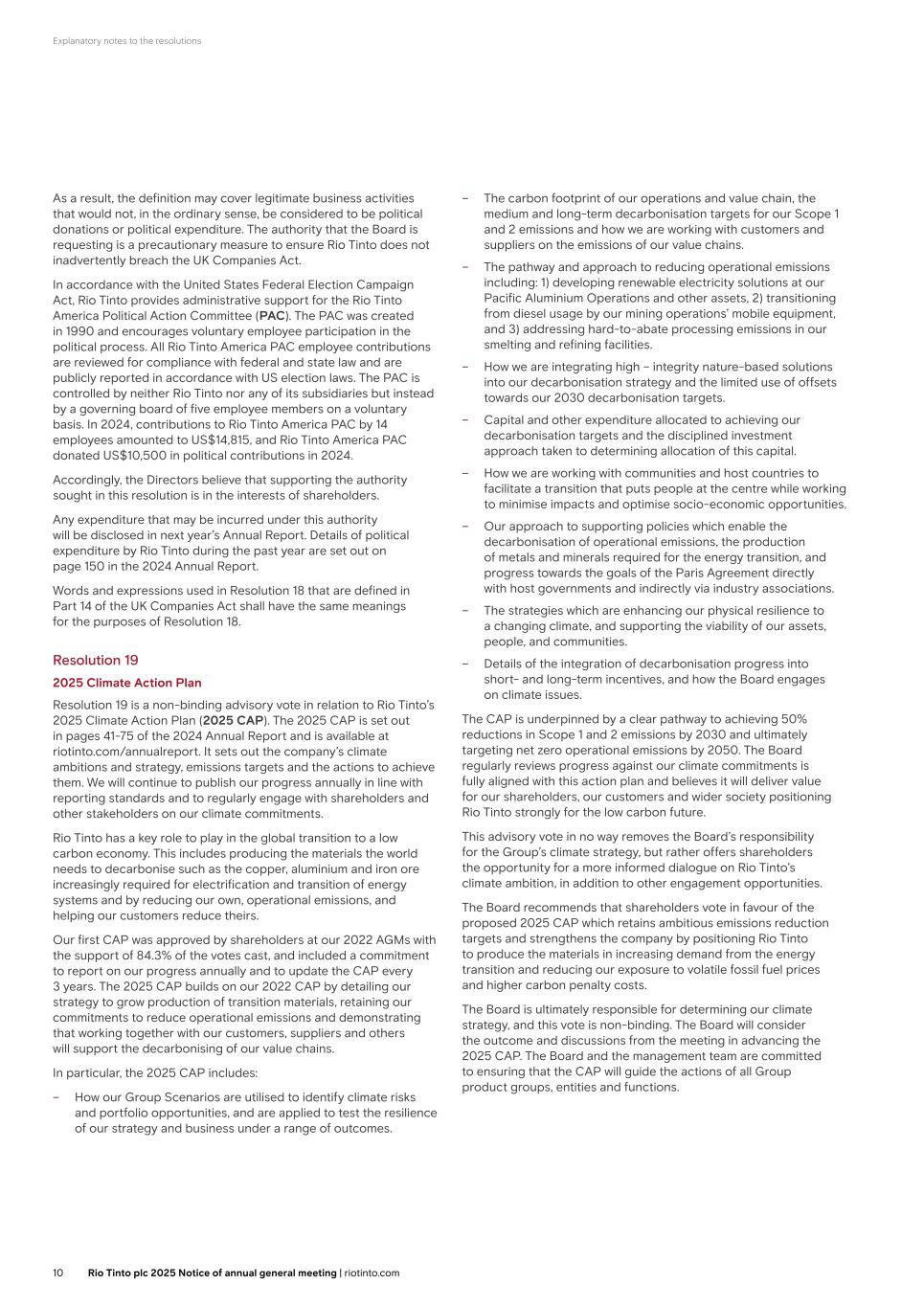Explanatory notes to the resolutions As a result, the definition may cover legitimate business activities that would not, in the ordinary sense, be considered to be political donations or political expenditure. The authority that the Board is requesting is a precautionary measure to ensure Rio Tinto does not inadvertently breach the UK Companies Act. In accordance with the United States Federal Election Campaign Act, Rio Tinto provides administrative support for the Rio Tinto America Political Action Committee (PAC). The PAC was created in 1990 and encourages voluntary employee participation in the political process. All Rio Tinto America PAC employee contributions are reviewed for compliance with federal and state law and are publicly reported in accordance with US election laws. The PAC is controlled by neither Rio Tinto nor any of its subsidiaries but instead by a governing board of five employee members on a voluntary basis. In 2024, contributions to Rio Tinto America PAC by 14 employees amounted to US$14,815, and Rio Tinto America PAC donated US$10,500 in political contributions in 2024. Accordingly, the Directors believe that supporting the authority sought in this resolution is in the interests of shareholders. Any expenditure that may be incurred under this authority will be disclosed in next year’s Annual Report. Details of political expenditure by Rio Tinto during the past year are set out on page 150 in the 2024 Annual Report. Words and expressions used in Resolution 18 that are defined in Part 14 of the UK Companies Act shall have the same meanings for the purposes of Resolution 18. Resolution 19 2025 Climate Action Plan Resolution 19 is a non-binding advisory vote in relation to Rio Tinto’s 2025 Climate Action Plan (2025 CAP). The 2025 CAP is set out in pages 41-75 of the 2024 Annual Report and is available at riotinto.com/annualreport. It sets out the company’s climate ambitions and strategy, emissions targets and the actions to achieve them. We will continue to publish our progress annually in line with reporting standards and to regularly engage with shareholders and other stakeholders on our climate commitments. Rio Tinto has a key role to play in the global transition to a low carbon economy. This includes producing the materials the world needs to decarbonise such as the copper, aluminium and iron ore increasingly required for electrification and transition of energy systems and by reducing our own, operational emissions, and helping our customers reduce theirs. Our first CAP was approved by shareholders at our 2022 AGMs with the support of 84.3% of the votes cast, and included a commitment to report on our progress annually and to update the CAP every 3 years. The 2025 CAP builds on our 2022 CAP by detailing our strategy to grow production of transition materials, retaining our commitments to reduce operational emissions and demonstrating that working together with our customers, suppliers and others will support the decarbonising of our value chains. In particular, the 2025 CAP includes: – How our Group Scenarios are utilised to identify climate risks and portfolio opportunities, and are applied to test the resilience of our strategy and business under a range of outcomes. – The carbon footprint of our operations and value chain, the medium and long-term decarbonisation targets for our Scope 1 and 2 emissions and how we are working with customers and suppliers on the emissions of our value chains. – The pathway and approach to reducing operational emissions including: 1) developing renewable electricity solutions at our Pacific Aluminium Operations and other assets, 2) transitioning from diesel usage by our mining operations’ mobile equipment, and 3) addressing hard-to-abate processing emissions in our smelting and refining facilities. – How we are integrating high – integrity nature-based solutions into our decarbonisation strategy and the limited use of offsets towards our 2030 decarbonisation targets. – Capital and other expenditure allocated to achieving our decarbonisation targets and the disciplined investment approach taken to determining allocation of this capital. – How we are working with communities and host countries to facilitate a transition that puts people at the centre while working to minimise impacts and optimise socio-economic opportunities. – Our approach to supporting policies which enable the decarbonisation of operational emissions, the production of metals and minerals required for the energy transition, and progress towards the goals of the Paris Agreement directly with host governments and indirectly via industry associations. – The strategies which are enhancing our physical resilience to a changing climate, and supporting the viability of our assets, people, and communities. – Details of the integration of decarbonisation progress into short- and long-term incentives, and how the Board engages on climate issues. The CAP is underpinned by a clear pathway to achieving 50% reductions in Scope 1 and 2 emissions by 2030 and ultimately targeting net zero operational emissions by 2050. The Board regularly reviews progress against our climate commitments is fully aligned with this action plan and believes it will deliver value for our shareholders, our customers and wider society positioning Rio Tinto strongly for the low carbon future. This advisory vote in no way removes the Board’s responsibility for the Group’s climate strategy, but rather offers shareholders the opportunity for a more informed dialogue on Rio Tinto’s climate ambition, in addition to other engagement opportunities. The Board recommends that shareholders vote in favour of the proposed 2025 CAP which retains ambitious emissions reduction targets and strengthens the company by positioning Rio Tinto to produce the materials in increasing demand from the energy transition and reducing our exposure to volatile fossil fuel prices and higher carbon p
