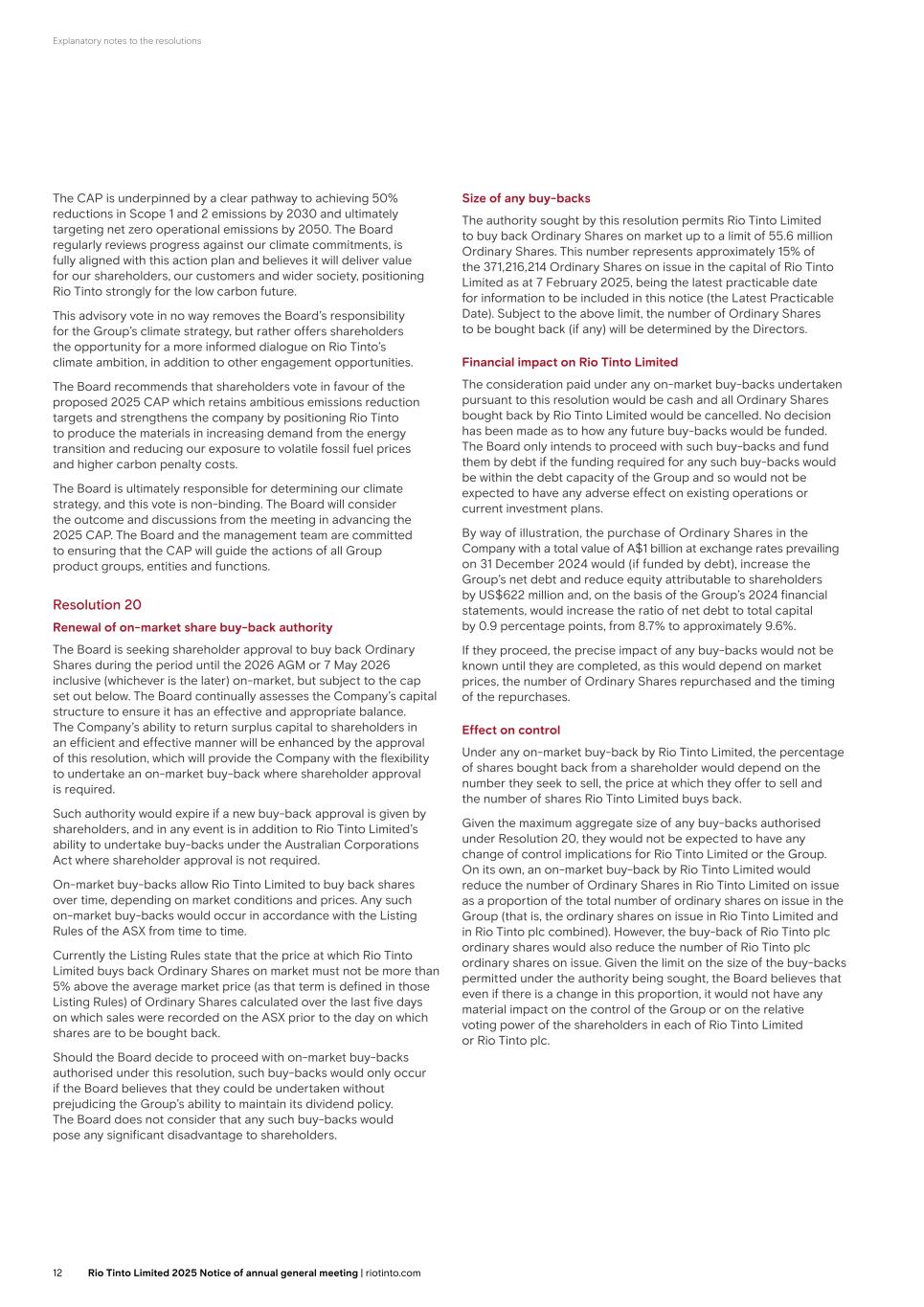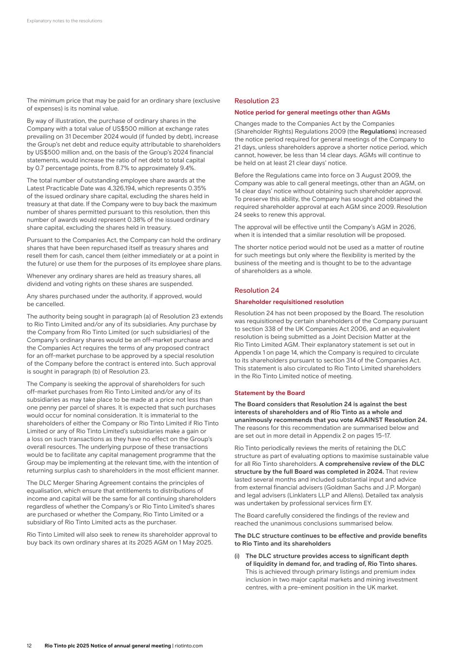 Explanatory notes to the resolutions The minimum price that may be paid for an ordinary share (exclusive of expenses) is its nominal value. By way of illustration, the purchase of ordinary shares in the Company with a total value of US$500 million at exchange rates prevailing on 31 December 2024 would (if funded by debt), increase the Group’s net debt and reduce equity attributable to shareholders by US$500 million and, on the basis of the Group’s 2024 financial statements, would increase the ratio of net debt to total capital by 0.7 percentage points, from 8.7% to approximately 9.4%. The total number of outstanding employee share awards at the Latest Practicable Date was 4,326,194, which represents 0.35% of the issued ordinary share capital, excluding the shares held in treasury at that date. If the Company were to buy back the maximum number of shares permitted pursuant to this resolution, then this number of awards would represent 0.38% of the issued ordinary share capital, excluding the shares held in treasury. Pursuant to the Companies Act, the Company can hold the ordinary shares that have been repurchased itself as treasury shares and resell them for cash, cancel them (either immediately or at a point in the future) or use them for the purposes of its employee share plans. Whenever any ordinary shares are held as treasury shares, all dividend and voting rights on these shares are suspended. Any shares purchased under the authority, if approved, would be cancelled. The authority being sought in paragraph (a) of Resolution 23 extends to Rio Tinto Limited and/or any of its subsidiaries. Any purchase by the Company from Rio Tinto Limited (or such subsidiaries) of the Company’s ordinary shares would be an off-market purchase and the Companies Act requires the terms of any proposed contract for an off-market purchase to be approved by a special resolution of the Company before the contract is entered into. Such approval is sought in paragraph (b) of Resolution 23. The Company is seeking the approval of shareholders for such off-market purchases from Rio Tinto Limited and/or any of its subsidiaries as may take place to be made at a price not less than one penny per parcel of shares. It is expected that such purchases would occur for nominal consideration. It is immaterial to the shareholders of either the Company or Rio Tinto Limited if Rio Tinto Limited or any of Rio Tinto Limited’s subsidiaries make a gain or a loss on such transactions as they have no effect on the Group’s overall resources. The underlying purpose of these transactions would be to facilitate any capital management programme that the Group may be implementing at the relevant time, with the intention of returning surplus cash to shareholders in the most efficient manner. The DLC Merger Sharing Agreement contains the principles of equalisation, which ensure that entitlements to distributions of income and capital will be the same for all continuing shareholders regardless of whether the Company’s or Rio Tinto Limited’s shares are purchased or whether the Company, Rio Tinto Limited or a subsidiary of Rio Tinto Limited acts as the purchaser. Rio Tinto Limited will also seek to renew its shareholder approval to buy back its own ordinary shares at its 2025 AGM on 1 May 2025. Resolution 23 Notice period for general meetings other than AGMs Changes made to the Companies Act by the Companies (Shareholder Rights) Regulations 2009 (the Regulations) increased the notice period required for general meetings of the Company to 21 days, unless shareholders approve a shorter notice period, which cannot, however, be less than 14 clear days. AGMs will continue to be held on at least 21 clear days’ notice. Before the Regulations came into force on 3 August 2009, the Company was able to call general meetings, other than an AGM, on 14 clear days’ notice without obtaining such shareholder approval. To preserve this ability, the Company has sought and obtained the required shareholder approval at each AGM since 2009. Resolution 24 seeks to renew this approval. The approval will be effective until the Company’s AGM in 2026, when it is intended that a similar resolution will be proposed. The shorter notice period would not be used as a matter of routine for such meetings but only where the flexibility is merited by the business of the meeting and is thought to be to the advantage of shareholders as a whole. Resolution 24 Shareholder requisitioned resolution Resolution 24 has not been proposed by the Board. The resolution was requisitioned by certain shareholders of the Company pursuant to section 338 of the UK Companies Act 2006, and an equivalent resolution is being submitted as a Joint Decision Matter at the Rio Tinto Limited AGM. Their explanatory statement is set out in Appendix 1 on page 14, which the Company is required to circulate to its shareholders pursuant to section 314 of the Companies Act. This statement is also circulated to Rio Tinto Limited shareholders in the Rio Tinto Limited notice of meeting. Statement by the Board The Board considers that Resolution 24 is against the best interests of shareholders and of Rio Tinto as a whole and unanimously recommends that you vote AGAINST Resolution 24. The reasons for this recommendation are summarised below and are set out in more detail in Appendix 2 on pages 15-17. Rio Tinto periodically reviews the merits of retaining the DLC structure as part of evaluating options to maximise sustainable value for all Rio Tinto shareholders. A comprehensive review of the DLC structure by the full Board was completed in 2024. That review lasted several months and included substantial input and advice from external financial advisers (Goldman Sachs and J.P. Morgan) and legal advisers (Linklaters LLP and Allens). Detailed tax analysis was undertaken by professional services firm EY. The Board carefully considered the findings of the review and reached the unanimous conclusions summa
