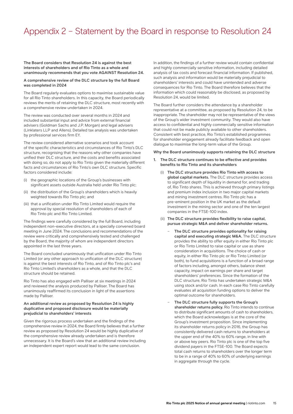 Appendix 2 – Statement by the Board in response to Resolution 24 The Board considers that Resolution 24 is against the best interests of shareholders and of Rio Tinto as a whole and unanimously recommends that you vote AGAINST Resolution 24. A comprehensive review of the DLC structure by the full Board was completed in 2024 The Board regularly evaluates options to maximise sustainable value for all Rio Tinto shareholders. In this capacity, the Board periodically reviews the merits of retaining the DLC structure, most recently with a comprehensive review undertaken in 2024. The review was conducted over several months in 2024 and included substantial input and advice from external financial advisers (Goldman Sachs and J.P. Morgan) and legal advisers (Linklaters LLP and Allens). Detailed tax analysis was undertaken by professional services firm EY. The review considered alternative scenarios and took account of the specific characteristics and circumstances of Rio Tinto’s DLC structure, recognising that the reasons why other companies have unified their DLC structure, and the costs and benefits associated with doing so, do not apply to Rio Tinto given the materially different facts and circumstances of Rio Tinto’s own DLC structure. Specific factors considered include: (i) the geographic locations of the Group’s businesses with significant assets outside Australia held under Rio Tinto plc; (ii) the distribution of the Group’s shareholders which is heavily weighted towards Rio Tinto plc; and (iii) that a unification under Rio Tinto Limited would require the approval by special resolution of shareholders of each of Rio Tinto plc and Rio Tinto Limited. The findings were carefully considered by the full Board, including independent non-executive directors, at a specially convened board meeting in June 2024. The conclusions and recommendations of the review were critically and comprehensively tested and challenged by the Board, the majority of whom are independent directors appointed in the last three years. The Board concluded unanimously that unification under Rio Tinto Limited (or any other approach to unification of the DLC structure) is against the best interests of Rio Tinto, and of Rio Tinto plc’s and Rio Tinto Limited’s shareholders as a whole, and that the DLC structure should be retained. Rio Tinto has also engaged with Palliser at six meetings in 2024 and reviewed the analysis produced by Palliser. The Board has unanimously reaffirmed its conclusion in light of the assertions made by Palliser. An additional review as proposed by Resolution 24 is highly duplicative and proposed disclosure would be materially prejudicial to shareholders’ interests Given the rigorous process undertaken and the findings of the comprehensive review in 2024, the Board firmly believes that a further review as proposed by Resolution 24 would be highly duplicative of the comprehensive review already undertaken and is therefore unnecessary. It is the Board’s view that an additional review including an independent expert report would lead to the same conclusion. In addition, the findings of a further review would contain confidential and highly commercially sensitive information, including detailed analysis of tax costs and forecast financial information. If published, such analysis and information would be materially prejudicial to shareholders’ interests and could have unintended and adverse consequences for Rio Tinto. The Board therefore believes that the information which could reasonably be disclosed, as proposed by Resolution 24, would be limited. The Board further considers the attendance by a shareholder representative at a committee, as proposed by Resolution 24, to be inappropriate. The shareholder may not be representative of the views of the Group’s wider investment community. They would also have access to confidential and highly commercially sensitive information that could not be made publicly available to other shareholders. Consistent with best practice, Rio Tinto’s established programmes for shareholder engagement already facilitate feedback and open dialogue to maximise the long-term value of the Group. Why the Board unanimously supports retaining the DLC structure 1. The DLC structure continues to be effective and provides benefits to Rio Tinto and its shareholders (i) The DLC structure provides Rio Tinto with access to global capital markets. The DLC structure provides access to significant depth of liquidity in demand for, and trading of, Rio Tinto shares. This is achieved through primary listings and premium index inclusion in two major capital markets and mining investment centres. Rio Tinto plc has a pre-eminent position in the UK market as the default investment in the mining sector and one of the ten largest companies in the FTSE-100 index. (ii) The DLC structure provides flexibility to raise capital, pursue strategic M&A and deliver shareholder returns. – The DLC structure provides optionality for raising capital and executing strategic M&A. The DLC structure provides the ability to offer equity in either Rio Tinto plc or Rio Tinto Limited to raise capital or use as share consideration in acquisitions. The choice of cash or equity, in either Rio Tinto plc or Rio Tinto Limited (or both), to fund acquisitions is a function of a broad range of factors including, amongst others, balance sheet capacity, impact on earnings per share and target shareholders’ preferences. Since the formation of the DLC structure, Rio Tinto has undertaken strategic M&A using stock and/or cash. In each case Rio Tinto carefully evaluates all acquisition funding options to deliver the optimal outcome for shareholders. – The DLC structure fully supports the Group’s shareholder returns policy. Rio Tinto intends to continue to distribute significant amounts of cash to shareholders, which the Board acknowledges is at the core of the Group’s investment proposition. Since implementing