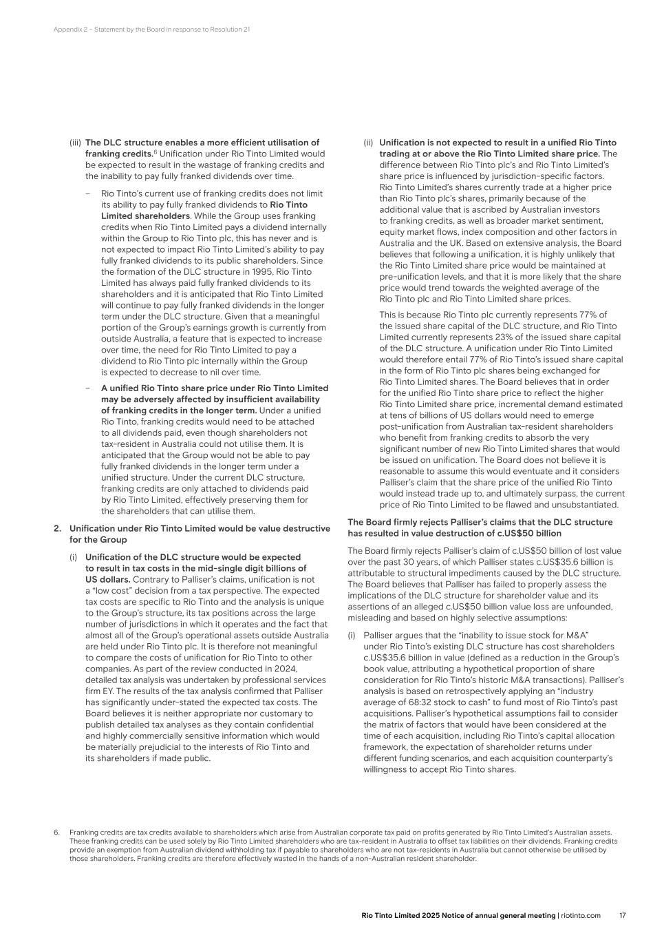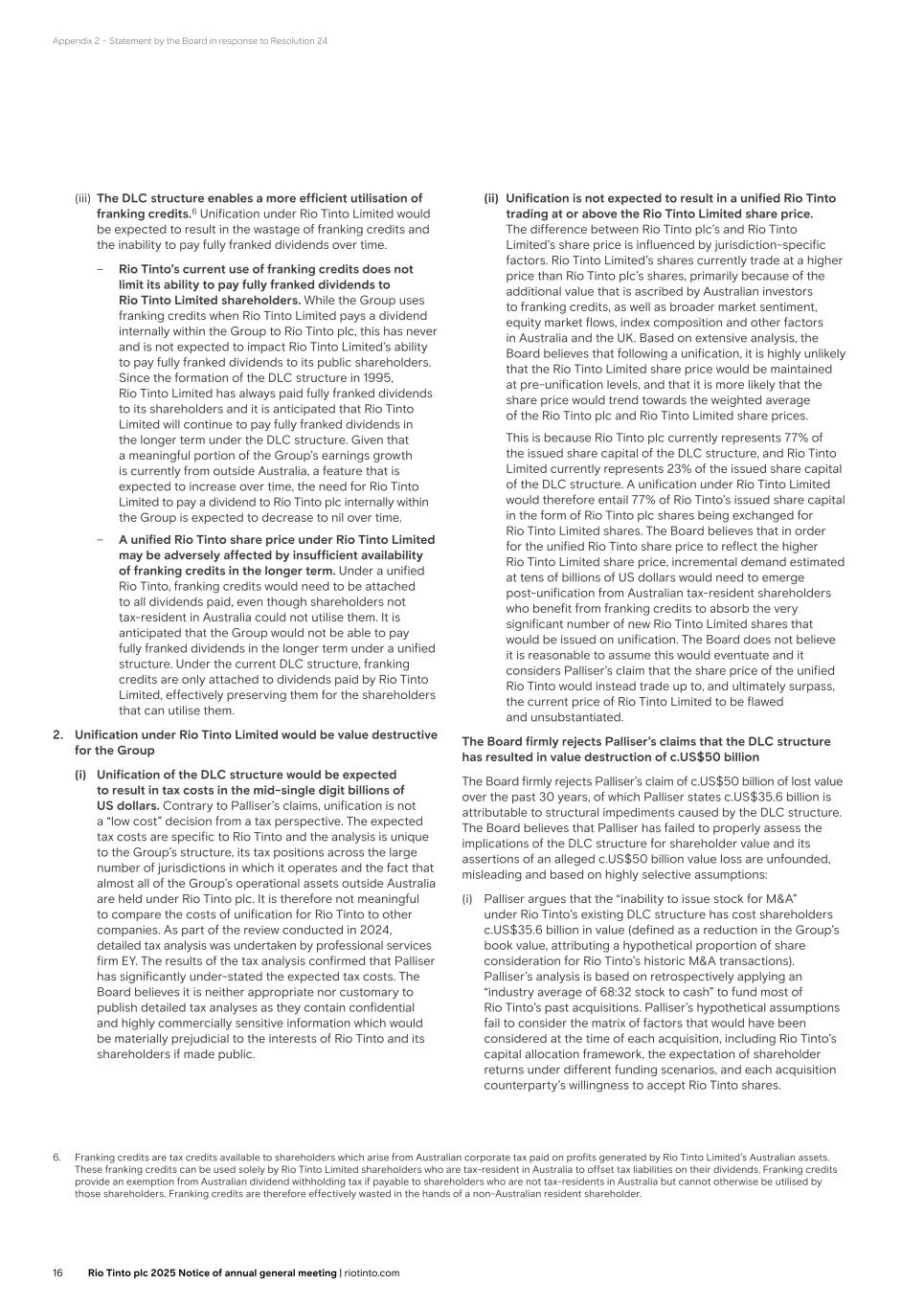 Appendix 2 – Statement by the Board in response to Resolution 24 (iii) The DLC structure enables a more efficient utilisation of franking credits.6 Unification under Rio Tinto Limited would be expected to result in the wastage of franking credits and the inability to pay fully franked dividends over time. – Rio Tinto’s current use of franking credits does not limit its ability to pay fully franked dividends to Rio Tinto Limited shareholders. While the Group uses franking credits when Rio Tinto Limited pays a dividend internally within the Group to Rio Tinto plc, this has never and is not expected to impact Rio Tinto Limited’s ability to pay fully franked dividends to its public shareholders. Since the formation of the DLC structure in 1995, Rio Tinto Limited has always paid fully franked dividends to its shareholders and it is anticipated that Rio Tinto Limited will continue to pay fully franked dividends in the longer term under the DLC structure. Given that a meaningful portion of the Group’s earnings growth is currently from outside Australia, a feature that is expected to increase over time, the need for Rio Tinto Limited to pay a dividend to Rio Tinto plc internally within the Group is expected to decrease to nil over time. – A unified Rio Tinto share price under Rio Tinto Limited may be adversely affected by insufficient availability of franking credits in the longer term. Under a unified Rio Tinto, franking credits would need to be attached to all dividends paid, even though shareholders not tax-resident in Australia could not utilise them. It is anticipated that the Group would not be able to pay fully franked dividends in the longer term under a unified structure. Under the current DLC structure, franking credits are only attached to dividends paid by Rio Tinto Limited, effectively preserving them for the shareholders that can utilise them. 2. Unification under Rio Tinto Limited would be value destructive for the Group (i) Unification of the DLC structure would be expected to result in tax costs in the mid-single digit billions of US dollars. Contrary to Palliser’s claims, unification is not a “low cost” decision from a tax perspective. The expected tax costs are specific to Rio Tinto and the analysis is unique to the Group’s structure, its tax positions across the large number of jurisdictions in which it operates and the fact that almost all of the Group’s operational assets outside Australia are held under Rio Tinto plc. It is therefore not meaningful to compare the costs of unification for Rio Tinto to other companies. As part of the review conducted in 2024, detailed tax analysis was undertaken by professional services firm EY. The results of the tax analysis confirmed that Palliser has significantly under-stated the expected tax costs. The Board believes it is neither appropriate nor customary to publish detailed tax analyses as they contain confidential and highly commercially sensitive information which would be materially prejudicial to the interests of Rio Tinto and its shareholders if made public. 6. Franking credits are tax credits available to shareholders which arise from Australian corporate tax paid on profits generated by Rio Tinto Limited’s Australian assets. These franking credits can be used solely by Rio Tinto Limited shareholders who are tax-resident in Australia to offset tax liabilities on their dividends. Franking credits provide an exemption from Australian dividend withholding tax if payable to shareholders who are not tax-residents in Australia but cannot otherwise be utilised by those shareholders. Franking credits are therefore effectively wasted in the hands of a non-Australian resident shareholder. (ii) Unification is not expected to result in a unified Rio Tinto trading at or above the Rio Tinto Limited share price. The difference between Rio Tinto plc’s and Rio Tinto Limited’s share price is influenced by jurisdiction-specific factors. Rio Tinto Limited’s shares currently trade at a higher price than Rio Tinto plc’s shares, primarily because of the additional value that is ascribed by Australian investors to franking credits, as well as broader market sentiment, equity market flows, index composition and other factors in Australia and the UK. Based on extensive analysis, the Board believes that following a unification, it is highly unlikely that the Rio Tinto Limited share price would be maintained at pre-unification levels, and that it is more likely that the share price would trend towards the weighted average of the Rio Tinto plc and Rio Tinto Limited share prices. This is because Rio Tinto plc currently represents 77% of the issued share capital of the DLC structure, and Rio Tinto Limited currently represents 23% of the issued share capital of the DLC structure. A unification under Rio Tinto Limited would therefore entail 77% of Rio Tinto’s issued share capital in the form of Rio Tinto plc shares being exchanged for Rio Tinto Limited shares. The Board believes that in order for the unified Rio Tinto share price to reflect the higher Rio Tinto Limited share price, incremental demand estimated at tens of billions of US dollars would need to emerge post-unification from Australian tax-resident shareholders who benefit from franking credits to absorb the very significant number of new Rio Tinto Limited shares that would be issued on unification. The Board does not believe it is reasonable to assume this would eventuate and it considers Palliser’s claim that the share price of the unified Rio Tinto would instead trade up to, and ultimately surpass, the current price of Rio Tinto Limited to be flawed and unsubstantiated. The Board firmly rejects Palliser’s claims that the DLC structure has resulted in value destruction of c.US$50 billion The Board firmly rejects Palliser’s claim of c.US$50 billion of lost value over the past 30 years, of which Palliser states c.US$35.6 billion is attributable to structural i