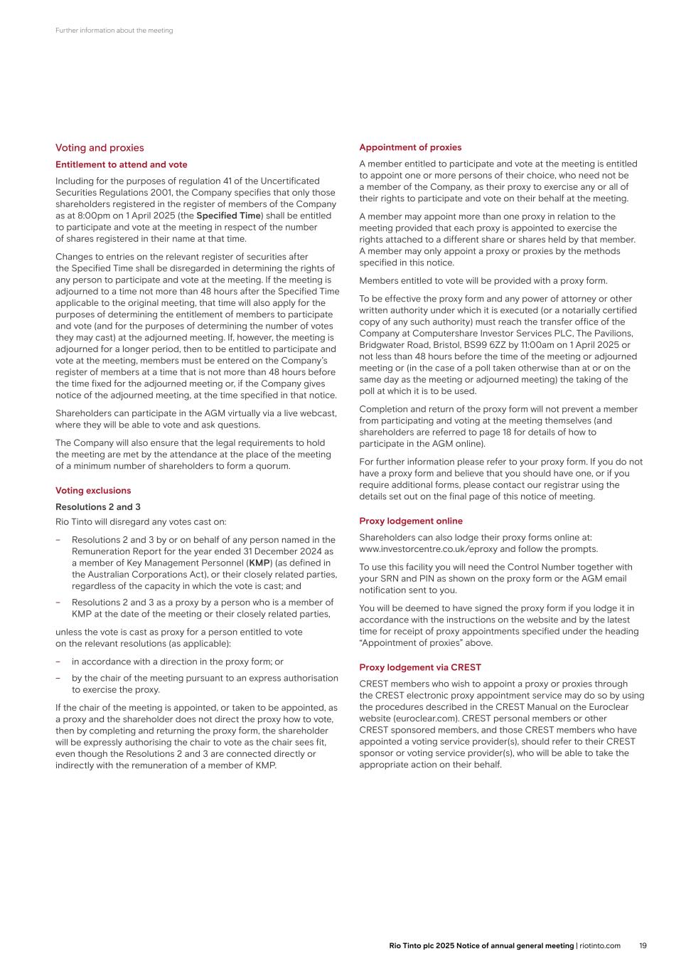 Further information about the meeting Voting and proxies Entitlement to attend and vote Including for the purposes of regulation 41 of the Uncertificated Securities Regulations 2001, the Company specifies that only those shareholders registered in the register of members of the Company as at 8:00pm on 1 April 2025 (the Specified Time) shall be entitled to participate and vote at the meeting in respect of the number of shares registered in their name at that time. Changes to entries on the relevant register of securities after the Specified Time shall be disregarded in determining the rights of any person to participate and vote at the meeting. If the meeting is adjourned to a time not more than 48 hours after the Specified Time applicable to the original meeting, that time will also apply for the purposes of determining the entitlement of members to participate and vote (and for the purposes of determining the number of votes they may cast) at the adjourned meeting. If, however, the meeting is adjourned for a longer period, then to be entitled to participate and vote at the meeting, members must be entered on the Company’s register of members at a time that is not more than 48 hours before the time fixed for the adjourned meeting or, if the Company gives notice of the adjourned meeting, at the time specified in that notice. Shareholders can participate in the AGM virtually via a live webcast, where they will be able to vote and ask questions. The Company will also ensure that the legal requirements to hold the meeting are met by the attendance at the place of the meeting of a minimum number of shareholders to form a quorum. Voting exclusions Resolutions 2 and 3 Rio Tinto will disregard any votes cast on: – Resolutions 2 and 3 by or on behalf of any person named in the Remuneration Report for the year ended 31 December 2024 as a member of Key Management Personnel (KMP) (as defined in the Australian Corporations Act), or their closely related parties, regardless of the capacity in which the vote is cast; and – Resolutions 2 and 3 as a proxy by a person who is a member of KMP at the date of the meeting or their closely related parties, unless the vote is cast as proxy for a person entitled to vote on the relevant resolutions (as applicable): – in accordance with a direction in the proxy form; or – by the chair of the meeting pursuant to an express authorisation to exercise the proxy. If the chair of the meeting is appointed, or taken to be appointed, as a proxy and the shareholder does not direct the proxy how to vote, then by completing and returning the proxy form, the shareholder will be expressly authorising the chair to vote as the chair sees fit, even though the Resolutions 2 and 3 are connected directly or indirectly with the remuneration of a member of KMP. Appointment of proxies A member entitled to participate and vote at the meeting is entitled to appoint one or more persons of their choice, who need not be a member of the Company, as their proxy to exercise any or all of their rights to participate and vote on their behalf at the meeting. A member may appoint more than one proxy in relation to the meeting provided that each proxy is appointed to exercise the rights attached to a different share or shares held by that member. A member may only appoint a proxy or proxies by the methods specified in this notice. Members entitled to vote will be provided with a proxy form. To be effective the proxy form and any power of attorney or other written authority under which it is executed (or a notarially certified copy of any such authority) must reach the transfer office of the Company at Computershare Investor Services PLC, The Pavilions, Bridgwater Road, Bristol, BS99 6ZZ by 11:00am on 1 April 2025 or not less than 48 hours before the time of the meeting or adjourned meeting or (in the case of a poll taken otherwise than at or on the same day as the meeting or adjourned meeting) the taking of the poll at which it is to be used. Completion and return of the proxy form will not prevent a member from participating and voting at the meeting themselves (and shareholders are referred to page 18 for details of how to participate in the AGM online). For further information please refer to your proxy form. If you do not have a proxy form and believe that you should have one, or if you require additional forms, please contact our registrar using the details set out on the final page of this notice of meeting. Proxy lodgement online Shareholders can also lodge their proxy forms online at: www.investorcentre.co.uk/eproxy and follow the prompts. To use this facility you will need the Control Number together with your SRN and PIN as shown on the proxy form or the AGM email notification sent to you. You will be deemed to have signed the proxy form if you lodge it in accordance with the instructions on the website and by the latest time for receipt of proxy appointments specified under the heading “Appointment of proxies” above. Proxy lodgement via CREST CREST members who wish to appoint a proxy or proxies through the CREST electronic proxy appointment service may do so by using the procedures described in the CREST Manual on the Euroclear website (euroclear.com). CREST personal members or other CREST sponsored members, and those CREST members who have appointed a voting service provider(s), should refer to their CREST sponsor or voting service provider(s), who will be able to take the appropriate action on their behalf. 19Rio Tinto plc 2025 Notice of annual general meeting | riotinto.com