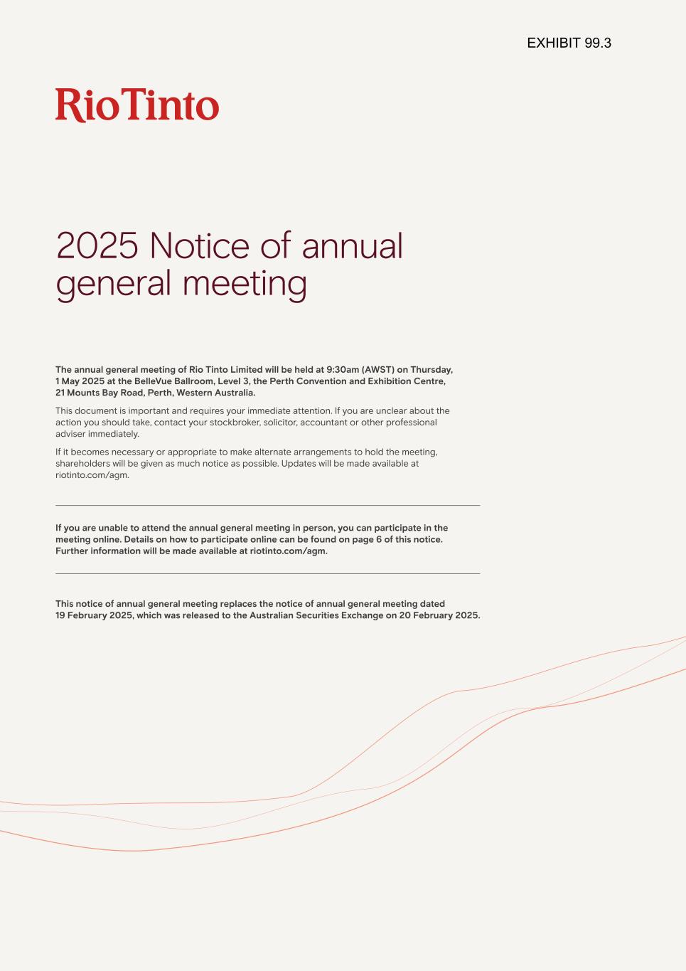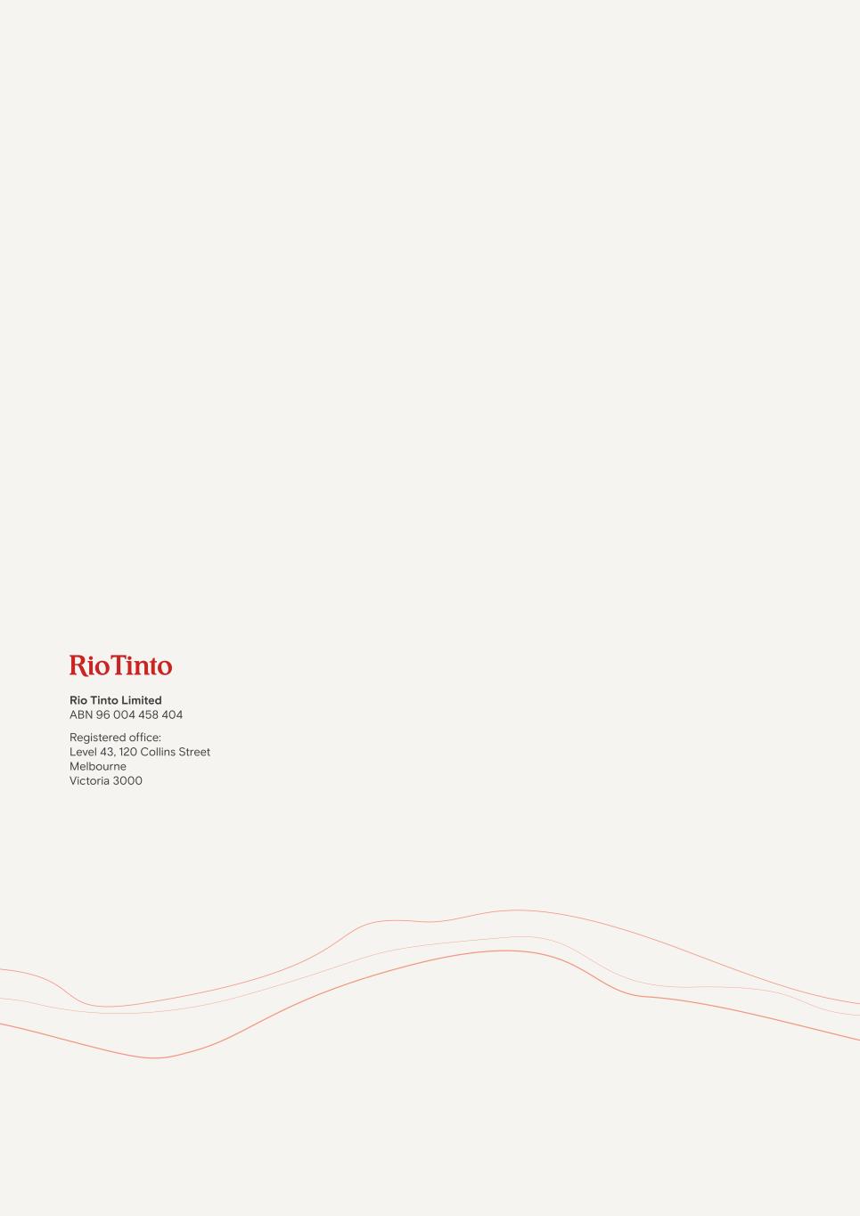 Further information about the meeting Corporate representative and nominated persons right to ask questions Any member, proxy or corporate representative participating in the meeting has the right to ask questions. The Company will answer questions relating to the business being dealt with at the meeting, but may choose not to answer if: (a) to do so would interfere unduly with the preparation for the meeting or involve the disclosure of confidential information; (b) the answer has already been given on a website in the form of an answer to a question; or (c) it is undesirable in the interests of the Company or the good order of the meeting that the question be answered. Guests will not be permitted to ask questions. Website publication of audit concerns Under section 527 of the Companies Act, members meeting the threshold requirements set out in that section have the right to require the Company to publish on a website a statement setting out any matter relating to: (a) the audit of the Company’s accounts (including the Auditors’ report and the conduct of the audit) that are to be laid before the AGM for the financial year ended 31 December 2024; or (b) any circumstance connected with an auditor of the Company ceasing to hold office since the previous meeting at which annual accounts and reports were laid. The Company may not require the shareholders requesting any such website publication to pay its expenses in complying with section 527 or 528 (requirements as to website availability) of the Companies Act. Where the Company is required to place a statement on a website under section 527 of the Companies Act, it must forward the statement to the Company’s auditors not later than the time when it makes the statement available on the website. The business that may be dealt with at the AGM includes any statement that the Company has been required under section 527 of the Companies Act to publish on a website. Documents available for inspection The following documents will be available at the registered office of the Company from the date of this notice until the close of the Rio Tinto Limited AGM on 1 May 2025 (and, also at the place of the meeting from at least 15 minutes prior to and during the meeting until its conclusion): (1) proposed form of contract between Rio Tinto plc and Rio Tinto Limited and/or any of its subsidiaries for the purchase off-market of ordinary shares issued by the Company; and (2) copies of Directors’ service contracts and letters of appointment with Rio Tinto Group companies. Disclaimers Goldman Sachs International, which is authorised by the Prudential Regulation Authority (the PRA) and regulated by the Financial Conduct Authority (the FCA) in the United Kingdom, is acting as financial adviser exclusively for Rio Tinto plc and Rio Tinto Limited and no one else in connection with Rio Tinto’s review of the DLC structure and Resolution 24 and will not be responsible to anyone other than Rio Tinto plc and Rio Tinto Limited for providing the protections afforded to clients of Goldman Sachs International nor for providing advice in connection with Resolution 24 or any other matters referred to in this document. To the extent that Goldman Sachs International is providing financial services in Australia, Goldman Sachs International is exempt from the requirement to hold an Australian financial services licence for the financial services it provides in Australia. Goldman Sachs International is regulated by a foreign regulator under foreign laws which differ from Australian laws, specifically, Goldman Sachs International is authorised by the PRA and regulated by the FCA and the PRA, under UK laws. In providing financial advice to the Board, Goldman Sachs has taken into account the commercial assessments of the Board. J.P. Morgan Securities plc (J.P. Morgan), which is authorised by the PRA and regulated by the PRA and the FCA in the United Kingdom, is acting as financial adviser exclusively for Rio Tinto plc and Rio Tinto Limited and no one else in connection with Rio Tinto’s review of the DLC structure and Resolution 24 and will not be responsible to anyone other than Rio Tinto plc and Rio Tinto Limited for providing the protections afforded to clients of J.P. Morgan nor for providing advice in connection with Resolution 24 or any other matters referred to in this document. In providing financial advice to the Board, J.P. Morgan has taken into account the commercial assessments of the Board. Consents Goldman Sachs International, which has acted as financial adviser to Rio Tinto in connection with Rio Tinto’s review of the DLC structure and Resolution 24, has given and has not withdrawn its written consent to the inclusion of its name in this document in the form and context in which it is included. J.P. Morgan, which has acted as financial adviser to Rio Tinto in connection with Rio Tinto’s review of the DLC structure and Resolution 24, has given and has not withdrawn its written consent to the inclusion of its name in this document in the form and context in which it is included. Linklaters LLP, which has acted as legal adviser to Rio Tinto in connection with Rio Tinto’s review of the DLC structure and Resolution 24, has given and has not withdrawn its written consent to the inclusion of its name in this document in the form and context in which it is included. Allens, which has acted as legal adviser to Rio Tinto in connection with Rio Tinto’s review of the DLC structure and Resolution 24, has given and has not withdrawn its written consent to the inclusion of its name in this document in the form and context in which it is included. EY, which has acted as tax adviser to Rio Tinto in connection with Rio Tinto’s review of the DLC structure and Resolution 24, has given and has not withdrawn its written consent to the inclusion of its name in this document in the form and context in which it is included. 21Rio Tinto plc 2025 Notice of annual general 