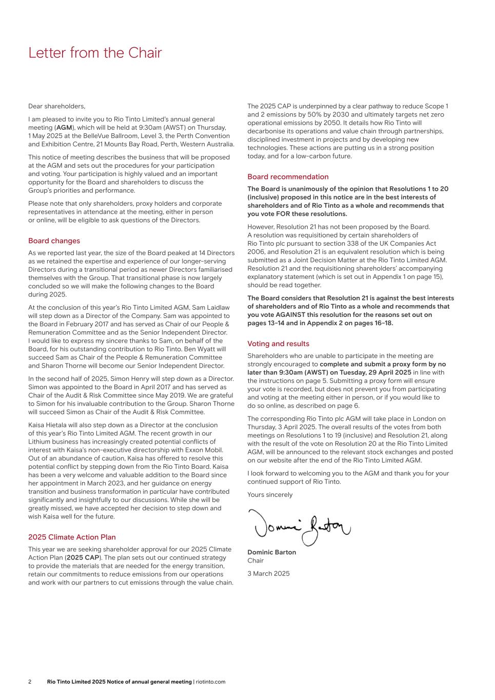 Letter from the Chair Dear shareholders, I am pleased to invite you to Rio Tinto plc’s annual general meeting (AGM), which will be held at 11:00am on Thursday, 3 April 2025 at The Queen Elizabeth II Centre, Broad Sanctuary, Westminster, London SW1P 3EE. This notice of meeting describes the business that will be proposed at the AGM and sets out the procedures for your participation and voting. Your participation is highly valued and an important opportunity for the Rio Tinto’s Board and shareholders to discuss the Group’s priorities and performance. Please note that only shareholders, proxy holders and corporate representatives in attendance at the meeting, either in person or online, will be eligible to ask questions of the Directors. Board changes As we reported last year, the size of the Board peaked at 14 Directors as we retained the expertise and experience of our longer-serving Directors during a transitional period as newer Directors familiarised themselves with the Group. That transitional phase is now largely concluded so we will make the following changes to the Board during 2025. At the conclusion of the Rio Tinto Limited AGM in May 2025, Sam Laidlaw will step down as a Director of the Company. Sam was appointed to the Board in February 2017 and has served as Chair of our People & Remuneration Committee and as the Senior Independent Director. I would like to express my sincere thanks to Sam, on behalf of the Board, for his outstanding contribution to Rio Tinto. Ben Wyatt will succeed Sam as Chair of the People & Remuneration Committee and Sharon Thorne will become our Senior Independent Director. In the second half of 2025, Simon Henry will step down as a Director. Simon was appointed to the Board in April 2017 and has served as Chair of the Audit & Risk Committee since May 2019. We are grateful to Simon for his invaluable contribution to the Group. Sharon Thorne will succeed Simon as Chair of the Audit & Risk Committee. Kaisa Hietala will also step down as a Director at the conclusion of the Rio Tinto Limited AGM in May 2025. The recent growth in our Lithium business has increasingly created potential conflicts of interest with Kaisa’s non-executive directorship with Exxon Mobil. Out of an abundance of caution, Kaisa has offered to resolve this potential conflict by stepping down from the Rio Tinto Board. Kaisa has been a very welcome and valuable addition to the Board since her appointment in March 2023, and her guidance on energy transition and business transformation in particular have contributed significantly and insightfully to our discussions. While she will be greatly missed, we have accepted her decision to step down and wish Kaisa well for the future. 2025 Climate Action Plan This year we are seeking shareholder approval for our 2025 Climate Action Plan (2025 CAP). The plan sets out our continued strategy to provide the materials that are needed for the energy transition, retain our commitments to reduce emissions from our operations, and work with our partners to cut emissions through the value chain. The 2025 CAP is underpinned by a clear pathway to reduce Scope 1 and 2 emissions by 50% by 2030, and ultimately targets net zero operational emissions by 2050. It details how Rio Tinto will decarbonise its operations and value chain through partnerships, disciplined investment in projects, and by developing new technologies. These actions are putting us in a strong position today, and for a low-carbon future. Board recommendation The Board is unanimously of the opinion that Resolutions 1 to 23 (inclusive) proposed in this notice are in the best interests of shareholders and of Rio Tinto as a whole and recommends that you vote FOR these resolutions. However, Resolution 24 has not been proposed by the Board. The resolution was requisitioned by certain shareholders of the Company pursuant to section 338 of the UK Companies Act 2006, and an equivalent resolution is being submitted as a Joint Decision Matter at the Rio Tinto Limited AGM. Resolution 24 and the requisitioning shareholders’ accompanying explanatory statement (which is set out in Appendix 1 on page 14), should be read together. The Board considers that Resolution 24 is against the best interests of shareholders and of Rio Tinto as a whole and recommends that you vote AGAINST this resolution for the reasons set out on pages 12–13 and in Appendix 2 on pages 15-17. Voting and results Shareholders who are unable to participate in the meeting are strongly encouraged to complete and submit a proxy form by no later than 11:00am on Tuesday, 1 April 2025 in line with the instructions on pages 19-20. Submitting a proxy form will ensure your vote is recorded, but does not prevent you from participating and voting at the meeting either in person, or online, as described on page 18. The corresponding Rio Tinto Limited AGM will take place in Perth on Thursday, 1 May 2025. The result of the votes on Resolutions 1 to 19 (inclusive) and Resolution 24, which are also being proposed to the Rio Tinto Limited AGM, will be determined when the relevant polls are closed at the end of the Rio Tinto Limited meeting. The results of the polls on these resolutions will be announced to the relevant stock exchanges and posted on our website after that date. The result of the polls on Resolutions 20 to 23 (inclusive), which only apply to Rio Tinto plc, will be released as soon as possible after the Rio Tinto plc AGM. I look forward to welcoming you to the AGM and thank you for your continued support of Rio Tinto. Yours sincerely Dominic Barton Chair 3 March 2025 2 Rio Tinto plc 2025 Notice of annual general meeting | riotinto.com