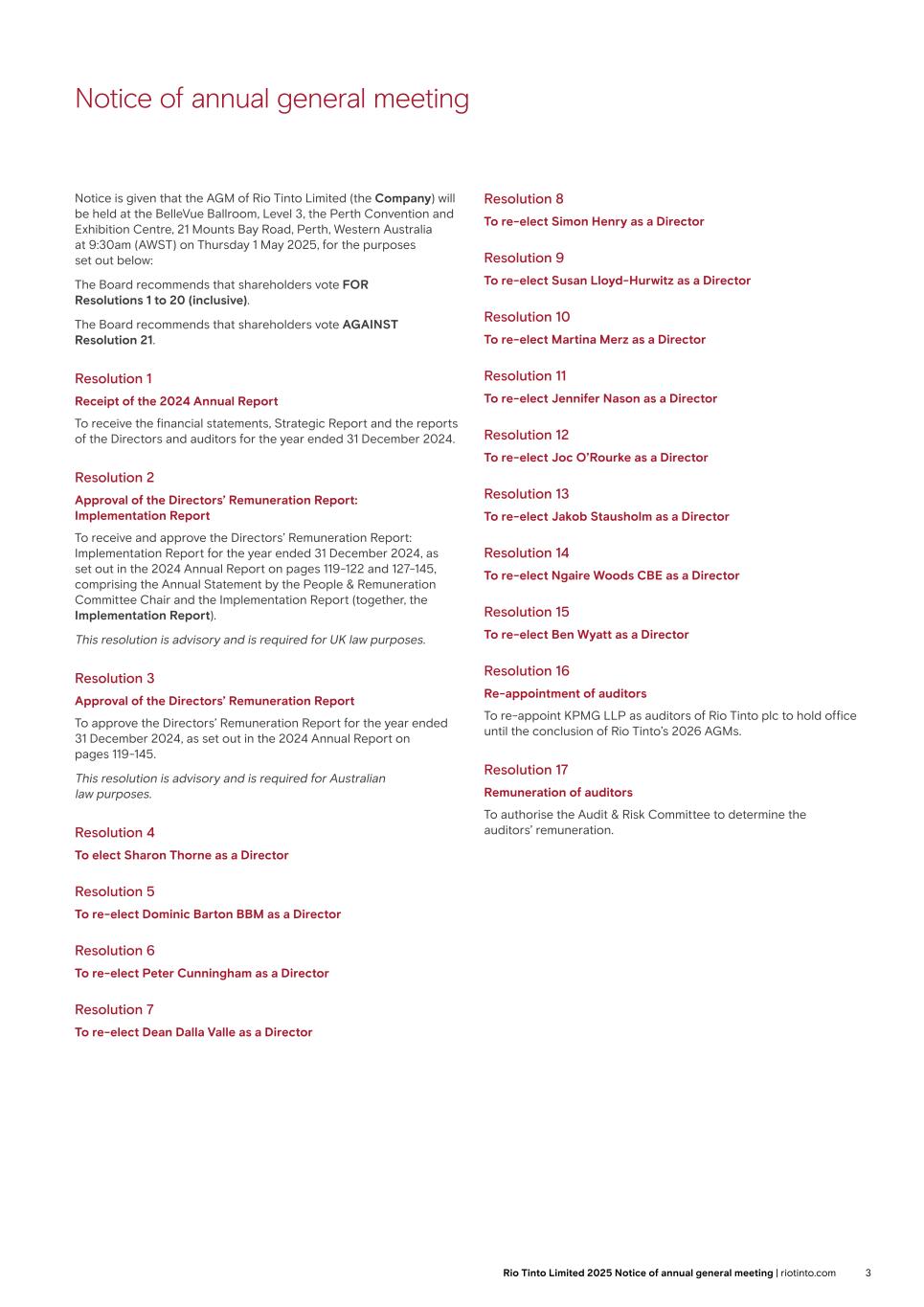 Notice of annual general meeting Notice is given that the AGM of Rio Tinto plc (the Company) will be held at The Queen Elizabeth II Centre, Broad Sanctuary, Westminster, London SW1P 3EE at 11:00am on Thursday, 3 April 2025, for the purposes set out below: The Board recommends that shareholders vote FOR Resolutions 1 to 23 (inclusive). The Board recommends that shareholders vote AGAINST Resolution 24. Resolution 1 Receipt of the 2024 Annual Report To receive the financial statements, Strategic Report and the reports of the Directors and auditors for the year ended 31 December 2024. Resolution 2 Approval of the Directors’ Remuneration Report: Implementation Report To receive and approve the Directors’ Remuneration Report: Implementation Report for the year ended 31 December 2024, as set out in the 2024 Annual Report on pages 119-122 and 127-145, comprising the Annual Statement by the People & Remuneration Committee Chair and the Implementation Report (together, the Implementation Report). This resolution is advisory and is required for UK law purposes. Resolution 3 Approval of the Directors’ Remuneration Report To approve the Directors’ Remuneration Report for the year ended 31 December 2024, as set out in the 2024 Annual Report on pages 119-145. This resolution is advisory and is required for Australian law purposes. Resolution 4 To elect Sharon Thorne as a Director Resolution 5 To re-elect Dominic Barton BBM as a Director Resolution 6 To re-elect Peter Cunningham as a Director Resolution 7 To re-elect Dean Dalla Valle as a Director Resolution 8 To re-elect Simon Henry as a Director Resolution 9 To re-elect Susan Lloyd-Hurwitz as a Director Resolution 10 To re-elect Martina Merz as a Director Resolution 11 To re-elect Jennifer Nason as a Director Resolution 12 To re-elect Joc O’Rourke as a Director Resolution 13 To re-elect Jakob Stausholm as a Director Resolution 14 To re-elect Ngaire Woods CBE as a Director Resolution 15 To re-elect Ben Wyatt as a Director Resolution 16 Re-appointment of auditors To re-appoint KPMG LLP as auditors of Rio Tinto plc to hold office until the conclusion of Rio Tinto’s 2026 AGMs. Resolution 17 Remuneration of auditors To authorise the Audit & Risk Committee to determine the auditors’ remuneration. Resolution 18 Authority to make political donations To authorise Rio Tinto plc, and any company which is a subsidiary of Rio Tinto plc at the time this resolution is passed or becomes a subsidiary of Rio Tinto plc at any time during the period for which this resolution has effect, to: (a) make donations to political parties and independent election candidates; (b) make donations to political organisations other than political parties; and (c) incur political expenditure, provided that in each case any such donations or expenditure made by Rio Tinto plc or a subsidiary of Rio Tinto plc shall not exceed £50,000 per company, and that the total amount of all such donations and expenditure made by all companies to which this authority relates shall not exceed £100,000. This authority shall expire at the close of the AGM of Rio Tinto Limited held in 2026 (or, if earlier, at the close of business on 30 June 2026). 3Rio Tinto plc 2025 Notice of annual general meeting | riotinto.com