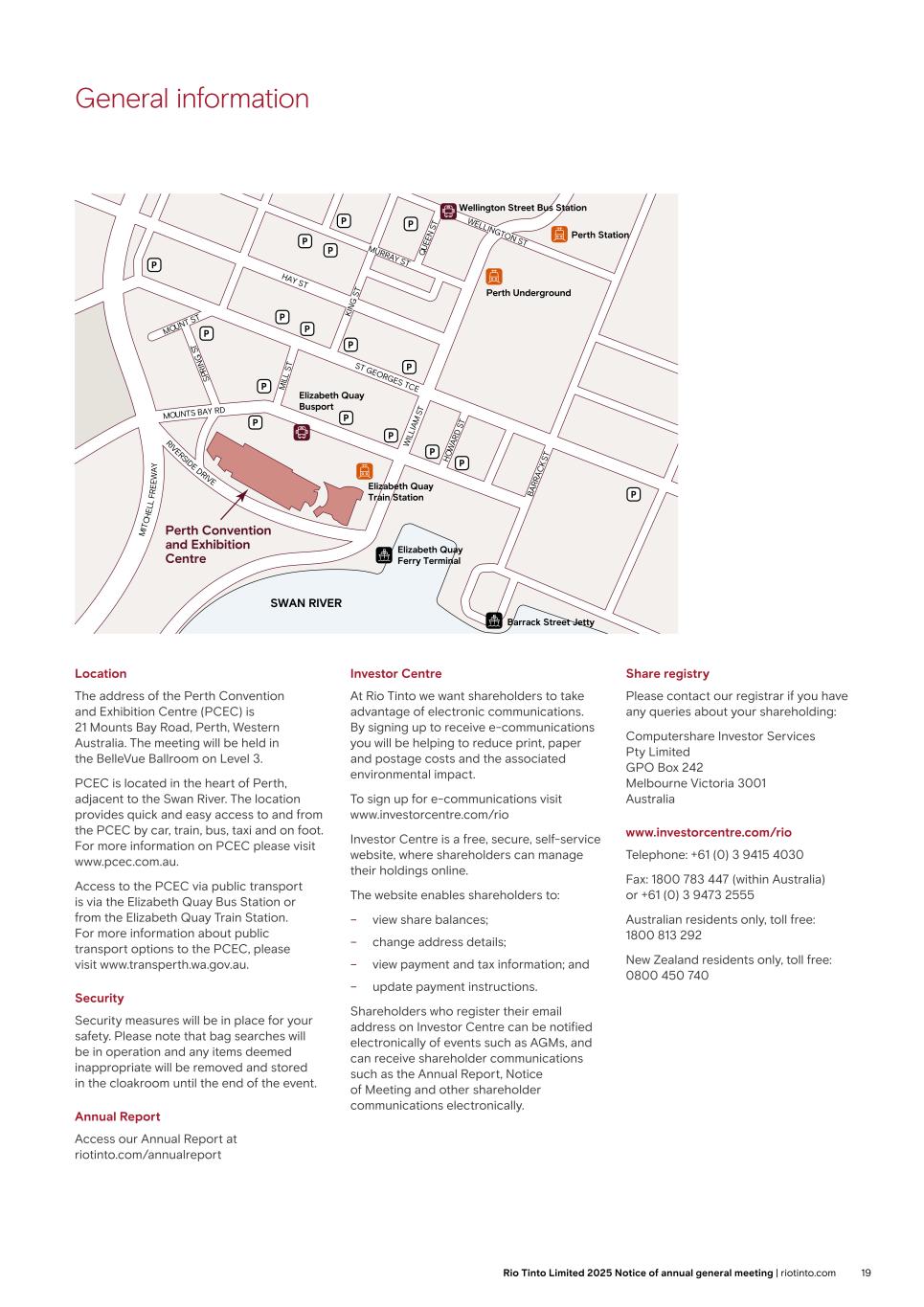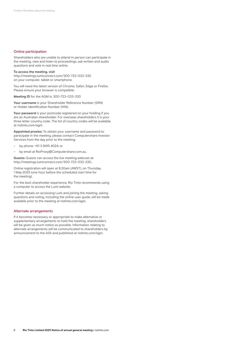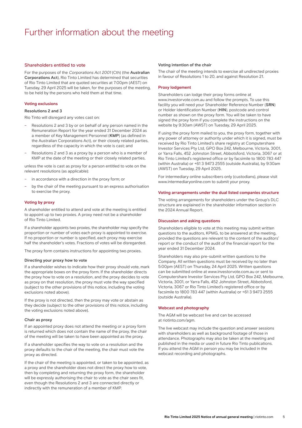 Further information about the meeting Venue information General information Shareholders should note that the doors to the AGM will be open from 10:15am. To facilitate entry into the meeting, shareholders are requested to bring with them the attendance card, which is attached to the proxy form. Proxies and corporate representatives should bring the authority or power of attorney or other written authority (or a notarially certified copy of such authority) under which they have been appointed to attend the meeting. Mobile phones may not be used in the auditorium and cameras or any type of recording device are not allowed in the auditorium. Please refer to the map on page 22 for the location of the AGM. Accessibility The AGM will be held in the Churchill auditorium on the ground floor and refreshments will be available in the Pickwick suite on the first floor. There is a ramp from the forecourt which leads to the front doors and which is wide enough for easy wheelchair access. There are lifts to the first floor, all of which can accommodate wheelchair access and incorporate audio/voice announcements. There are eight accessible toilet facilities throughout the Queen Elizabeth II Centre (the Centre) and all are equipped with emergency alarms. There is no fixed seating, so wheelchair spaces can be positioned anywhere in the meeting room. In addition, all corridors provide for wheelchair access. There are induction loops fitted in the meeting room. Guide dogs, hearing dogs and other assistance dogs are welcome. Disabled delegates arriving at the Centre in a vehicle with a disabled badge displayed will be allowed to park on the forecourt of the building. Taxis and other vehicles will also be allowed on to the forecourt to enable disabled passengers to disembark more easily. Webcast The AGM will be webcast live and will be available at riotinto.com/agm. The live webcast may include the question and answer sessions with shareholders as well as background footage of those in attendance. Photographs may also be taken at the meeting and published in the media or used in future Rio Tinto publications. If you attend the AGM in person you may be included in the webcast recording and photographs. Online participation Shareholders who are unable to attend in person can participate in the meeting, view and listen to proceedings, ask written and audio questions and vote in real time online. To access the meeting: Visit https://web.lumiagm.com/154841853 on your computer, tablet or smartphone. You will need the latest version of Chrome, Safari, Edge or Firefox. Please ensure your browser is compatible. You will be prompted to enter a login which is your: – Shareholder Reference Number (SRN); and – PIN. Your personalised SRN and PIN are printed on your form of proxy. If you are unable to access your SRN and PIN, please contact the Company’s registrar, Computershare Investor Services PLC (Computershare), using the details set out on page 22. Duly appointed proxies and corporate representatives: following receipt of a valid appointment, please contact Computershare before 5:30pm on 1 April 2025 to obtain your SRN and PIN. Guests: Guests can access the live meeting webcast at: https://web.lumiagm.com/154841853. Online registration will open at 8:30am, on Thursday, 3 April 2025 (one hour before the scheduled start time for the meeting). For the best shareholder experience, Rio Tinto recommends using a computer to access the Lumi website. Further details on accessing Lumi and joining the meeting, asking questions and voting, including the online user guide, will be made available prior to the meeting at riotinto.com/agm. Pre-submitted questions Shareholders may pre-submit written questions to the Company. All written questions must be submitted via email to RTPAGMquestions@riotinto.com and must be received by no later than 5:00pm on Wednesday, 26 March 2025. Total voting rights As at the Latest Practicable Date, the total number of issued ordinary shares in the Company is 1,255,959,591 ordinary shares of 10p each, each with one vote. 2,907,902 ordinary shares of 10p each are held in treasury. These shares are not taken into consideration in relation to the payment of dividends and voting at shareholder meetings. Accordingly the total number of voting rights in Rio Tinto plc is 1,253,051,689, which is used to calculate the approval thresholds for sole decision matters. The voting arrangements for shareholders under the Group’s DLC structure, including in respect of Joint Decision Matters, are explained in the shareholder information section of the 2024 Annual Report. 18 Rio Tinto plc 2025 Notice of annual general meeting | riotinto.com