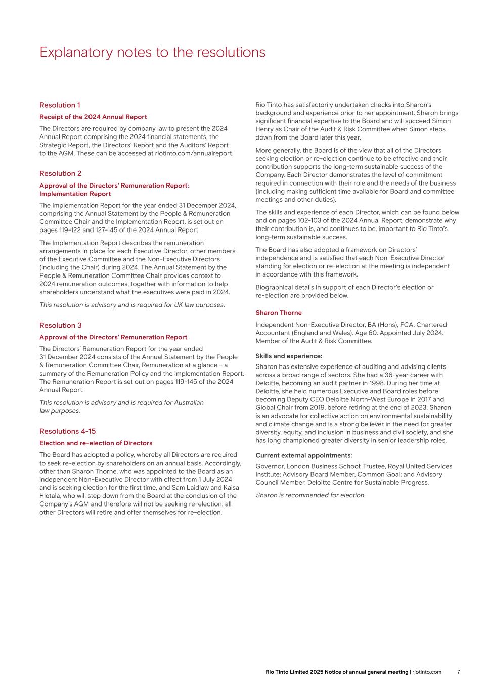 Explanatory notes to the resolutions Resolution 1 Receipt of the 2024 Annual Report The Directors are required by company law to present the 2024 Annual Report comprising the 2024 financial statements, the Strategic Report, the Directors’ Report and the Auditors’ Report to the AGM. These can be accessed at riotinto.com/annualreport. Resolution 2 Approval of the Directors’ Remuneration Report: Implementation Report The Implementation Report for the year ended 31 December 2024, comprising the Annual Statement by the People & Remuneration Committee Chair and the Implementation Report, is set out on pages 119-122 and 127-145 of the 2024 Annual Report. The Implementation Report describes the remuneration arrangements in place for each Executive Director, other members of the Executive Committee and the Non-Executive Directors (including the Chair) during 2024. The Annual Statement by the People & Remuneration Committee Chair provides context to 2024 remuneration outcomes, together with information to help shareholders understand what the executives were paid in 2024. This resolution is advisory and is required for UK law purposes. Resolution 3 Approval of the Directors’ Remuneration Report The Directors’ Remuneration Report for the year ended 31 December 2024 consists of the Annual Statement by the People & Remuneration Committee Chair, Remuneration at a glance – a summary of the Remuneration Policy, and the Implementation Report. The Remuneration Report is set out on pages 119-145 of the 2024 Annual Report. This resolution is advisory and is required for Australian law purposes. Resolutions 4-15 Election and re-election of Directors The Board has adopted a policy, whereby all Directors are required to seek re-election by shareholders on an annual basis. Accordingly, other than Sharon Thorne, who was appointed to the Board as an independent Non-Executive Director with effect from 1 July 2024 and is seeking election for the first time, and Sam Laidlaw and Kaisa Hietala, who will step down from the Board at the conclusion of the Rio Tinto Limited AGM on 1 May 2025 and therefore will not be seeking re-election, all other Directors will retire and offer themselves for re-election. Rio Tinto has satisfactorily undertaken checks into Sharon’s background and experience prior to her appointment. Sharon brings significant financial expertise to the Board and will succeed Simon Henry as Chair of the Audit & Risk Committee when Simon steps down from the Board later this year. More generally, the Board is of the view that all of the Directors seeking election or re-election continue to be effective and their contribution supports the long-term sustainable success of the Company. Each Director demonstrates the level of commitment required in connection with their role and the needs of the business (including making sufficient time available for Board and committee meetings and other duties). The skills and experience of each Director, which can be found below and on pages 102-103 of the 2024 Annual Report, demonstrate why their contribution is, and continues to be, important to Rio Tinto’s long-term sustainable success. The Board has also adopted a framework on Directors’ independence and is satisfied that each Non-Executive Director standing for election or re-election at the meeting is independent in accordance with this framework. Biographical details in support of each Director’s election or re-election are provided below. Sharon Thorne Independent Non-Executive Director, BA (Hons), FCA, Chartered Accountant (England and Wales). Age 60. Appointed July 2024. Member of the Audit & Risk Committee. Skills and experience: Sharon has extensive experience of auditing and advising clients across a broad range of sectors. She had a 36-year career with Deloitte, becoming an audit partner in 1998. During her time at Deloitte, she held numerous Executive and Board roles before becoming Deputy CEO Deloitte North-West Europe in 2017 and Global Chair from 2019, before retiring at the end of 2023. Sharon is an advocate for collective action on environmental sustainability and climate change and is a strong believer in the need for greater diversity, equity, and inclusion in business and civil society, and she has long championed greater diversity in senior leadership roles. Current external appointments: Governor, London Business School; Trustee, Royal United Services Institute; Advisory Board Member, Common Goal; and Advisory Council Member, Deloitte Centre for Sustainable Progress. Sharon is recommended for election. 6 Rio Tinto plc 2025 Notice of annual general meeting | riotinto.com