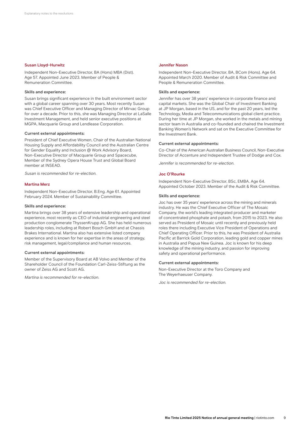 Explanatory notes to the resolutions Susan Lloyd-Hurwitz Independent Non-Executive Director, BA (Hons) MBA (Dist). Age 57. Appointed June 2023. Member of People & Remuneration Committee. Skills and experience: Susan brings significant experience in the built environment sector with a global career spanning over 30 years. Most recently Susan was Chief Executive Officer and Managing Director of Mirvac Group for over a decade. Prior to this, she was Managing Director at LaSalle Investment Management, and held senior executive positions at MGPA, Macquarie Group and Lendlease Corporation. Current external appointments: President of Chief Executive Women, Chair of the Australian National Housing Supply and Affordability Council and the Australian Centre for Gender Equality and Inclusion @ Work Advisory Board, Non-Executive Director of Macquarie Group and Spacecube, Member of the Sydney Opera House Trust and Global Board member at INSEAD. Susan is recommended for re-election. Martina Merz Independent Non-Executive Director, B.Eng. Age 61. Appointed February 2024. Member of Sustainability Committee. Skills and experience: Martina brings over 38 years of extensive leadership and operational experience, most recently as CEO of industrial engineering and steel production conglomerate ThyssenKrupp AG. She has held numerous leadership roles, including at Robert Bosch GmbH and at Chassis Brakes International. Martina also has extensive listed company experience and is known for her expertise in the areas of strategy, risk management, legal/compliance and human resources. Current external appointments: Member of the Supervisory Board at AB Volvo and Member of the Shareholder Council of the Foundation Carl-Zeiss-Stiftung as the owner of Zeiss AG and Scott AG. Martina is recommended for re-election. Jennifer Nason Independent Non-Executive Director, BA, BCom (Hons). Age 64. Appointed March 2020. Member of Audit & Risk Committee and People & Remuneration Committee. Skills and experience: Jennifer has over 38 years’ experience in corporate finance and capital markets. She was the Global Chair of Investment Banking at JP Morgan, based in the US, and for the past 20 years, led the Technology, Media and Telecommunications global client practice. During her time at JP Morgan, she worked in the metals and mining sector team in Australia and co-founded and chaired the Investment Banking Women’s Network and sat on the Executive Committee for the Investment Bank. Current external appointments: Co-Chair of the American Australian Business Council, Non-Executive Director of Accenture and Independent Trustee of Dodge and Cox. Jennifer is recommended for re-election. Joc O’Rourke Independent Non-Executive Director, BSc, EMBA. Age 64. Appointed October 2023. Member of the Audit & Risk Committee. Skills and experience: Joc has over 35 years’ experience across the mining and minerals industry. He was the Chief Executive Officer of The Mosaic Company, the world’s leading integrated producer and marketer of concentrated phosphate and potash, from 2015 to 2023. He also served as President of Mosaic until recently and previously held roles there including Executive Vice President of Operations and Chief Operating Officer. Prior to this, he was President of Australia Pacific at Barrick Gold Corporation, leading gold and copper mines in Australia and Papua New Guinea. Joc is known for his deep knowledge of the mining industry, and passion for improving safety and operational performance. Current external appointments: Non-Executive Director at the Toro Company, and The Weyerhaeuser Company. Joc is recommended for re-election. 8 Rio Tinto plc 2025 Notice of annual general meeting | riotinto.com