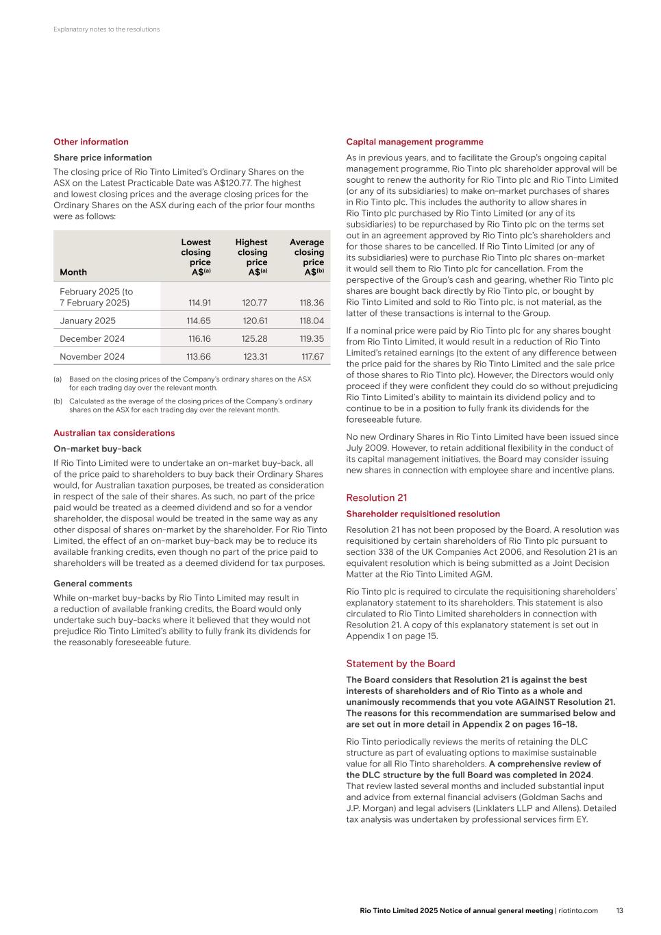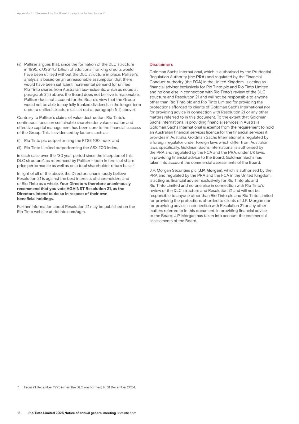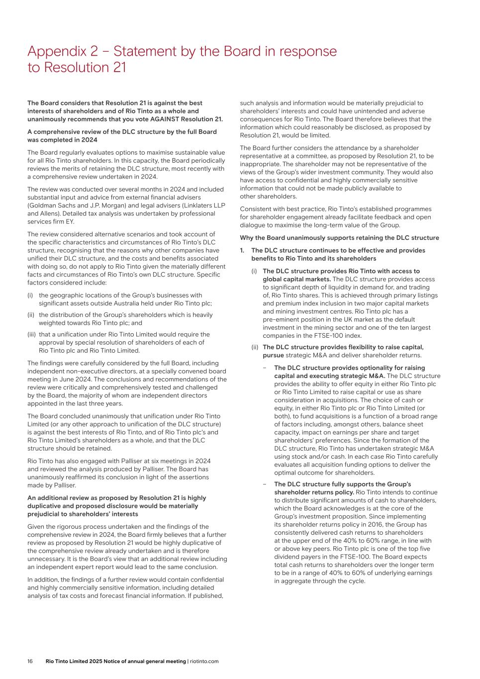 Appendix 2 – Statement by the Board in response to Resolution 24 (ii) Palliser argues that, since the formation of the DLC structure in 1995, c.US$14.7 billion of additional franking credits would have been utilised without the DLC structure in place. Palliser’s analysis is based on an unreasonable assumption that there would have been sufficient incremental demand for unified Rio Tinto shares from Australian tax-residents, which as noted at paragraph 2(ii) above, the Board does not believe is reasonable. Palliser does not account for the Board’s view that the Group would not be able to pay fully franked dividends in the longer term under a unified structure (as set out at paragraph 1(iii) above). Contrary to Palliser’s claims of value destruction, Rio Tinto’s continuous focus on sustainable shareholder value creation and effective capital management has been core to the financial success of the Group. This is evidenced by factors such as: (i) Rio Tinto plc outperforming the FTSE 100 index; and (ii) Rio Tinto Limited outperforming the ASX 200 index, in each case over the “30 year period since the inception of this DLC structure”, as referenced by Palliser – both in terms of share price performance as well as on a total shareholder return basis.7 In light of all of the above, the Directors unanimously believe Resolution 24 is against the best interests of shareholders and of Rio Tinto as a whole. Your Directors therefore unanimously recommend that you vote AGAINST Resolution 24, as the Directors intend to do so in respect of their own beneficial holdings. Further information about Resolution 24 may be published on the Rio Tinto website at riotinto.com/agm. 7. From 21 December 1995 (when the DLC was formed) to 31 December 2024. 17Rio Tinto plc 2025 Notice of annual general meeting | riotinto.com
