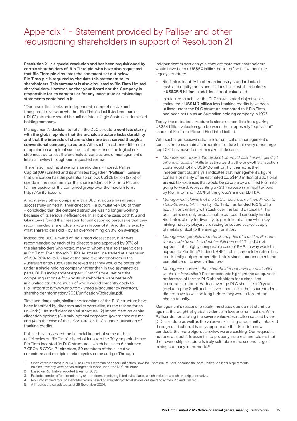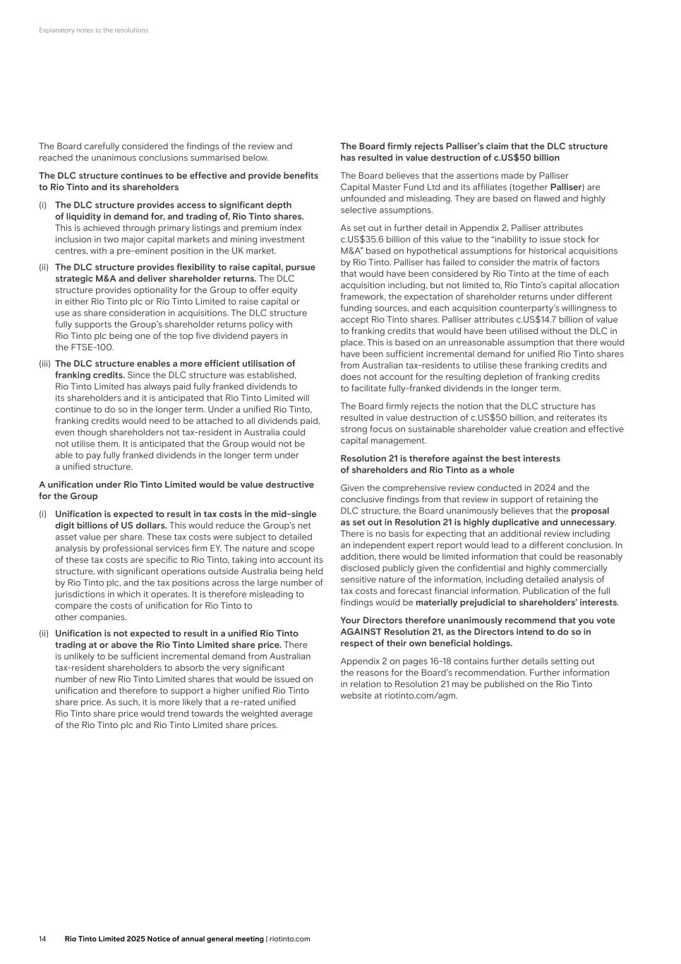 Explanatory notes to the resolutions (ii) The DLC structure provides flexibility to raise capital, pursue strategic M&A and deliver shareholder returns. The DLC structure provides optionality for the Group to offer equity in either Rio Tinto plc or Rio Tinto Limited to raise capital or use as share consideration in acquisitions. The DLC structure fully supports the Group’s shareholder returns policy with Rio Tinto plc being one of the top five dividend payers in the FTSE-100. (iii) The DLC structure enables a more efficient utilisation of franking credits. Since the DLC structure was established, Rio Tinto Limited has always paid fully franked dividends to its shareholders and it is anticipated that Rio Tinto Limited will continue to do so in the longer term. Under a unified Rio Tinto, franking credits would need to be attached to all dividends paid, even though shareholders not tax-resident in Australia could not utilise them. It is anticipated that the Group would not be able to pay fully franked dividends in the longer term under a unified structure. A unification under Rio Tinto Limited would be value destructive for the Group (i) Unification is expected to result in tax costs in the mid-single digit billions of US dollars. This would reduce the Group’s net asset value per share. These tax costs were subject to detailed analysis by professional services firm EY. The nature and scope of these tax costs are specific to Rio Tinto, taking into account its structure, with significant operations outside Australia being held by Rio Tinto plc, and the tax positions across the large number of jurisdictions in which it operates. It is therefore misleading to compare the costs of unification for Rio Tinto to other companies. (ii) Unification is not expected to result in a unified Rio Tinto trading at or above the Rio Tinto Limited share price. There is unlikely to be sufficient incremental demand from Australian tax-resident shareholders to absorb the very significant number of new Rio Tinto Limited shares that would be issued on unification and therefore to support a higher unified Rio Tinto share price. As such, it is more likely that a re-rated unified Rio Tinto share price would trend towards the weighted average of the Rio Tinto plc and Rio Tinto Limited share prices. The Board firmly rejects Palliser’s claim that the DLC structure has resulted in value destruction of c.US$50 billion The Board believes that the assertions made by Palliser Capital Master Fund Ltd and its affiliates (together Palliser) are unfounded and misleading. They are based on flawed and highly selective assumptions. As set out in further detail in Appendix 2, Palliser attributes c.US$35.6 billion of this value to the “inability to issue stock for M&A” based on hypothetical assumptions for historical acquisitions by Rio Tinto. Palliser has failed to consider the matrix of factors that would have been considered by Rio Tinto at the time of each acquisition including, but not limited to, Rio Tinto’s capital allocation framework, the expectation of shareholder returns under different funding sources, and each acquisition counterparty’s willingness to accept Rio Tinto shares. Palliser attributes c.US$14.7 billion of value to franking credits that would have been utilised without the DLC in place. This is based on an unreasonable assumption that there would have been sufficient incremental demand for unified Rio Tinto shares from Australian tax-residents to utilise these franking credits and does not account for the resulting depletion of franking credits to facilitate fully-franked dividends in the longer term. The Board firmly rejects the notion that the DLC structure has resulted in value destruction of c.US$50 billion, and reiterates its strong focus on sustainable shareholder value creation and effective capital management. Resolution 24 is therefore against the best interests of shareholders and Rio Tinto as a whole Given the comprehensive review conducted in 2024 and the conclusive findings from that review in support of retaining the DLC structure, the Board unanimously believes that the proposal as set out in Resolution 24 is highly duplicative and unnecessary. There is no basis for expecting that an additional review including an independent expert report would lead to a different conclusion. In addition, there would be limited information that could be reasonably disclosed publicly given the confidential and highly commercially sensitive nature of the information, including detailed analysis of tax costs and forecast financial information. Publication of the full findings would be materially prejudicial to shareholders’ interests. Your Directors therefore unanimously recommend that you vote AGAINST Resolution 24, as the Directors intend to do so in respect of their own beneficial holdings. Appendix 2 on pages 15-17 contains further details setting out the reasons for the Board’s recommendation. Further information in relation to Resolution 24 may be published on the Rio Tinto website at riotinto.com/agm. 13Rio Tinto plc 2025 Notice of annual general meeting | riotinto.com