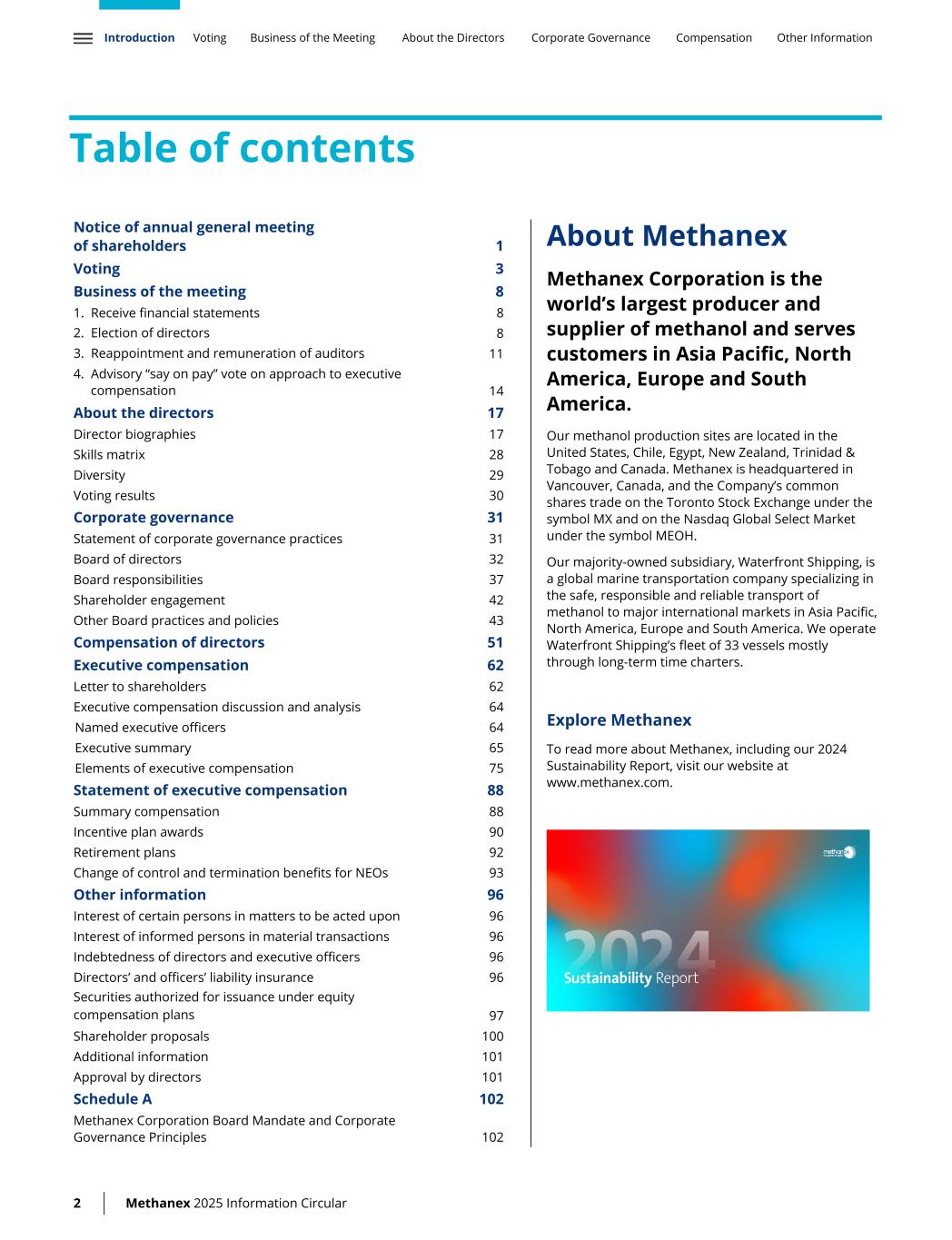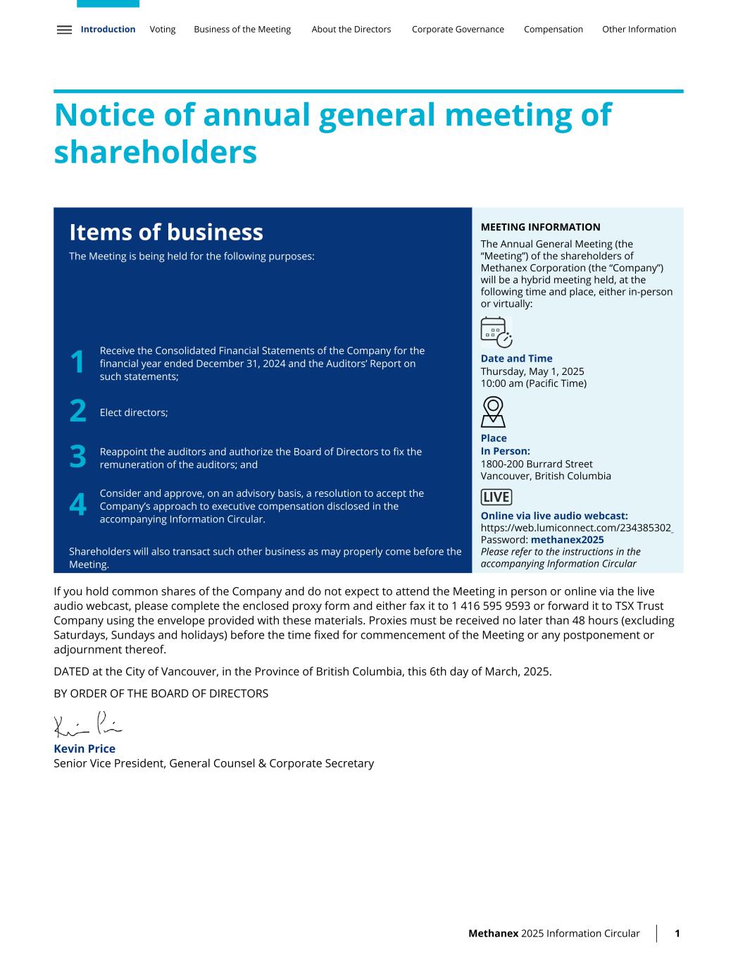 Notice of annual general meeting of shareholders Items of business The Meeting is being held for the following purposes: MEETING INFORMATION The Annual General Meeting (the “Meeting”) of the shareholders of Methanex Corporation (the “Company”) will be a hybrid meeting held, at the following time and place, either in-person or virtually: Date and Time Thursday, May 1, 2025 10:00 am (Pacific Time) Place In Person: 1800-200 Burrard Street Vancouver, British Columbia Online via live audio webcast: https://web.lumiconnect.com/234385302 Password: methanex2025 Please refer to the instructions in the accompanying Information Circular 1 Receive the Consolidated Financial Statements of the Company for the financial year ended December 31, 2024 and the Auditors’ Report on such statements; 2 Elect directors; 3 Reappoint the auditors and authorize the Board of Directors to fix the remuneration of the auditors; and 4 Consider and approve, on an advisory basis, a resolution to accept the Company’s approach to executive compensation disclosed in the accompanying Information Circular. Shareholders will also transact such other business as may properly come before the Meeting. If you hold common shares of the Company and do not expect to attend the Meeting in person or online via the live audio webcast, please complete the enclosed proxy form and either fax it to 1 416 595 9593 or forward it to TSX Trust Company using the envelope provided with these materials. Proxies must be received no later than 48 hours (excluding Saturdays, Sundays and holidays) before the time fixed for commencement of the Meeting or any postponement or adjournment thereof. DATED at the City of Vancouver, in the Province of British Columbia, this 6th day of March, 2025. BY ORDER OF THE BOARD OF DIRECTORS Kevin Price Senior Vice President, General Counsel & Corporate Secretary Introduction Voting Business of the Meeting About the Directors Corporate Governance Compensation Other Information Methanex 2025 Information Circular 1