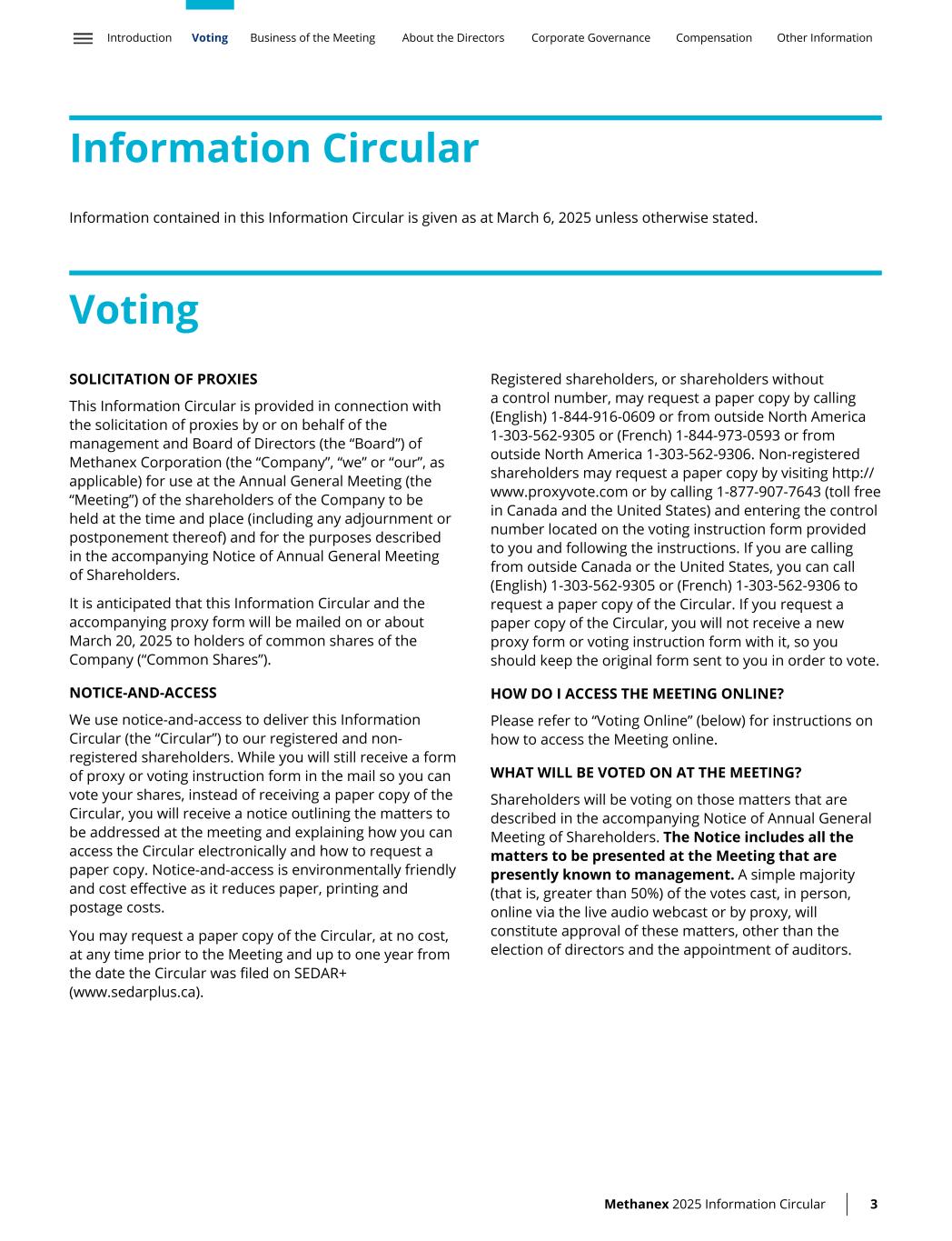 Information Circular Information contained in this Information Circular is given as at March 6, 2025 unless otherwise stated. Voting SOLICITATION OF PROXIES This Information Circular is provided in connection with the solicitation of proxies by or on behalf of the management and Board of Directors (the “Board”) of Methanex Corporation (the “Company”, “we” or “our”, as applicable) for use at the Annual General Meeting (the “Meeting”) of the shareholders of the Company to be held at the time and place (including any adjournment or postponement thereof) and for the purposes described in the accompanying Notice of Annual General Meeting of Shareholders. It is anticipated that this Information Circular and the accompanying proxy form will be mailed on or about March 20, 2025 to holders of common shares of the Company (“Common Shares”). NOTICE-AND-ACCESS We use notice-and-access to deliver this Information Circular (the “Circular”) to our registered and non- registered shareholders. While you will still receive a form of proxy or voting instruction form in the mail so you can vote your shares, instead of receiving a paper copy of the Circular, you will receive a notice outlining the matters to be addressed at the meeting and explaining how you can access the Circular electronically and how to request a paper copy. Notice-and-access is environmentally friendly and cost effective as it reduces paper, printing and postage costs. You may request a paper copy of the Circular, at no cost, at any time prior to the Meeting and up to one year from the date the Circular was filed on SEDAR+ (www.sedarplus.ca). Registered shareholders, or shareholders without a control number, may request a paper copy by calling (English) 1-844-916-0609 or from outside North America 1-303-562-9305 or (French) 1-844-973-0593 or from outside North America 1-303-562-9306. Non-registered shareholders may request a paper copy by visiting http:// www.proxyvote.com or by calling 1-877-907-7643 (toll free in Canada and the United States) and entering the control number located on the voting instruction form provided to you and following the instructions. If you are calling from outside Canada or the United States, you can call (English) 1-303-562-9305 or (French) 1-303-562-9306 to request a paper copy of the Circular. If you request a paper copy of the Circular, you will not receive a new proxy form or voting instruction form with it, so you should keep the original form sent to you in order to vote. HOW DO I ACCESS THE MEETING ONLINE? Please refer to “Voting Online” (below) for instructions on how to access the Meeting online. WHAT WILL BE VOTED ON AT THE MEETING? Shareholders will be voting on those matters that are described in the accompanying Notice of Annual General Meeting of Shareholders. The Notice includes all the matters to be presented at the Meeting that are presently known to management. A simple majority (that is, greater than 50%) of the votes cast, in person, online via the live audio webcast or by proxy, will constitute approval of these matters, other than the election of directors and the appointment of auditors. Introduction Voting Business of the Meeting About the Directors Corporate Governance Compensation Other Information Methanex 2025 Information Circular 3