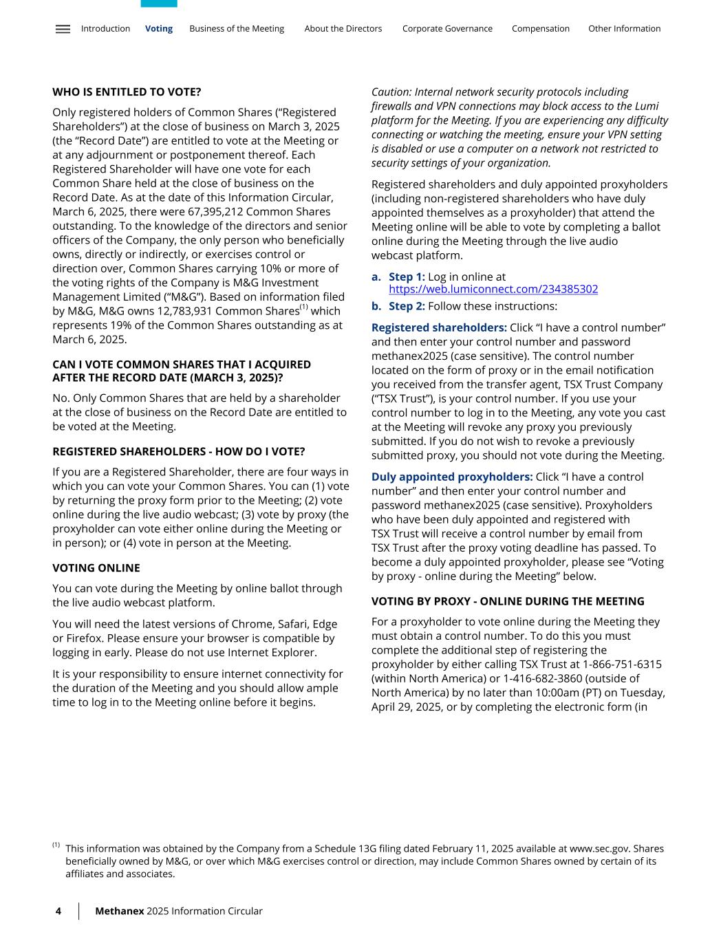 WHO IS ENTITLED TO VOTE? Only registered holders of Common Shares (“Registered Shareholders”) at the close of business on March 3, 2025 (the “Record Date”) are entitled to vote at the Meeting or at any adjournment or postponement thereof. Each Registered Shareholder will have one vote for each Common Share held at the close of business on the Record Date. As at the date of this Information Circular, March 6, 2025, there were 67,395,212 Common Shares outstanding. To the knowledge of the directors and senior officers of the Company, the only person who beneficially owns, directly or indirectly, or exercises control or direction over, Common Shares carrying 10% or more of the voting rights of the Company is M&G Investment Management Limited (“M&G”). Based on information filed by M&G, M&G owns 12,783,931 Common Shares(1) which represents 19% of the Common Shares outstanding as at March 6, 2025. CAN I VOTE COMMON SHARES THAT I ACQUIRED AFTER THE RECORD DATE (MARCH 3, 2025)? No. Only Common Shares that are held by a shareholder at the close of business on the Record Date are entitled to be voted at the Meeting. REGISTERED SHAREHOLDERS - HOW DO I VOTE? If you are a Registered Shareholder, there are four ways in which you can vote your Common Shares. You can (1) vote by returning the proxy form prior to the Meeting; (2) vote online during the live audio webcast; (3) vote by proxy (the proxyholder can vote either online during the Meeting or in person); or (4) vote in person at the Meeting. VOTING ONLINE You can vote during the Meeting by online ballot through the live audio webcast platform. You will need the latest versions of Chrome, Safari, Edge or Firefox. Please ensure your browser is compatible by logging in early. Please do not use Internet Explorer. It is your responsibility to ensure internet connectivity for the duration of the Meeting and you should allow ample time to log in to the Meeting online before it begins. Caution: Internal network security protocols including firewalls and VPN connections may block access to the Lumi platform for the Meeting. If you are experiencing any difficulty connecting or watching the meeting, ensure your VPN setting is disabled or use a computer on a network not restricted to security settings of your organization. Registered shareholders and duly appointed proxyholders (including non-registered shareholders who have duly appointed themselves as a proxyholder) that attend the Meeting online will be able to vote by completing a ballot online during the Meeting through the live audio webcast platform. a. Step 1: Log in online at https://web.lumiconnect.com/234385302 b. Step 2: Follow these instructions: Registered shareholders: Click “I have a control number” and then enter your control number and password methanex2025 (case sensitive). The control number located on the form of proxy or in the email notification you received from the transfer agent, TSX Trust Company (“TSX Trust”), is your control number. If you use your control number to log in to the Meeting, any vote you cast at the Meeting will revoke any proxy you previously submitted. If you do not wish to revoke a previously submitted proxy, you should not vote during the Meeting. Duly appointed proxyholders: Click “I have a control number” and then enter your control number and password methanex2025 (case sensitive). Proxyholders who have been duly appointed and registered with TSX Trust will receive a control number by email from TSX Trust after the proxy voting deadline has passed. To become a duly appointed proxyholder, please see “Voting by proxy - online during the Meeting” below. VOTING BY PROXY - ONLINE DURING THE MEETING For a proxyholder to vote online during the Meeting they must obtain a control number. To do this you must complete the additional step of registering the proxyholder by either calling TSX Trust at 1-866-751-6315 (within North America) or 1-416-682-3860 (outside of North America) by no later than 10:00am (PT) on Tuesday, April 29, 2025, or by completing the electronic form (in (1) This information was obtained by the Company from a Schedule 13G filing dated February 11, 2025 available at www.sec.gov. Shares beneficially owned by M&G, or over which M&G exercises control or direction, may include Common Shares owned by certain of its affiliates and associates. Introduction Voting Business of the Meeting About the Directors Corporate Governance Compensation Other Information 4 Methanex 2025 Information Circular