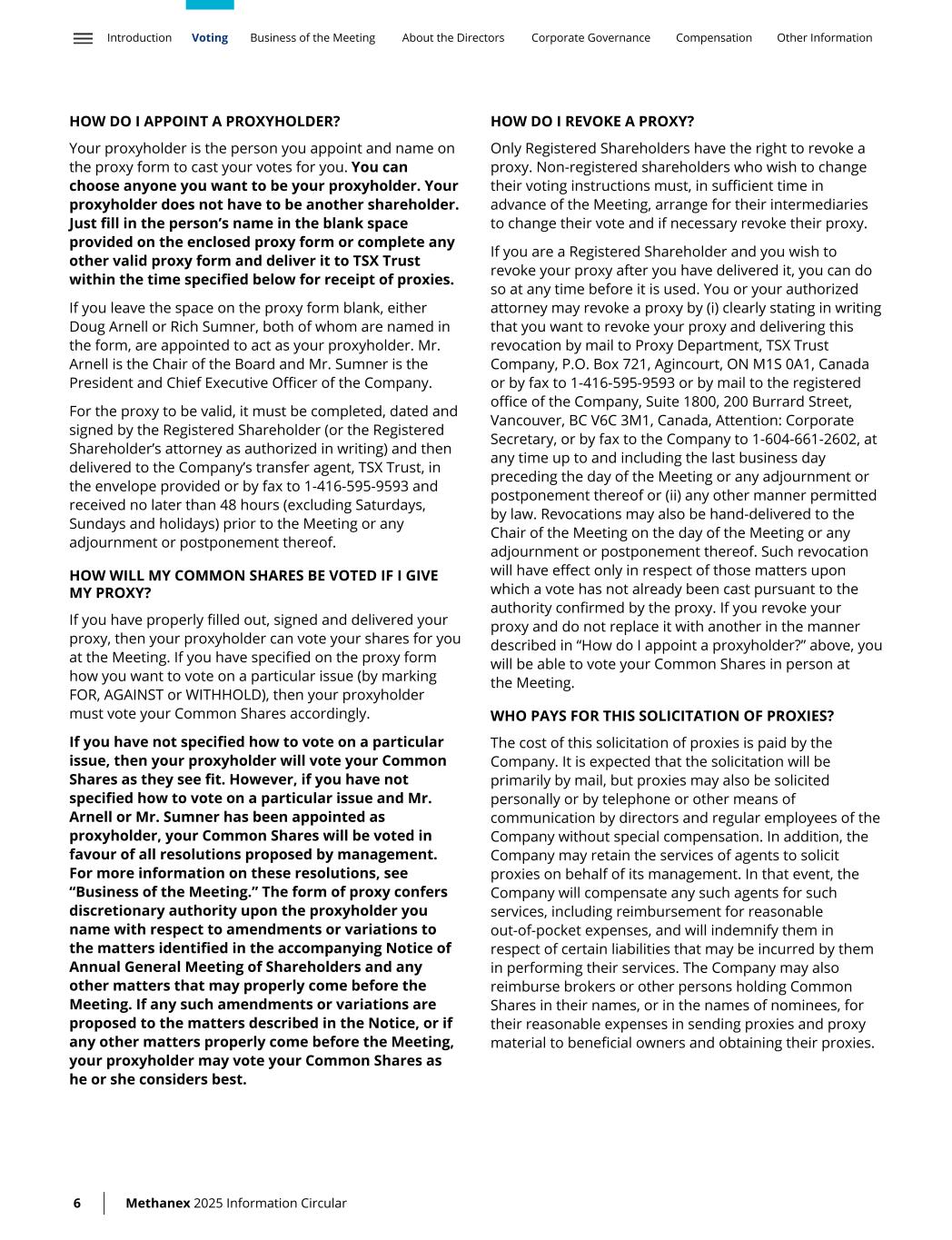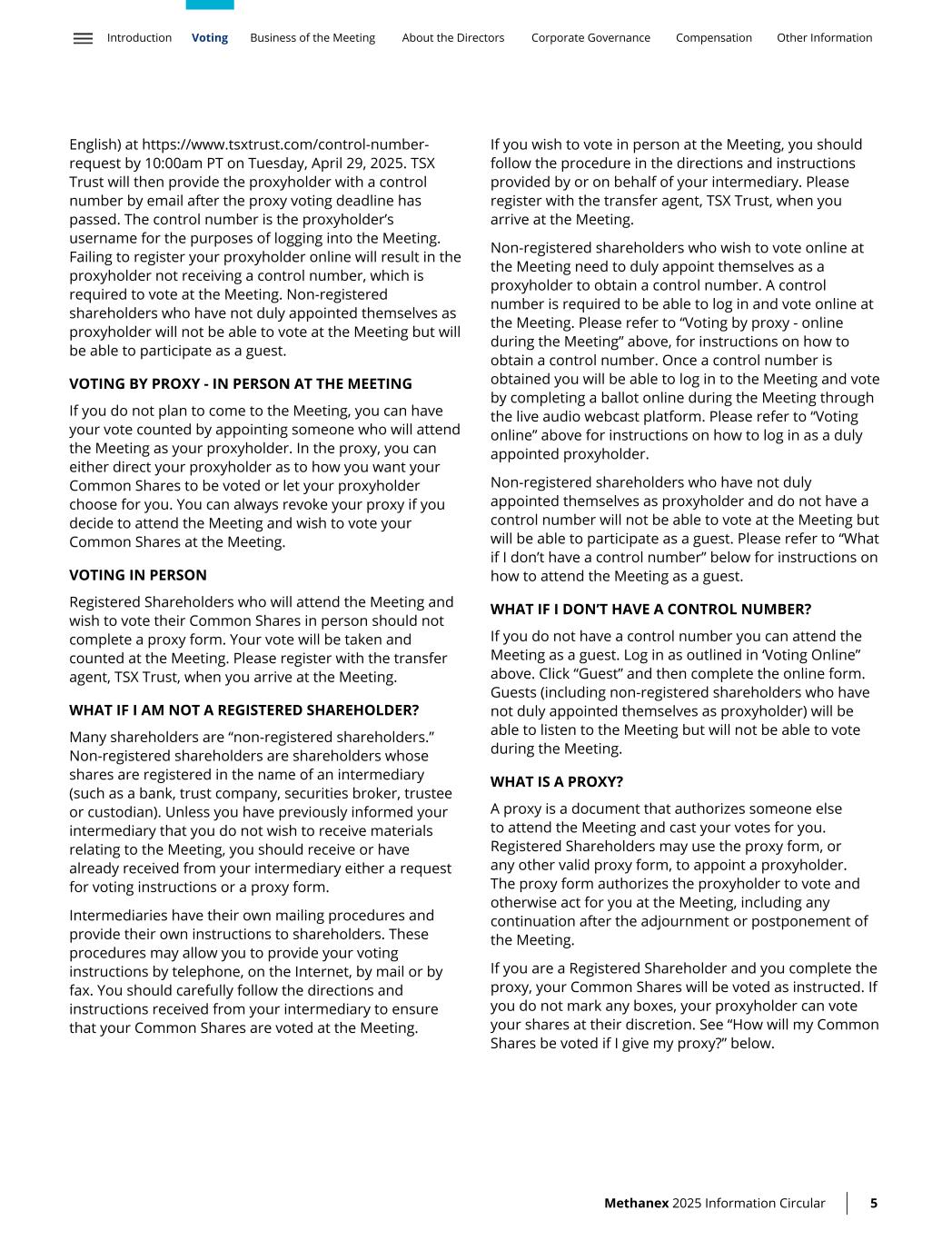 English) at https://www.tsxtrust.com/control-number- request by 10:00am PT on Tuesday, April 29, 2025. TSX Trust will then provide the proxyholder with a control number by email after the proxy voting deadline has passed. The control number is the proxyholder’s username for the purposes of logging into the Meeting. Failing to register your proxyholder online will result in the proxyholder not receiving a control number, which is required to vote at the Meeting. Non-registered shareholders who have not duly appointed themselves as proxyholder will not be able to vote at the Meeting but will be able to participate as a guest. VOTING BY PROXY - IN PERSON AT THE MEETING If you do not plan to come to the Meeting, you can have your vote counted by appointing someone who will attend the Meeting as your proxyholder. In the proxy, you can either direct your proxyholder as to how you want your Common Shares to be voted or let your proxyholder choose for you. You can always revoke your proxy if you decide to attend the Meeting and wish to vote your Common Shares at the Meeting. VOTING IN PERSON Registered Shareholders who will attend the Meeting and wish to vote their Common Shares in person should not complete a proxy form. Your vote will be taken and counted at the Meeting. Please register with the transfer agent, TSX Trust, when you arrive at the Meeting. WHAT IF I AM NOT A REGISTERED SHAREHOLDER? Many shareholders are “non-registered shareholders.” Non-registered shareholders are shareholders whose shares are registered in the name of an intermediary (such as a bank, trust company, securities broker, trustee or custodian). Unless you have previously informed your intermediary that you do not wish to receive materials relating to the Meeting, you should receive or have already received from your intermediary either a request for voting instructions or a proxy form. Intermediaries have their own mailing procedures and provide their own instructions to shareholders. These procedures may allow you to provide your voting instructions by telephone, on the Internet, by mail or by fax. You should carefully follow the directions and instructions received from your intermediary to ensure that your Common Shares are voted at the Meeting. If you wish to vote in person at the Meeting, you should follow the procedure in the directions and instructions provided by or on behalf of your intermediary. Please register with the transfer agent, TSX Trust, when you arrive at the Meeting. Non-registered shareholders who wish to vote online at the Meeting need to duly appoint themselves as a proxyholder to obtain a control number. A control number is required to be able to log in and vote online at the Meeting. Please refer to “Voting by proxy - online during the Meeting” above, for instructions on how to obtain a control number. Once a control number is obtained you will be able to log in to the Meeting and vote by completing a ballot online during the Meeting through the live audio webcast platform. Please refer to “Voting online” above for instructions on how to log in as a duly appointed proxyholder. Non-registered shareholders who have not duly appointed themselves as proxyholder and do not have a control number will not be able to vote at the Meeting but will be able to participate as a guest. Please refer to “What if I don’t have a control number” below for instructions on how to attend the Meeting as a guest. WHAT IF I DON’T HAVE A CONTROL NUMBER? If you do not have a control number you can attend the Meeting as a guest. Log in as outlined in ‘Voting Online” above. Click “Guest” and then complete the online form. Guests (including non-registered shareholders who have not duly appointed themselves as proxyholder) will be able to listen to the Meeting but will not be able to vote during the Meeting. WHAT IS A PROXY? A proxy is a document that authorizes someone else to attend the Meeting and cast your votes for you. Registered Shareholders may use the proxy form, or any other valid proxy form, to appoint a proxyholder. The proxy form authorizes the proxyholder to vote and otherwise act for you at the Meeting, including any continuation after the adjournment or postponement of the Meeting. If you are a Registered Shareholder and you complete the proxy, your Common Shares will be voted as instructed. If you do not mark any boxes, your proxyholder can vote your shares at their discretion. See “How will my Common Shares be voted if I give my proxy?” below. Introduction Voting Business of the Meeting About the Directors Corporate Governance Compensation Other Information Methanex 2025 Information Circular 5