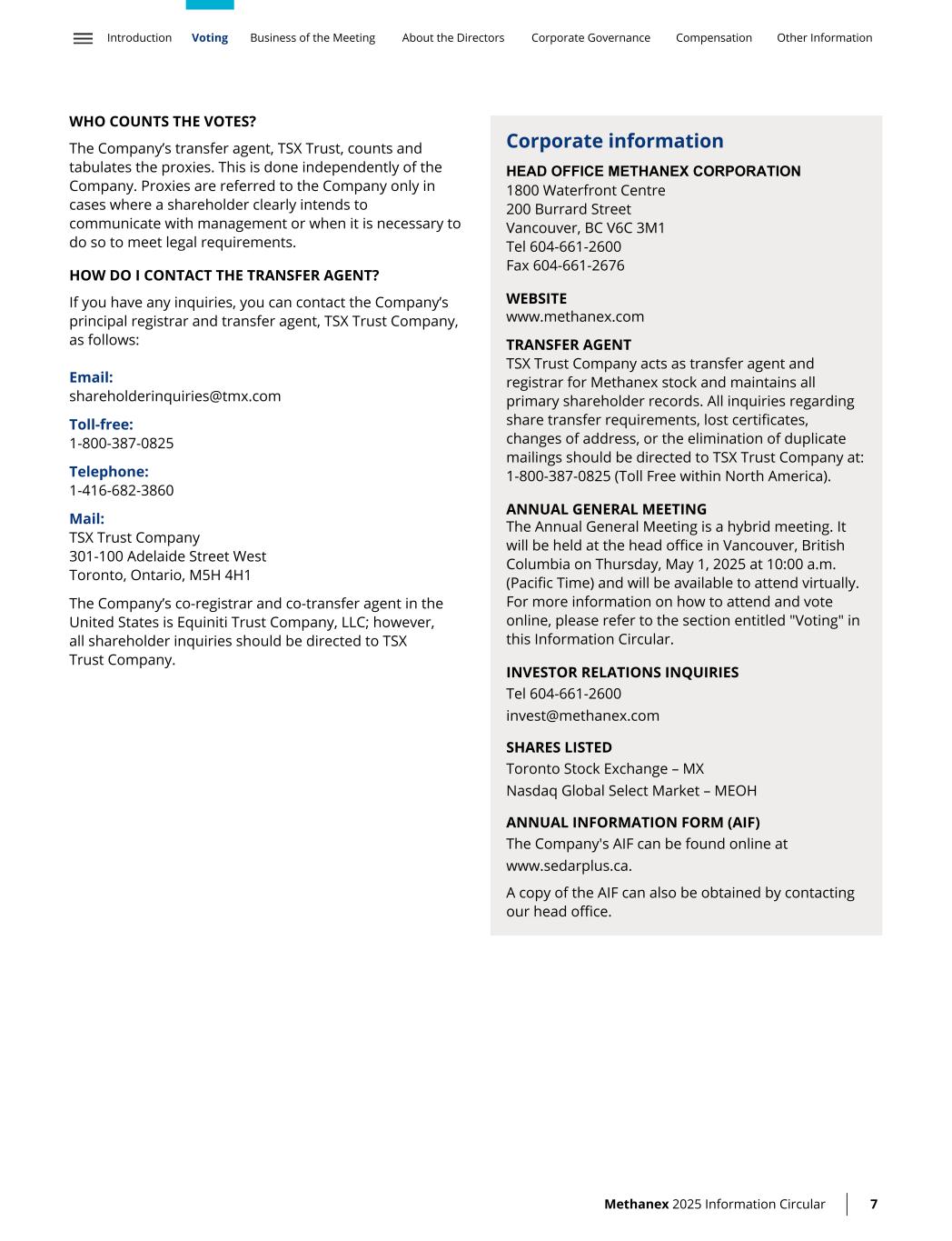 WHO COUNTS THE VOTES? The Company’s transfer agent, TSX Trust, counts and tabulates the proxies. This is done independently of the Company. Proxies are referred to the Company only in cases where a shareholder clearly intends to communicate with management or when it is necessary to do so to meet legal requirements. HOW DO I CONTACT THE TRANSFER AGENT? If you have any inquiries, you can contact the Company’s principal registrar and transfer agent, TSX Trust Company, as follows: Email: shareholderinquiries@tmx.com Toll-free: 1-800-387-0825 Telephone: 1-416-682-3860 Mail: TSX Trust Company 301-100 Adelaide Street West Toronto, Ontario, M5H 4H1 The Company’s co-registrar and co-transfer agent in the United States is Equiniti Trust Company, LLC; however, all shareholder inquiries should be directed to TSX Trust Company. Corporate information HEAD OFFICE METHANEX CORPORATION 1800 Waterfront Centre 200 Burrard Street Vancouver, BC V6C 3M1 Tel 604-661-2600 Fax 604-661-2676 WEBSITE www.methanex.com TRANSFER AGENT TSX Trust Company acts as transfer agent and registrar for Methanex stock and maintains all primary shareholder records. All inquiries regarding share transfer requirements, lost certificates, changes of address, or the elimination of duplicate mailings should be directed to TSX Trust Company at: 1-800-387-0825 (Toll Free within North America). ANNUAL GENERAL MEETING The Annual General Meeting is a hybrid meeting. It will be held at the head office in Vancouver, British Columbia on Thursday, May 1, 2025 at 10:00 a.m. (Pacific Time) and will be available to attend virtually. For more information on how to attend and vote online, please refer to the section entitled "Voting" in this Information Circular. INVESTOR RELATIONS INQUIRIES Tel 604-661-2600 invest@methanex.com SHARES LISTED Toronto Stock Exchange – MX Nasdaq Global Select Market – MEOH ANNUAL INFORMATION FORM (AIF) The Company's AIF can be found online at www.sedarplus.ca. A copy of the AIF can also be obtained by contacting our head office. Introduction Voting Business of the Meeting About the Directors Corporate Governance Compensation Other Information Methanex 2025 Information Circular 7