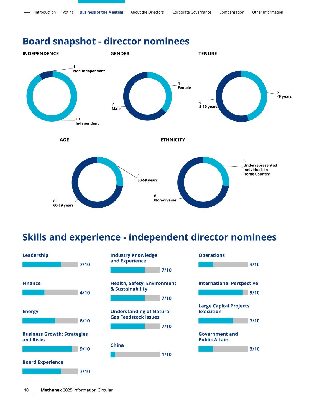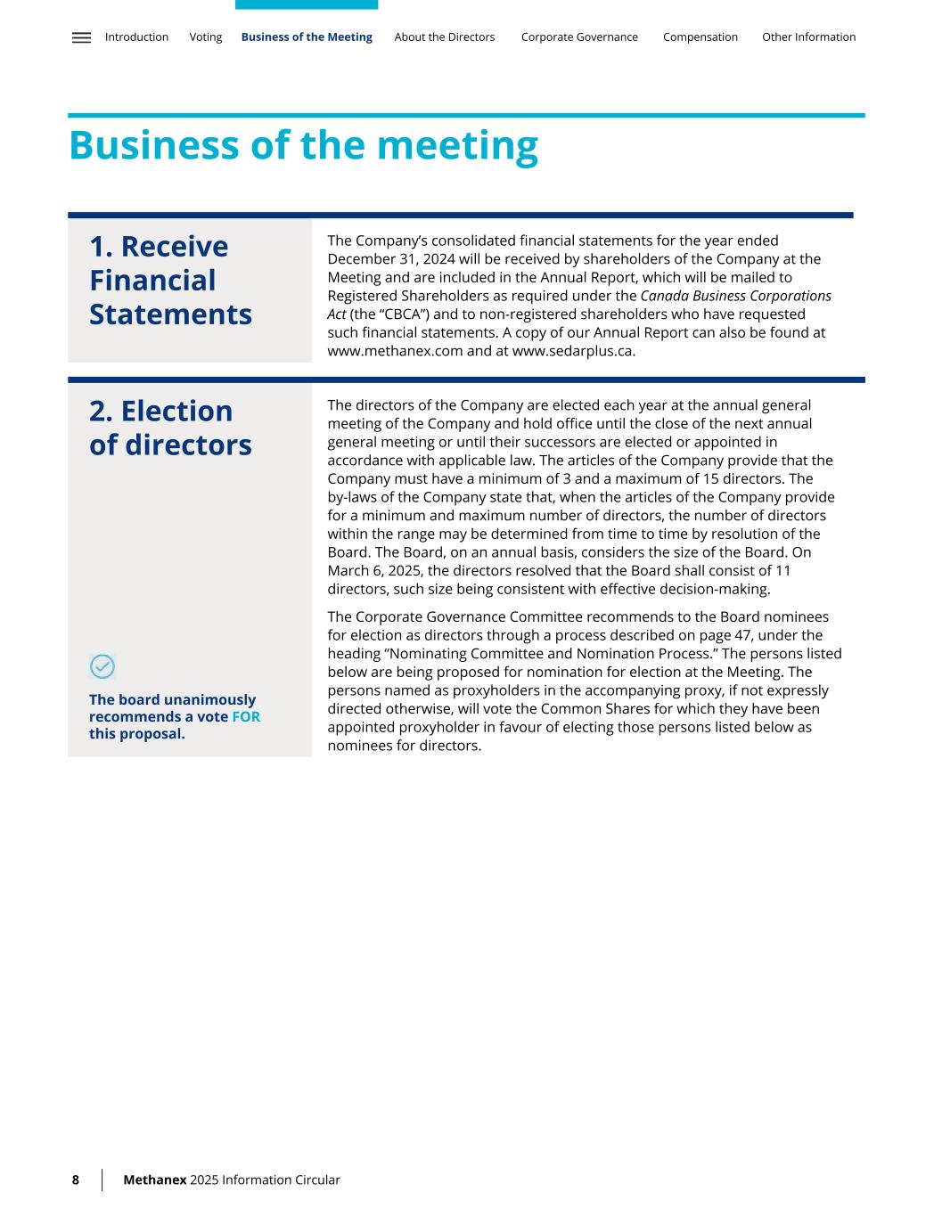 Business of the meeting 1. Receive Financial Statements The Company’s consolidated financial statements for the year ended December 31, 2024 will be received by shareholders of the Company at the Meeting and are included in the Annual Report, which will be mailed to Registered Shareholders as required under the Canada Business Corporations Act (the “CBCA”) and to non-registered shareholders who have requested such financial statements. A copy of our Annual Report can also be found at www.methanex.com and at www.sedarplus.ca. 2. Election of directors The directors of the Company are elected each year at the annual general meeting of the Company and hold office until the close of the next annual general meeting or until their successors are elected or appointed in accordance with applicable law. The articles of the Company provide that the Company must have a minimum of 3 and a maximum of 15 directors. The by-laws of the Company state that, when the articles of the Company provide for a minimum and maximum number of directors, the number of directors within the range may be determined from time to time by resolution of the Board. The Board, on an annual basis, considers the size of the Board. On March 6, 2025, the directors resolved that the Board shall consist of 11 directors, such size being consistent with effective decision-making. The Corporate Governance Committee recommends to the Board nominees for election as directors through a process described on page 47, under the heading “Nominating Committee and Nomination Process.” The persons listed below are being proposed for nomination for election at the Meeting. The persons named as proxyholders in the accompanying proxy, if not expressly directed otherwise, will vote the Common Shares for which they have been appointed proxyholder in favour of electing those persons listed below as nominees for directors. The board unanimously recommends a vote FOR this proposal. Introduction Voting Business of the Meeting About the Directors Corporate Governance Compensation Other Information 8 Methanex 2025 Information Circular
