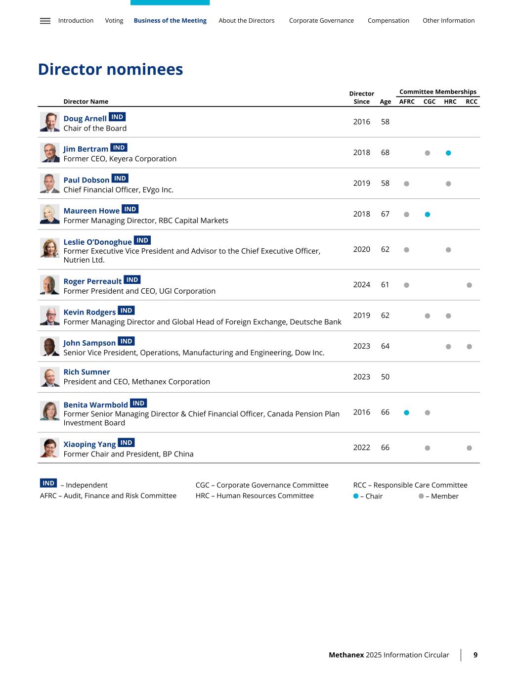Director nominees Director Since Committee Memberships Director Name Age AFRC CGC HRC RCC Doug Arnell Chair of the Board 2016 58 Jim Bertram Former CEO, Keyera Corporation 2018 68 Paul Dobson Chief Financial Officer, EVgo Inc. 2019 58 Maureen Howe Former Managing Director, RBC Capital Markets 2018 67 Leslie O’Donoghue Former Executive Vice President and Advisor to the Chief Executive Officer, Nutrien Ltd. 2020 62 Roger Perreault Former President and CEO, UGI Corporation 2024 61 Kevin Rodgers Former Managing Director and Global Head of Foreign Exchange, Deutsche Bank 2019 62 John Sampson Senior Vice President, Operations, Manufacturing and Engineering, Dow Inc. 2023 64 Rich Sumner President and CEO, Methanex Corporation 2023 50 Benita Warmbold Former Senior Managing Director & Chief Financial Officer, Canada Pension Plan Investment Board 2016 66 Xiaoping Yang Former Chair and President, BP China 2022 66 – Independent CGC – Corporate Governance Committee RCC – Responsible Care Committee AFRC – Audit, Finance and Risk Committee HRC – Human Resources Committee – Chair – Member Introduction Voting Business of the Meeting About the Directors Corporate Governance Compensation Other Information Methanex 2025 Information Circular 9