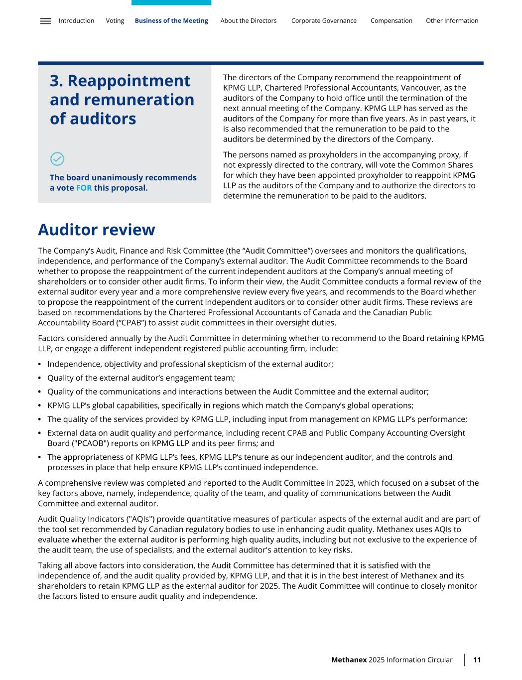 3. Reappointment and remuneration of auditors The directors of the Company recommend the reappointment of KPMG LLP, Chartered Professional Accountants, Vancouver, as the auditors of the Company to hold office until the termination of the next annual meeting of the Company. KPMG LLP has served as the auditors of the Company for more than five years. As in past years, it is also recommended that the remuneration to be paid to the auditors be determined by the directors of the Company. The persons named as proxyholders in the accompanying proxy, if not expressly directed to the contrary, will vote the Common Shares for which they have been appointed proxyholder to reappoint KPMG LLP as the auditors of the Company and to authorize the directors to determine the remuneration to be paid to the auditors. The board unanimously recommends a vote FOR this proposal. Auditor review The Company’s Audit, Finance and Risk Committee (the “Audit Committee”) oversees and monitors the qualifications, independence, and performance of the Company’s external auditor. The Audit Committee recommends to the Board whether to propose the reappointment of the current independent auditors at the Company’s annual meeting of shareholders or to consider other audit firms. To inform their view, the Audit Committee conducts a formal review of the external auditor every year and a more comprehensive review every five years, and recommends to the Board whether to propose the reappointment of the current independent auditors or to consider other audit firms. These reviews are based on recommendations by the Chartered Professional Accountants of Canada and the Canadian Public Accountability Board (“CPAB”) to assist audit committees in their oversight duties. Factors considered annually by the Audit Committee in determining whether to recommend to the Board retaining KPMG LLP, or engage a different independent registered public accounting firm, include: • Independence, objectivity and professional skepticism of the external auditor; • Quality of the external auditor’s engagement team; • Quality of the communications and interactions between the Audit Committee and the external auditor; • KPMG LLP’s global capabilities, specifically in regions which match the Company’s global operations; • The quality of the services provided by KPMG LLP, including input from management on KPMG LLP’s performance; • External data on audit quality and performance, including recent CPAB and Public Company Accounting Oversight Board ("PCAOB") reports on KPMG LLP and its peer firms; and • The appropriateness of KPMG LLP’s fees, KPMG LLP’s tenure as our independent auditor, and the controls and processes in place that help ensure KPMG LLP’s continued independence. A comprehensive review was completed and reported to the Audit Committee in 2023, which focused on a subset of the key factors above, namely, independence, quality of the team, and quality of communications between the Audit Committee and external auditor. Audit Quality Indicators ("AQIs") provide quantitative measures of particular aspects of the external audit and are part of the tool set recommended by Canadian regulatory bodies to use in enhancing audit quality. Methanex uses AQIs to evaluate whether the external auditor is performing high quality audits, including but not exclusive to the experience of the audit team, the use of specialists, and the external auditor's attention to key risks. Taking all above factors into consideration, the Audit Committee has determined that it is satisfied with the independence of, and the audit quality provided by, KPMG LLP, and that it is in the best interest of Methanex and its shareholders to retain KPMG LLP as the external auditor for 2025. The Audit Committee will continue to closely monitor the factors listed to ensure audit quality and independence. Introduction Voting Business of the Meeting About the Directors Corporate Governance Compensation Other Information Methanex 2025 Information Circular 11
