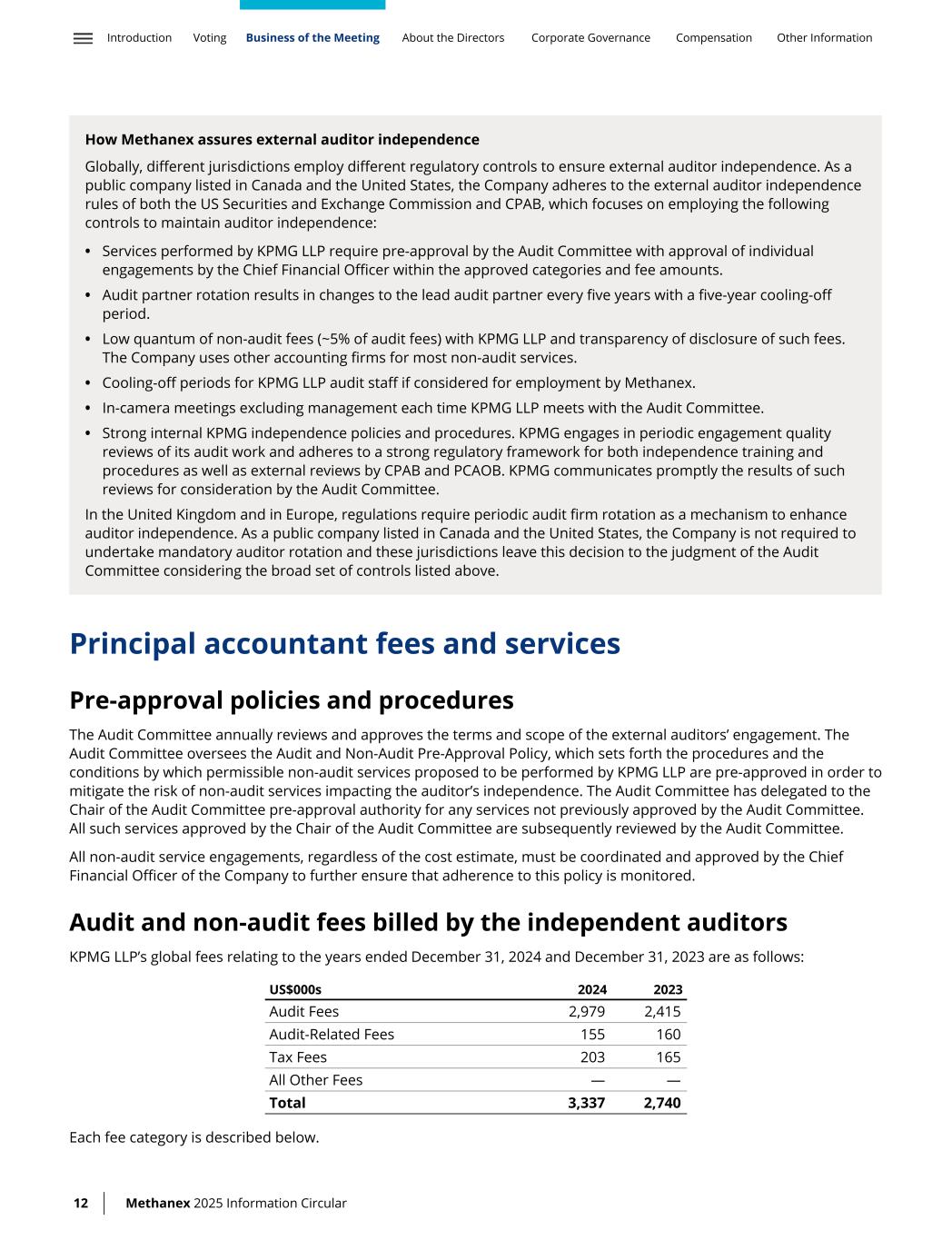 How Methanex assures external auditor independence Globally, different jurisdictions employ different regulatory controls to ensure external auditor independence. As a public company listed in Canada and the United States, the Company adheres to the external auditor independence rules of both the US Securities and Exchange Commission and CPAB, which focuses on employing the following controls to maintain auditor independence: • Services performed by KPMG LLP require pre-approval by the Audit Committee with approval of individual engagements by the Chief Financial Officer within the approved categories and fee amounts. • Audit partner rotation results in changes to the lead audit partner every five years with a five-year cooling-off period. • Low quantum of non-audit fees (~5% of audit fees) with KPMG LLP and transparency of disclosure of such fees. The Company uses other accounting firms for most non-audit services. • Cooling-off periods for KPMG LLP audit staff if considered for employment by Methanex. • In-camera meetings excluding management each time KPMG LLP meets with the Audit Committee. • Strong internal KPMG independence policies and procedures. KPMG engages in periodic engagement quality reviews of its audit work and adheres to a strong regulatory framework for both independence training and procedures as well as external reviews by CPAB and PCAOB. KPMG communicates promptly the results of such reviews for consideration by the Audit Committee. In the United Kingdom and in Europe, regulations require periodic audit firm rotation as a mechanism to enhance auditor independence. As a public company listed in Canada and the United States, the Company is not required to undertake mandatory auditor rotation and these jurisdictions leave this decision to the judgment of the Audit Committee considering the broad set of controls listed above. Principal accountant fees and services Pre-approval policies and procedures The Audit Committee annually reviews and approves the terms and scope of the external auditors’ engagement. The Audit Committee oversees the Audit and Non-Audit Pre-Approval Policy, which sets forth the procedures and the conditions by which permissible non-audit services proposed to be performed by KPMG LLP are pre-approved in order to mitigate the risk of non-audit services impacting the auditor’s independence. The Audit Committee has delegated to the Chair of the Audit Committee pre-approval authority for any services not previously approved by the Audit Committee. All such services approved by the Chair of the Audit Committee are subsequently reviewed by the Audit Committee. All non-audit service engagements, regardless of the cost estimate, must be coordinated and approved by the Chief Financial Officer of the Company to further ensure that adherence to this policy is monitored. Audit and non-audit fees billed by the independent auditors KPMG LLP’s global fees relating to the years ended December 31, 2024 and December 31, 2023 are as follows: US$000s 2024 2023 Audit Fees 2,979 2,415 Audit-Related Fees 155 160 Tax Fees 203 165 All Other Fees — — Total 3,337 2,740 Each fee category is described below. Introduction Voting Business of the Meeting About the Directors Corporate Governance Compensation Other Information 12 Methanex 2025 Information Circular