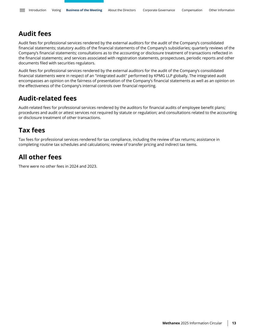Audit fees Audit fees for professional services rendered by the external auditors for the audit of the Company’s consolidated financial statements; statutory audits of the financial statements of the Company’s subsidiaries; quarterly reviews of the Company’s financial statements; consultations as to the accounting or disclosure treatment of transactions reflected in the financial statements; and services associated with registration statements, prospectuses, periodic reports and other documents filed with securities regulators. Audit fees for professional services rendered by the external auditors for the audit of the Company’s consolidated financial statements were in respect of an "integrated audit" performed by KPMG LLP globally. The integrated audit encompasses an opinion on the fairness of presentation of the Company’s financial statements as well as an opinion on the effectiveness of the Company’s internal controls over financial reporting. Audit-related fees Audit-related fees for professional services rendered by the auditors for financial audits of employee benefit plans; procedures and audit or attest services not required by statute or regulation; and consultations related to the accounting or disclosure treatment of other transactions. Tax fees Tax fees for professional services rendered for tax compliance, including the review of tax returns; assistance in completing routine tax schedules and calculations; review of transfer pricing and indirect tax items. All other fees There were no other fees in 2024 and 2023. Introduction Voting Business of the Meeting About the Directors Corporate Governance Compensation Other Information Methanex 2025 Information Circular 13