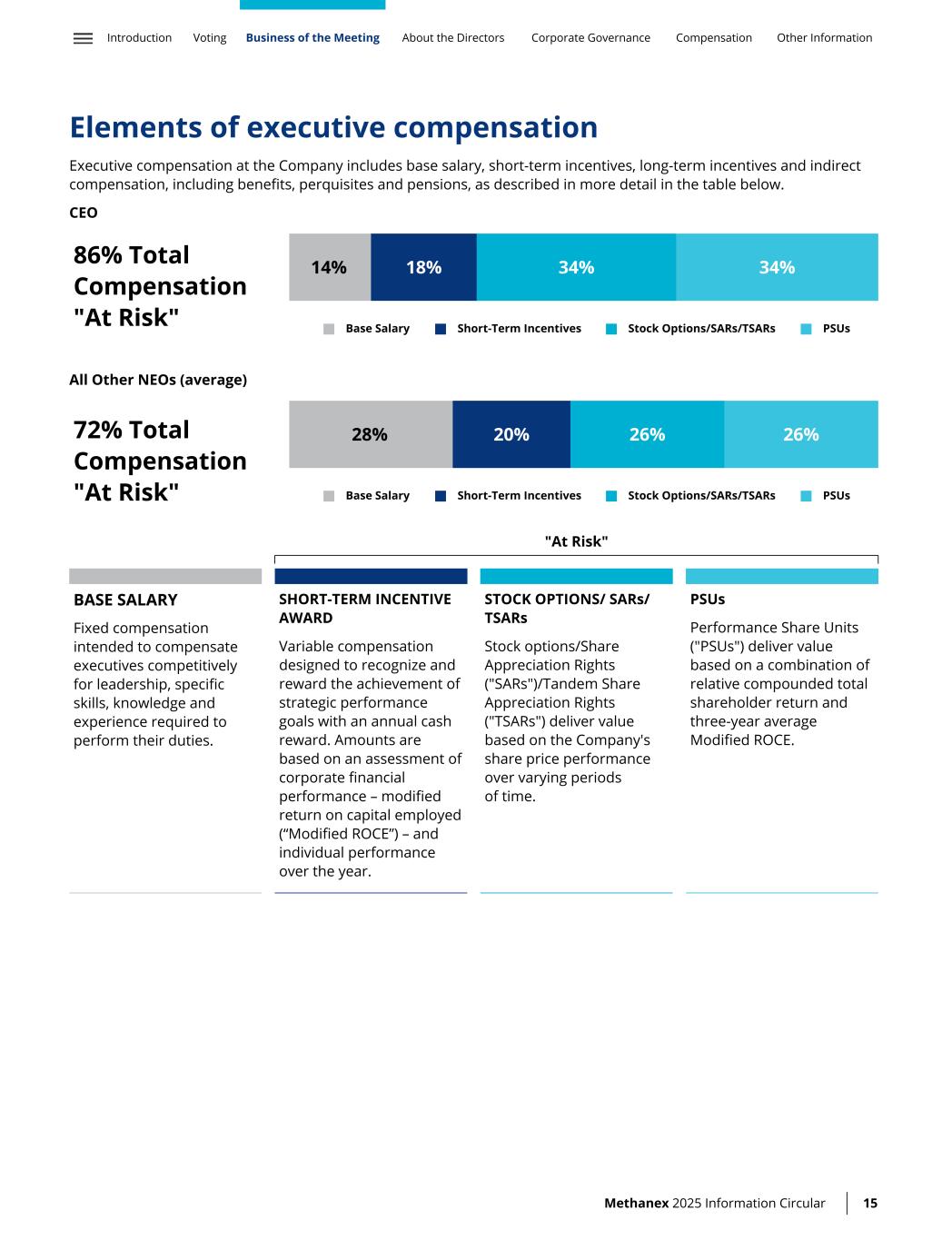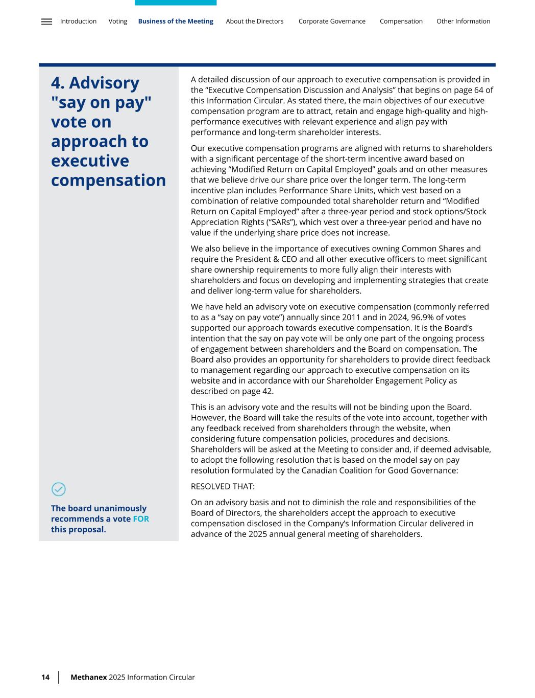 4. Advisory "say on pay" vote on approach to executive compensation A detailed discussion of our approach to executive compensation is provided in the “Executive Compensation Discussion and Analysis” that begins on page 64 of this Information Circular. As stated there, the main objectives of our executive compensation program are to attract, retain and engage high-quality and high- performance executives with relevant experience and align pay with performance and long-term shareholder interests. Our executive compensation programs are aligned with returns to shareholders with a significant percentage of the short-term incentive award based on achieving “Modified Return on Capital Employed” goals and on other measures that we believe drive our share price over the longer term. The long-term incentive plan includes Performance Share Units, which vest based on a combination of relative compounded total shareholder return and “Modified Return on Capital Employed” after a three-year period and stock options/Stock Appreciation Rights (“SARs”), which vest over a three-year period and have no value if the underlying share price does not increase. We also believe in the importance of executives owning Common Shares and require the President & CEO and all other executive officers to meet significant share ownership requirements to more fully align their interests with shareholders and focus on developing and implementing strategies that create and deliver long-term value for shareholders. We have held an advisory vote on executive compensation (commonly referred to as a “say on pay vote”) annually since 2011 and in 2024, 96.9% of votes supported our approach towards executive compensation. It is the Board’s intention that the say on pay vote will be only one part of the ongoing process of engagement between shareholders and the Board on compensation. The Board also provides an opportunity for shareholders to provide direct feedback to management regarding our approach to executive compensation on its website and in accordance with our Shareholder Engagement Policy as described on page 42. This is an advisory vote and the results will not be binding upon the Board. However, the Board will take the results of the vote into account, together with any feedback received from shareholders through the website, when considering future compensation policies, procedures and decisions. Shareholders will be asked at the Meeting to consider and, if deemed advisable, to adopt the following resolution that is based on the model say on pay resolution formulated by the Canadian Coalition for Good Governance: RESOLVED THAT: On an advisory basis and not to diminish the role and responsibilities of the Board of Directors, the shareholders accept the approach to executive compensation disclosed in the Company’s Information Circular delivered in advance of the 2025 annual general meeting of shareholders. The board unanimously recommends a vote FOR this proposal. Introduction Voting Business of the Meeting About the Directors Corporate Governance Compensation Other Information 14 Methanex 2025 Information Circular