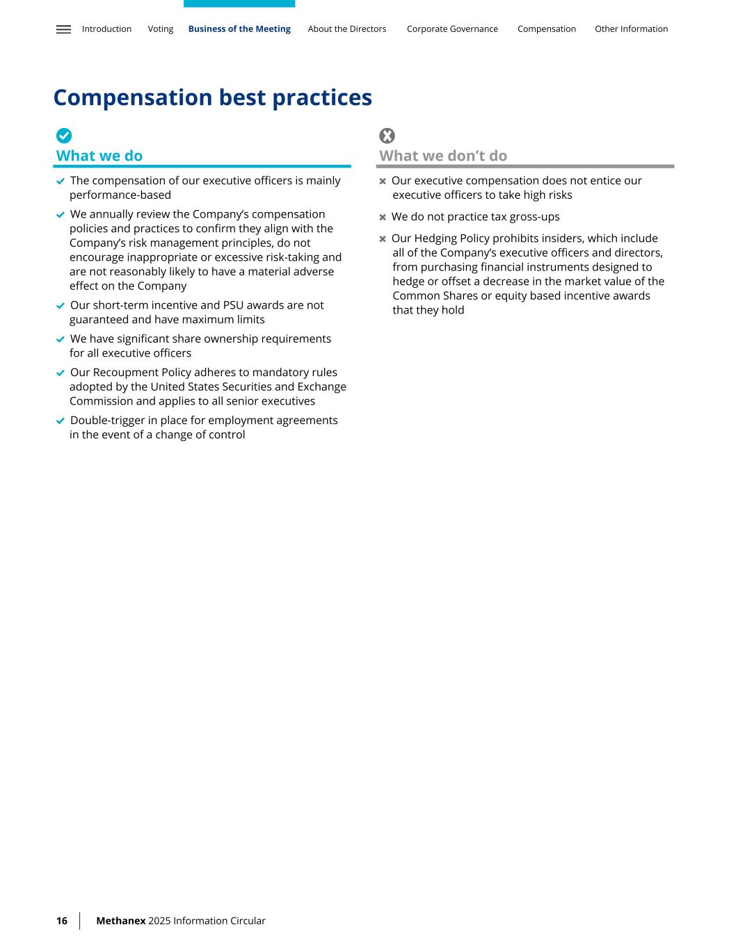 Compensation best practices What we do What we don’t do The compensation of our executive officers is mainly performance-based We annually review the Company’s compensation policies and practices to confirm they align with the Company’s risk management principles, do not encourage inappropriate or excessive risk-taking and are not reasonably likely to have a material adverse effect on the Company Our short-term incentive and PSU awards are not guaranteed and have maximum limits We have significant share ownership requirements for all executive officers Our Recoupment Policy adheres to mandatory rules adopted by the United States Securities and Exchange Commission and applies to all senior executives Double-trigger in place for employment agreements in the event of a change of control Our executive compensation does not entice our executive officers to take high risks We do not practice tax gross-ups Our Hedging Policy prohibits insiders, which include all of the Company’s executive officers and directors, from purchasing financial instruments designed to hedge or offset a decrease in the market value of the Common Shares or equity based incentive awards that they hold Introduction Voting Business of the Meeting About the Directors Corporate Governance Compensation Other Information 16 Methanex 2025 Information Circular