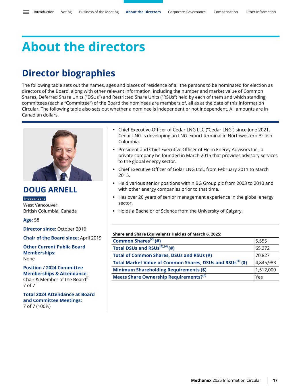 About the directors Director biographies The following table sets out the names, ages and places of residence of all the persons to be nominated for election as directors of the Board, along with other relevant information, including the number and market value of Common Shares, Deferred Share Units (“DSUs”) and Restricted Share Units (“RSUs”) held by each of them and which standing committees (each a “Committee”) of the Board the nominees are members of, all as at the date of this Information Circular. The following table also sets out whether a nominee is independent or not independent. All amounts are in Canadian dollars. DOUG ARNELL West Vancouver, British Columbia, Canada Age: 58 Director since: October 2016 Chair of the Board since: April 2019 Other Current Public Board Memberships: None Position / 2024 Committee Memberships & Attendance: Chair & Member of the Board(1) 7 of 7 Total 2024 Attendance at Board and Committee Meetings: 7 of 7 (100%) • Chief Executive Officer of Cedar LNG LLC (“Cedar LNG”) since June 2021. Cedar LNG is developing an LNG export terminal in Northwestern British Columbia. • President and Chief Executive Officer of Helm Energy Advisors Inc., a private company he founded in March 2015 that provides advisory services to the global energy sector. • Chief Executive Officer of Golar LNG Ltd., from February 2011 to March 2015. • Held various senior positions within BG Group plc from 2003 to 2010 and with other energy companies prior to that time. • Has over 20 years of senior management experience in the global energy sector. • Holds a Bachelor of Science from the University of Calgary. Share and Share Equivalents Held as of March 6, 2025: Common Shares(2) (#) 5,555 Total DSUs and RSUs(3),(4) (#) 65,272 Total of Common Shares, DSUs and RSUs (#) 70,827 Total Market Value of Common Shares, DSUs and RSUs(5) ($) 4,845,983 Minimum Shareholding Requirements ($) 1,512,000 Meets Share Ownership Requirements?(6) Yes Introduction Voting Business of the Meeting About the Directors Corporate Governance Compensation Other Information Methanex 2025 Information Circular 17