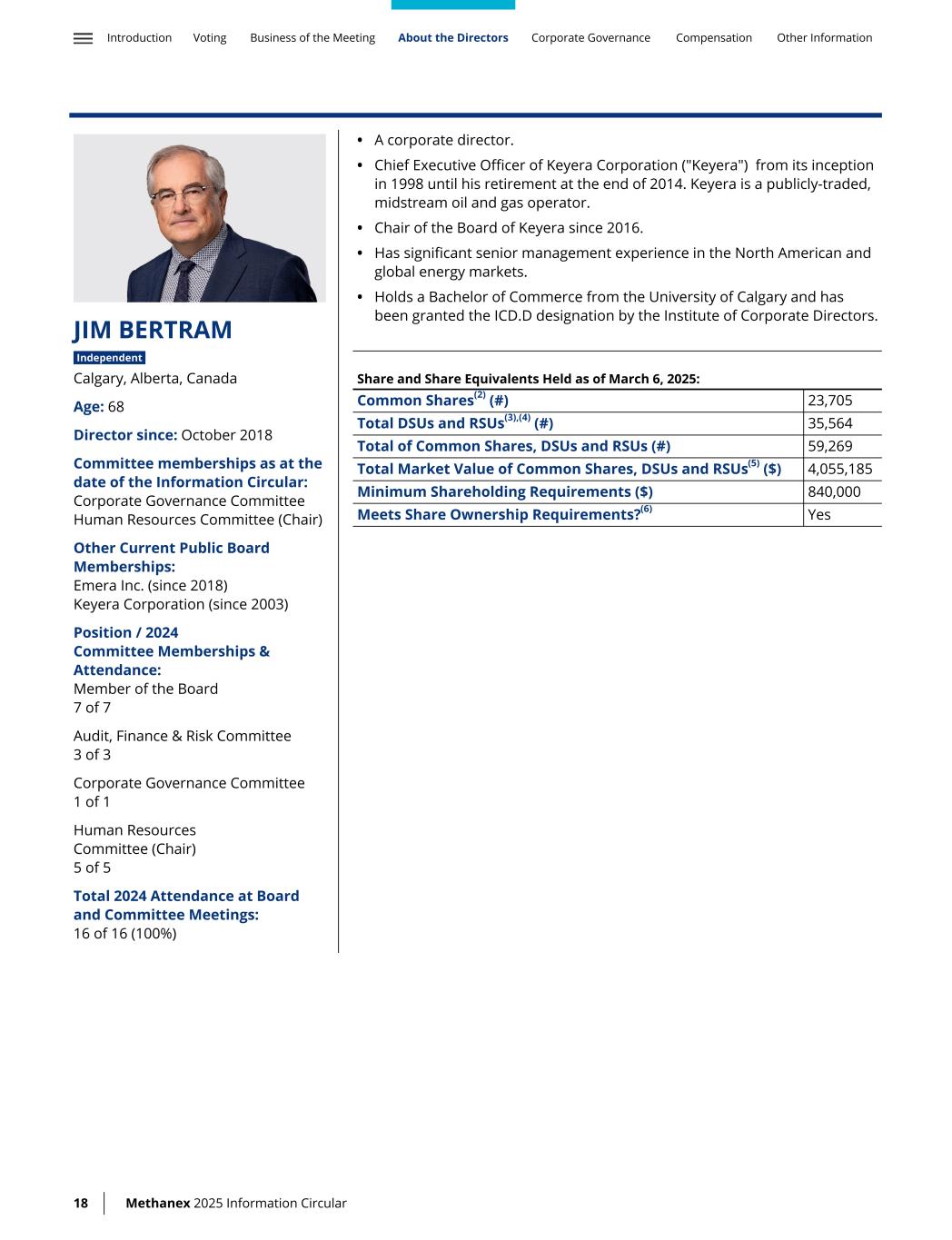 JIM BERTRAM Calgary, Alberta, Canada Age: 68 Director since: October 2018 Committee memberships as at the date of the Information Circular: Corporate Governance Committee Human Resources Committee (Chair) Other Current Public Board Memberships: Emera Inc. (since 2018) Keyera Corporation (since 2003) Position / 2024 Committee Memberships & Attendance: Member of the Board 7 of 7 Audit, Finance & Risk Committee 3 of 3 Corporate Governance Committee 1 of 1 Human Resources Committee (Chair) 5 of 5 Total 2024 Attendance at Board and Committee Meetings: 16 of 16 (100%) • A corporate director. • Chief Executive Officer of Keyera Corporation ("Keyera") from its inception in 1998 until his retirement at the end of 2014. Keyera is a publicly-traded, midstream oil and gas operator. • Chair of the Board of Keyera since 2016. • Has significant senior management experience in the North American and global energy markets. • Holds a Bachelor of Commerce from the University of Calgary and has been granted the ICD.D designation by the Institute of Corporate Directors. Share and Share Equivalents Held as of March 6, 2025: Common Shares(2) (#) 23,705 Total DSUs and RSUs(3),(4) (#) 35,564 Total of Common Shares, DSUs and RSUs (#) 59,269 Total Market Value of Common Shares, DSUs and RSUs(5) ($) 4,055,185 Minimum Shareholding Requirements ($) 840,000 Meets Share Ownership Requirements?(6) Yes Introduction Voting Business of the Meeting About the Directors Corporate Governance Compensation Other Information 18 Methanex 2025 Information Circular