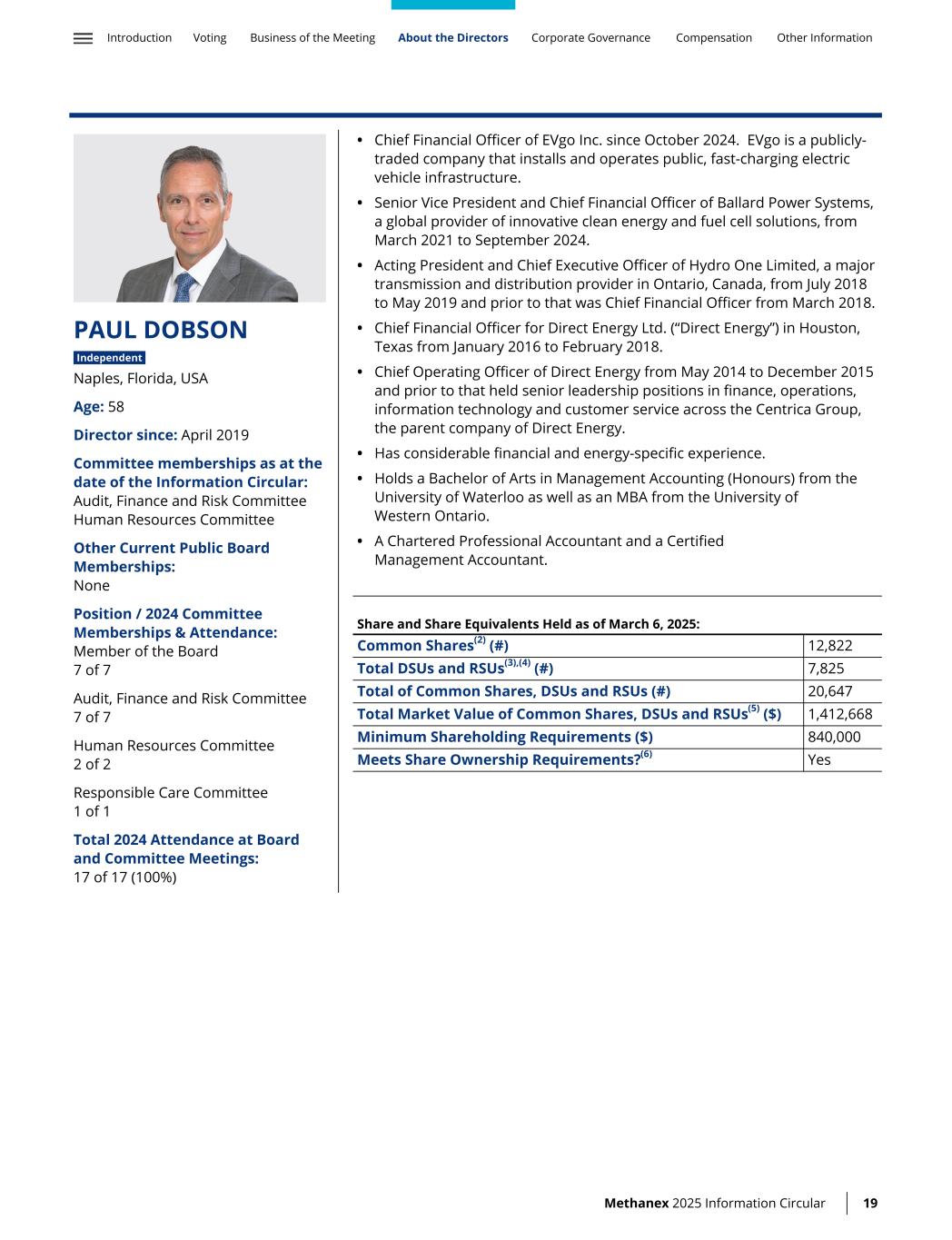 PAUL DOBSON Naples, Florida, USA Age: 58 Director since: April 2019 Committee memberships as at the date of the Information Circular: Audit, Finance and Risk Committee Human Resources Committee Other Current Public Board Memberships: None Position / 2024 Committee Memberships & Attendance: Member of the Board 7 of 7 Audit, Finance and Risk Committee 7 of 7 Human Resources Committee 2 of 2 Responsible Care Committee 1 of 1 Total 2024 Attendance at Board and Committee Meetings: 17 of 17 (100%) • Chief Financial Officer of EVgo Inc. since October 2024. EVgo is a publicly- traded company that installs and operates public, fast-charging electric vehicle infrastructure. • Senior Vice President and Chief Financial Officer of Ballard Power Systems, a global provider of innovative clean energy and fuel cell solutions, from March 2021 to September 2024. • Acting President and Chief Executive Officer of Hydro One Limited, a major transmission and distribution provider in Ontario, Canada, from July 2018 to May 2019 and prior to that was Chief Financial Officer from March 2018. • Chief Financial Officer for Direct Energy Ltd. (“Direct Energy”) in Houston, Texas from January 2016 to February 2018. • Chief Operating Officer of Direct Energy from May 2014 to December 2015 and prior to that held senior leadership positions in finance, operations, information technology and customer service across the Centrica Group, the parent company of Direct Energy. • Has considerable financial and energy-specific experience. • Holds a Bachelor of Arts in Management Accounting (Honours) from the University of Waterloo as well as an MBA from the University of Western Ontario. • A Chartered Professional Accountant and a Certified Management Accountant. Share and Share Equivalents Held as of March 6, 2025: Common Shares(2) (#) 12,822 Total DSUs and RSUs(3),(4) (#) 7,825 Total of Common Shares, DSUs and RSUs (#) 20,647 Total Market Value of Common Shares, DSUs and RSUs(5) ($) 1,412,668 Minimum Shareholding Requirements ($) 840,000 Meets Share Ownership Requirements?(6) Yes Introduction Voting Business of the Meeting About the Directors Corporate Governance Compensation Other Information Methanex 2025 Information Circular 19