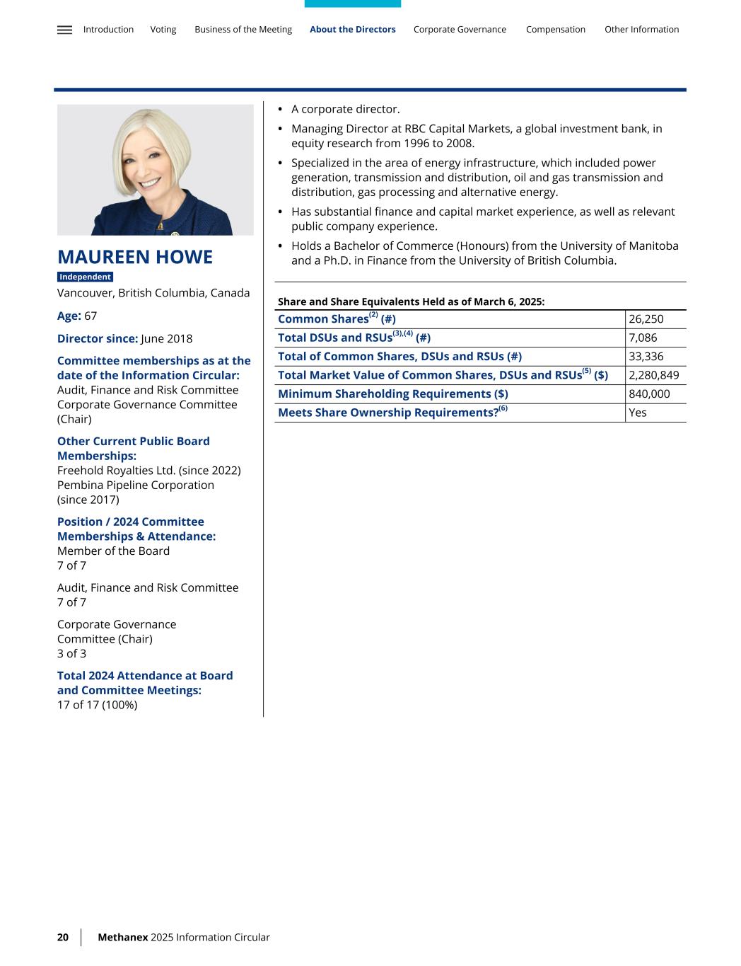 MAUREEN HOWE Vancouver, British Columbia, Canada Age: 67 Director since: June 2018 Committee memberships as at the date of the Information Circular: Audit, Finance and Risk Committee Corporate Governance Committee (Chair) Other Current Public Board Memberships: Freehold Royalties Ltd. (since 2022) Pembina Pipeline Corporation (since 2017) Position / 2024 Committee Memberships & Attendance: Member of the Board 7 of 7 Audit, Finance and Risk Committee 7 of 7 Corporate Governance Committee (Chair) 3 of 3 Total 2024 Attendance at Board and Committee Meetings: 17 of 17 (100%) • A corporate director. • Managing Director at RBC Capital Markets, a global investment bank, in equity research from 1996 to 2008. • Specialized in the area of energy infrastructure, which included power generation, transmission and distribution, oil and gas transmission and distribution, gas processing and alternative energy. • Has substantial finance and capital market experience, as well as relevant public company experience. • Holds a Bachelor of Commerce (Honours) from the University of Manitoba and a Ph.D. in Finance from the University of British Columbia. Share and Share Equivalents Held as of March 6, 2025: Common Shares(2) (#) 26,250 Total DSUs and RSUs(3),(4) (#) 7,086 Total of Common Shares, DSUs and RSUs (#) 33,336 Total Market Value of Common Shares, DSUs and RSUs(5) ($) 2,280,849 Minimum Shareholding Requirements ($) 840,000 Meets Share Ownership Requirements?(6) Yes Introduction Voting Business of the Meeting About the Directors Corporate Governance Compensation Other Information 20 Methanex 2025 Information Circular