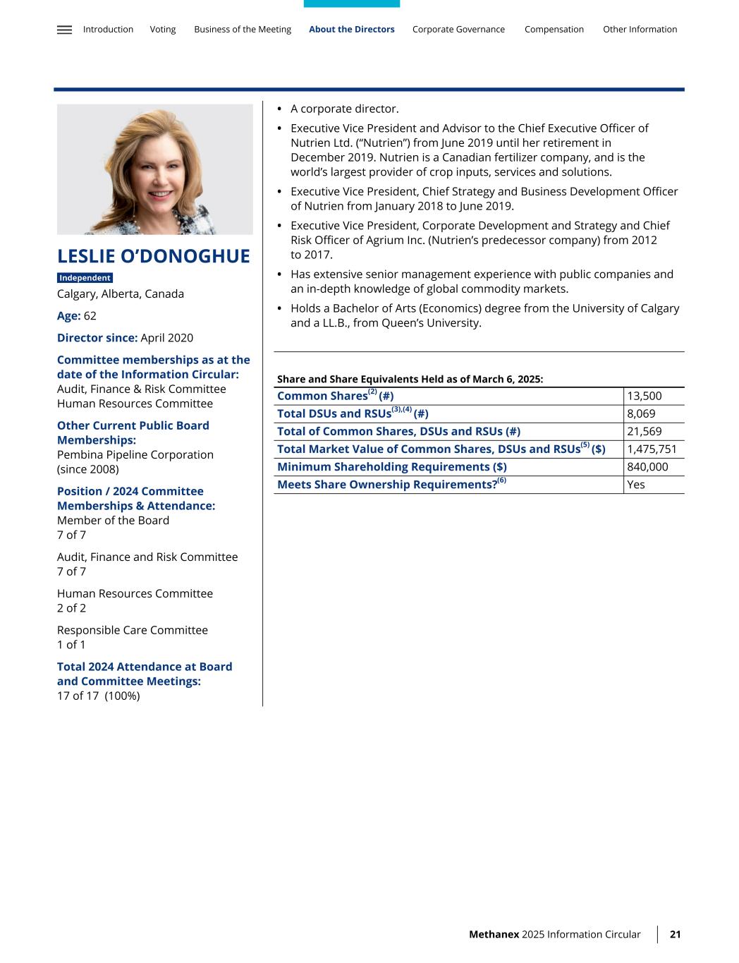 LESLIE O’DONOGHUE Calgary, Alberta, Canada Age: 62 Director since: April 2020 Committee memberships as at the date of the Information Circular: Audit, Finance & Risk Committee Human Resources Committee Other Current Public Board Memberships: Pembina Pipeline Corporation (since 2008) Position / 2024 Committee Memberships & Attendance: Member of the Board 7 of 7 Audit, Finance and Risk Committee 7 of 7 Human Resources Committee 2 of 2 Responsible Care Committee 1 of 1 Total 2024 Attendance at Board and Committee Meetings: 17 of 17 (100%) • A corporate director. • Executive Vice President and Advisor to the Chief Executive Officer of Nutrien Ltd. (“Nutrien”) from June 2019 until her retirement in December 2019. Nutrien is a Canadian fertilizer company, and is the world’s largest provider of crop inputs, services and solutions. • Executive Vice President, Chief Strategy and Business Development Officer of Nutrien from January 2018 to June 2019. • Executive Vice President, Corporate Development and Strategy and Chief Risk Officer of Agrium Inc. (Nutrien’s predecessor company) from 2012 to 2017. • Has extensive senior management experience with public companies and an in-depth knowledge of global commodity markets. • Holds a Bachelor of Arts (Economics) degree from the University of Calgary and a LL.B., from Queen’s University. Share and Share Equivalents Held as of March 6, 2025: Common Shares(2) (#) 13,500 Total DSUs and RSUs(3),(4) (#) 8,069 Total of Common Shares, DSUs and RSUs (#) 21,569 Total Market Value of Common Shares, DSUs and RSUs(5) ($) 1,475,751 Minimum Shareholding Requirements ($) 840,000 Meets Share Ownership Requirements?(6) Yes Introduction Voting Business of the Meeting About the Directors Corporate Governance Compensation Other Information Methanex 2025 Information Circular 21