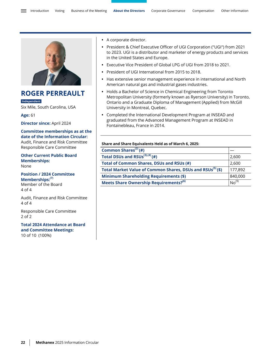ROGER PERREAULT Six Mile, South Carolina, USA Age: 61 Director since: April 2024 Committee memberships as at the date of the Information Circular: Audit, Finance and Risk Committee Responsible Care Committee Other Current Public Board Memberships: None Position / 2024 Committee Memberships:(7) Member of the Board 4 of 4 Audit, Finance and Risk Committee 4 of 4 Responsible Care Committee 2 of 2 Total 2024 Attendance at Board and Committee Meetings: 10 of 10 (100%) • A corporate director. • President & Chief Executive Officer of UGI Corporation ("UGI") from 2021 to 2023. UGI is a distributor and marketer of energy products and services in the United States and Europe. • Executive Vice President of Global LPG of UGI from 2018 to 2021. • President of UGI International from 2015 to 2018. • Has extensive senior management experience in international and North American natural gas and industrial gases industries. • Holds a Bachelor of Science in Chemical Engineering from Toronto Metropolitan University (formerly known as Ryerson University) in Toronto, Ontario and a Graduate Diploma of Management (Applied) from McGill University in Montreal, Quebec. • Completed the International Development Program at INSEAD and graduated from the Advanced Management Program at INSEAD in Fontainebleau, France in 2014. Share and Share Equivalents Held as of March 6, 2025: Common Shares(2) (#) — Total DSUs and RSUs(3),(4) (#) 2,600 Total of Common Shares, DSUs and RSUs (#) 2,600 Total Market Value of Common Shares, DSUs and RSUs(5) ($) 177,892 Minimum Shareholding Requirements ($) 840,000 Meets Share Ownership Requirements?(6) No(9) Introduction Voting Business of the Meeting About the Directors Corporate Governance Compensation Other Information 22 Methanex 2025 Information Circular