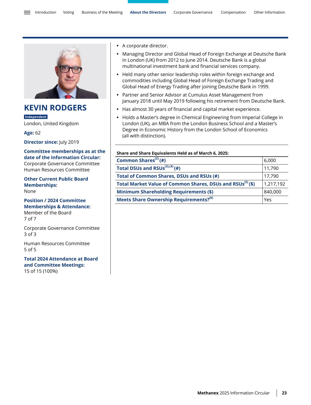 KEVIN RODGERS London, United Kingdom Age: 62 Director since: July 2019 Committee memberships as at the date of the Information Circular: Corporate Governance Committee Human Resources Committee Other Current Public Board Memberships: None Position / 2024 Committee Memberships & Attendance: Member of the Board 7 of 7 Corporate Governance Committee 3 of 3 Human Resources Committee 5 of 5 Total 2024 Attendance at Board and Committee Meetings: 15 of 15 (100%) • A corporate director. • Managing Director and Global Head of Foreign Exchange at Deutsche Bank in London (UK) from 2012 to June 2014. Deutsche Bank is a global multinational investment bank and financial services company. • Held many other senior leadership roles within foreign exchange and commodities including Global Head of Foreign Exchange Trading and Global Head of Energy Trading after joining Deutsche Bank in 1999. • Partner and Senior Advisor at Cumulus Asset Management from January 2018 until May 2019 following his retirement from Deutsche Bank. • Has almost 30 years of financial and capital market experience. • Holds a Master’s degree in Chemical Engineering from Imperial College in London (UK), an MBA from the London Business School and a Master’s Degree in Economic History from the London School of Economics (all with distinction). Share and Share Equivalents Held as of March 6, 2025: Common Shares(2) (#) 6,000 Total DSUs and RSUs(3),(4) (#) 11,790 Total of Common Shares, DSUs and RSUs (#) 17,790 Total Market Value of Common Shares, DSUs and RSUs(5) ($) 1,217,192 Minimum Shareholding Requirements ($) 840,000 Meets Share Ownership Requirements?(6) Yes Introduction Voting Business of the Meeting About the Directors Corporate Governance Compensation Other Information Methanex 2025 Information Circular 23