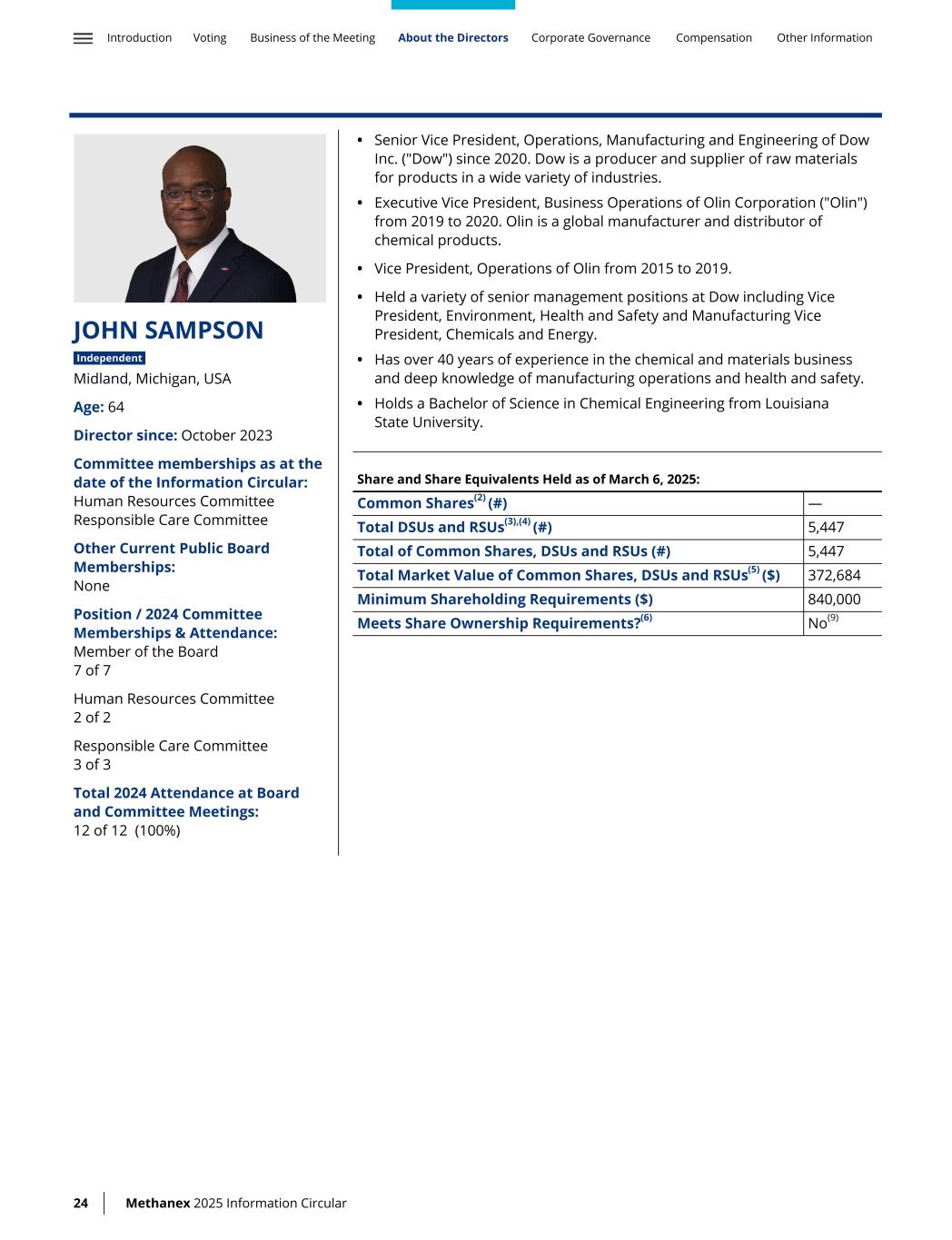 JOHN SAMPSON Midland, Michigan, USA Age: 64 Director since: October 2023 Committee memberships as at the date of the Information Circular: Human Resources Committee Responsible Care Committee Other Current Public Board Memberships: None Position / 2024 Committee Memberships & Attendance: Member of the Board 7 of 7 Human Resources Committee 2 of 2 Responsible Care Committee 3 of 3 Total 2024 Attendance at Board and Committee Meetings: 12 of 12 (100%) • Senior Vice President, Operations, Manufacturing and Engineering of Dow Inc. ("Dow") since 2020. Dow is a producer and supplier of raw materials for products in a wide variety of industries. • Executive Vice President, Business Operations of Olin Corporation ("Olin") from 2019 to 2020. Olin is a global manufacturer and distributor of chemical products. • Vice President, Operations of Olin from 2015 to 2019. • Held a variety of senior management positions at Dow including Vice President, Environment, Health and Safety and Manufacturing Vice President, Chemicals and Energy. • Has over 40 years of experience in the chemical and materials business and deep knowledge of manufacturing operations and health and safety. • Holds a Bachelor of Science in Chemical Engineering from Louisiana State University. Share and Share Equivalents Held as of March 6, 2025: Common Shares(2) (#) — Total DSUs and RSUs(3),(4) (#) 5,447 Total of Common Shares, DSUs and RSUs (#) 5,447 Total Market Value of Common Shares, DSUs and RSUs(5) ($) 372,684 Minimum Shareholding Requirements ($) 840,000 Meets Share Ownership Requirements?(6) No(9) Introduction Voting Business of the Meeting About the Directors Corporate Governance Compensation Other Information 24 Methanex 2025 Information Circular