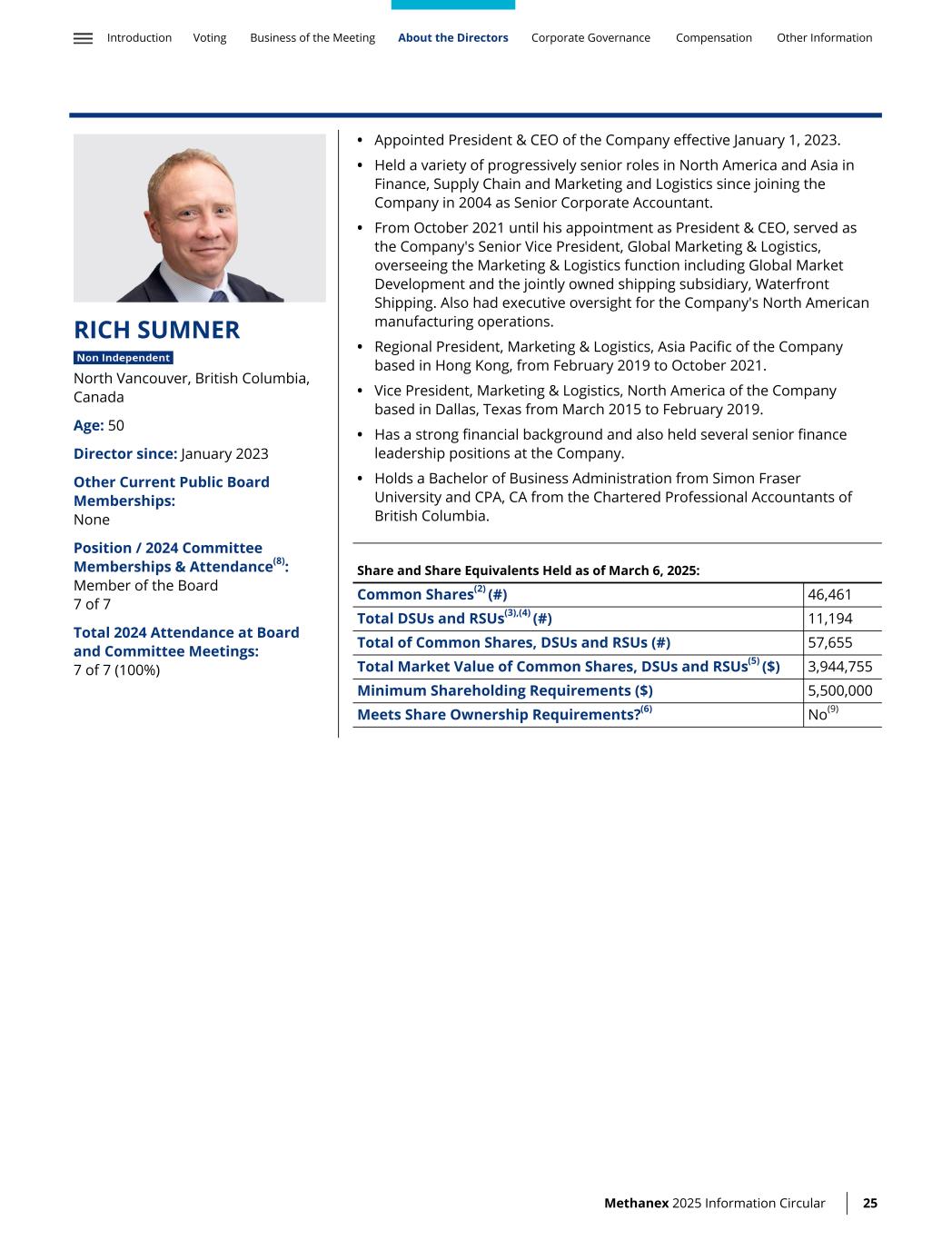 RICH SUMNER North Vancouver, British Columbia, Canada Age: 50 Director since: January 2023 Other Current Public Board Memberships: None Position / 2024 Committee Memberships & Attendance(8): Member of the Board 7 of 7 Total 2024 Attendance at Board and Committee Meetings: 7 of 7 (100%) • Appointed President & CEO of the Company effective January 1, 2023. • Held a variety of progressively senior roles in North America and Asia in Finance, Supply Chain and Marketing and Logistics since joining the Company in 2004 as Senior Corporate Accountant. • From October 2021 until his appointment as President & CEO, served as the Company's Senior Vice President, Global Marketing & Logistics, overseeing the Marketing & Logistics function including Global Market Development and the jointly owned shipping subsidiary, Waterfront Shipping. Also had executive oversight for the Company's North American manufacturing operations. • Regional President, Marketing & Logistics, Asia Pacific of the Company based in Hong Kong, from February 2019 to October 2021. • Vice President, Marketing & Logistics, North America of the Company based in Dallas, Texas from March 2015 to February 2019. • Has a strong financial background and also held several senior finance leadership positions at the Company. • Holds a Bachelor of Business Administration from Simon Fraser University and CPA, CA from the Chartered Professional Accountants of British Columbia. Share and Share Equivalents Held as of March 6, 2025: Common Shares(2) (#) 46,461 Total DSUs and RSUs(3),(4) (#) 11,194 Total of Common Shares, DSUs and RSUs (#) 57,655 Total Market Value of Common Shares, DSUs and RSUs(5) ($) 3,944,755 Minimum Shareholding Requirements ($) 5,500,000 Meets Share Ownership Requirements?(6) No(9) Introduction Voting Business of the Meeting About the Directors Corporate Governance Compensation Other Information Methanex 2025 Information Circular 25