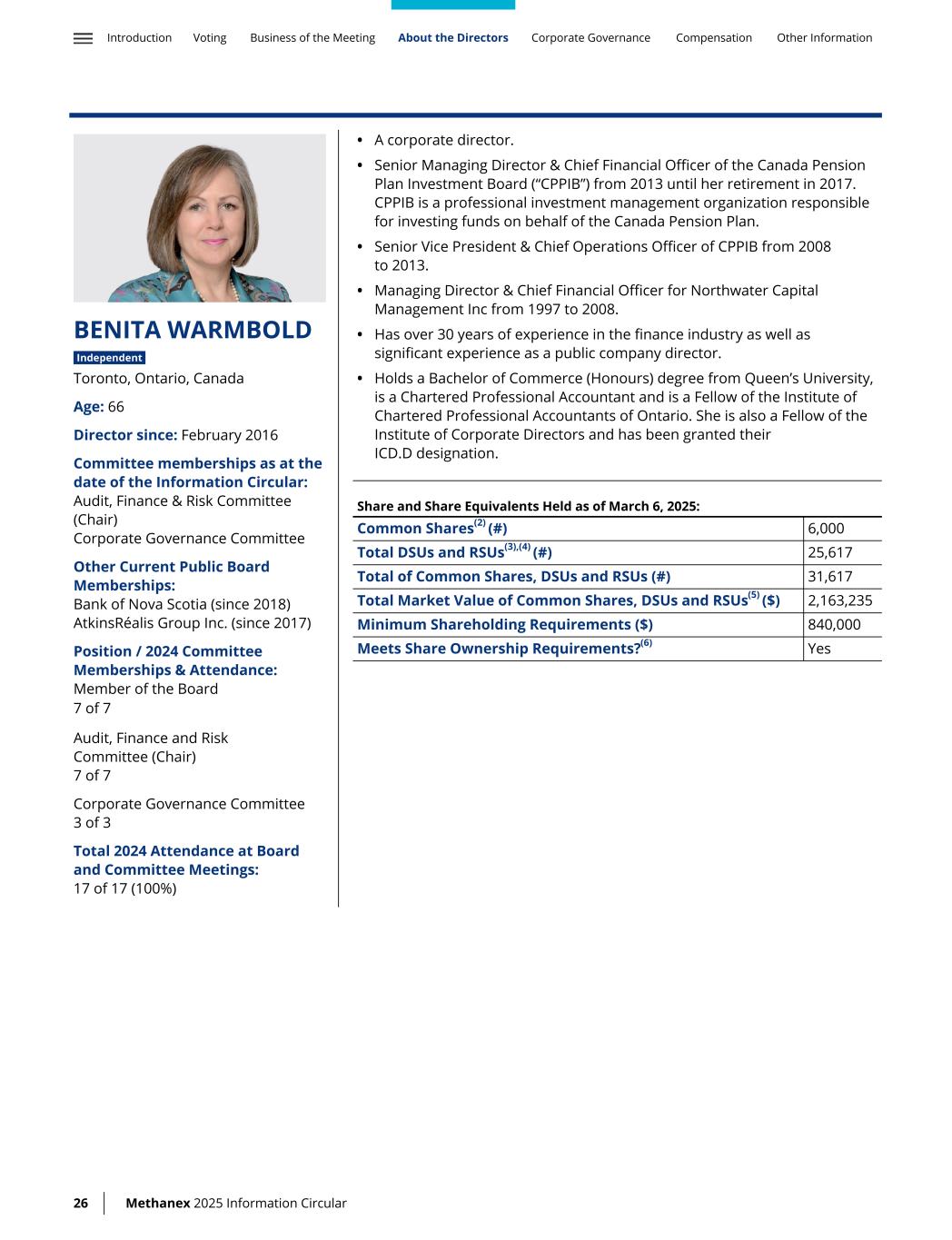 BENITA WARMBOLD Toronto, Ontario, Canada Age: 66 Director since: February 2016 Committee memberships as at the date of the Information Circular: Audit, Finance & Risk Committee (Chair) Corporate Governance Committee Other Current Public Board Memberships: Bank of Nova Scotia (since 2018) AtkinsRéalis Group Inc. (since 2017) Position / 2024 Committee Memberships & Attendance: Member of the Board 7 of 7 Audit, Finance and Risk Committee (Chair) 7 of 7 Corporate Governance Committee 3 of 3 Total 2024 Attendance at Board and Committee Meetings: 17 of 17 (100%) • A corporate director. • Senior Managing Director & Chief Financial Officer of the Canada Pension Plan Investment Board (“CPPIB”) from 2013 until her retirement in 2017. CPPIB is a professional investment management organization responsible for investing funds on behalf of the Canada Pension Plan. • Senior Vice President & Chief Operations Officer of CPPIB from 2008 to 2013. • Managing Director & Chief Financial Officer for Northwater Capital Management Inc from 1997 to 2008. • Has over 30 years of experience in the finance industry as well as significant experience as a public company director. • Holds a Bachelor of Commerce (Honours) degree from Queen’s University, is a Chartered Professional Accountant and is a Fellow of the Institute of Chartered Professional Accountants of Ontario. She is also a Fellow of the Institute of Corporate Directors and has been granted their ICD.D designation. Share and Share Equivalents Held as of March 6, 2025: Common Shares(2) (#) 6,000 Total DSUs and RSUs(3),(4) (#) 25,617 Total of Common Shares, DSUs and RSUs (#) 31,617 Total Market Value of Common Shares, DSUs and RSUs(5) ($) 2,163,235 Minimum Shareholding Requirements ($) 840,000 Meets Share Ownership Requirements?(6) Yes Introduction Voting Business of the Meeting About the Directors Corporate Governance Compensation Other Information 26 Methanex 2025 Information Circular