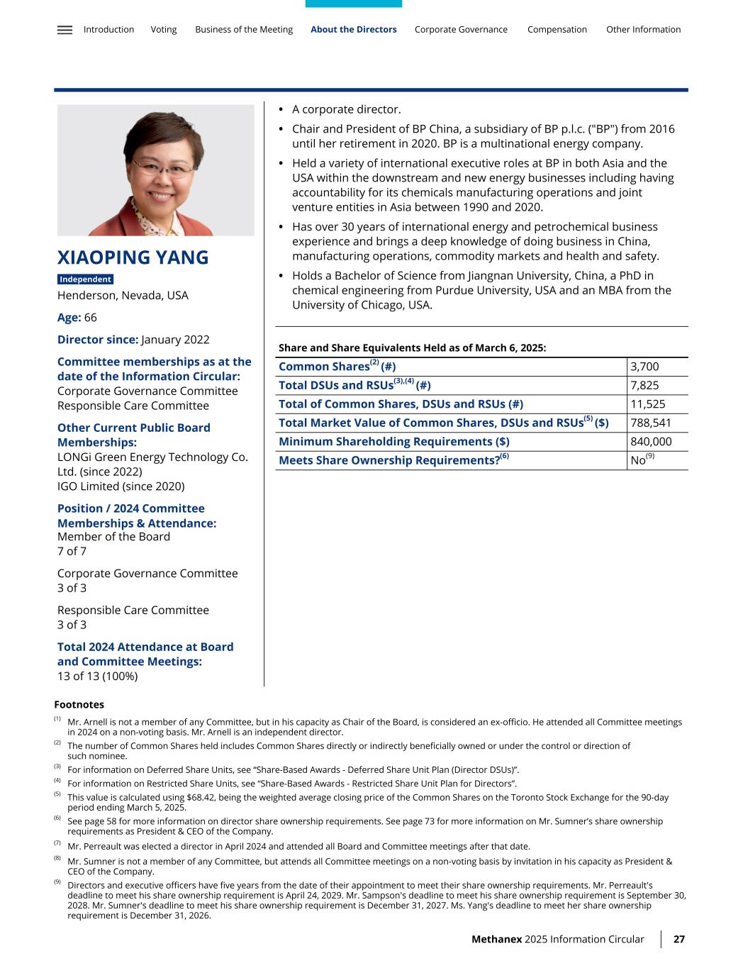 XIAOPING YANG Henderson, Nevada, USA Age: 66 Director since: January 2022 Committee memberships as at the date of the Information Circular: Corporate Governance Committee Responsible Care Committee Other Current Public Board Memberships: LONGi Green Energy Technology Co. Ltd. (since 2022) IGO Limited (since 2020) Position / 2024 Committee Memberships & Attendance: Member of the Board 7 of 7 Corporate Governance Committee 3 of 3 Responsible Care Committee 3 of 3 Total 2024 Attendance at Board and Committee Meetings: 13 of 13 (100%) • A corporate director. • Chair and President of BP China, a subsidiary of BP p.l.c. ("BP") from 2016 until her retirement in 2020. BP is a multinational energy company. • Held a variety of international executive roles at BP in both Asia and the USA within the downstream and new energy businesses including having accountability for its chemicals manufacturing operations and joint venture entities in Asia between 1990 and 2020. • Has over 30 years of international energy and petrochemical business experience and brings a deep knowledge of doing business in China, manufacturing operations, commodity markets and health and safety. • Holds a Bachelor of Science from Jiangnan University, China, a PhD in chemical engineering from Purdue University, USA and an MBA from the University of Chicago, USA. Share and Share Equivalents Held as of March 6, 2025: Common Shares(2) (#) 3,700 Total DSUs and RSUs(3),(4) (#) 7,825 Total of Common Shares, DSUs and RSUs (#) 11,525 Total Market Value of Common Shares, DSUs and RSUs(5) ($) 788,541 Minimum Shareholding Requirements ($) 840,000 Meets Share Ownership Requirements?(6) No(9) Footnotes (1) Mr. Arnell is not a member of any Committee, but in his capacity as Chair of the Board, is considered an ex-officio. He attended all Committee meetings in 2024 on a non-voting basis. Mr. Arnell is an independent director. (2) The number of Common Shares held includes Common Shares directly or indirectly beneficially owned or under the control or direction of such nominee. (3) For information on Deferred Share Units, see “Share-Based Awards - Deferred Share Unit Plan (Director DSUs)”. (4) For information on Restricted Share Units, see “Share-Based Awards - Restricted Share Unit Plan for Directors”. (5) This value is calculated using $68.42, being the weighted average closing price of the Common Shares on the Toronto Stock Exchange for the 90-day period ending March 5, 2025. (6) See page 58 for more information on director share ownership requirements. See page 73 for more information on Mr. Sumner’s share ownership requirements as President & CEO of the Company. (7) Mr. Perreault was elected a director in April 2024 and attended all Board and Committee meetings after that date. (8) Mr. Sumner is not a member of any Committee, but attends all Committee meetings on a non-voting basis by invitation in his capacity as President & CEO of the Company. (9) Directors and executive officers have five years from the date of their appointment to meet their share ownership requirements. Mr. Perreault's deadline to meet his share ownership requirement is April 24, 2029. Mr. Sampson's deadline to meet his share ownership requirement is September 30, 2028. Mr. Sumner's deadline to meet his share ownership requirement is December 31, 2027. Ms. Yang's deadline to meet her share ownership requirement is December 31, 2026. Introduction Voting Business of the Meeting About the Directors Corporate Governance Compensation Other Information Methanex 2025 Information Circular 27