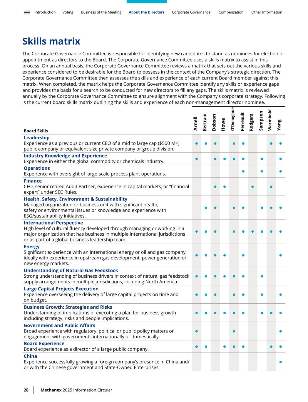Skills matrix The Corporate Governance Committee is responsible for identifying new candidates to stand as nominees for election or appointment as directors to the Board. The Corporate Governance Committee uses a skills matrix to assist in this process. On an annual basis, the Corporate Governance Committee reviews a matrix that sets out the various skills and experience considered to be desirable for the Board to possess in the context of the Company’s strategic direction. The Corporate Governance Committee then assesses the skills and experience of each current Board member against this matrix. When completed, the matrix helps the Corporate Governance Committee identify any skills or experience gaps and provides the basis for a search to be conducted for new directors to fill any gaps. The skills matrix is reviewed annually by the Corporate Governance Committee to ensure alignment with the Company’s corporate strategy. Following is the current board skills matrix outlining the skills and experience of each non-management director nominee. Board Skills Leadership Experience as a previous or current CEO of a mid to large cap ($500 M+) public company or equivalent size private company or group division. Industry Knowledge and Experience Experience in either the global commodity or chemicals industry. Operations Experience with oversight of large-scale process plant operations. Finance CFO, senior retired Audit Partner, experience in capital markets, or “financial expert” under SEC Rules. Health, Safety, Environment & Sustainability Managed organization or business unit with significant health, safety or environmental issues or knowledge and experience with ESG/sustainability initiatives. International Perspective High level of cultural fluency developed through managing or working in a major organization that has business in multiple international jurisdictions or as part of a global business leadership team. Energy Significant experience with an international energy or oil and gas company ideally with experience in upstream gas development, power generation or new energy markets. Understanding of Natural Gas Feedstock Strong understanding of business drivers in context of natural gas feedstock supply arrangements in multiple jurisdictions, including North America. Large Capital Projects Execution Experience overseeing the delivery of large capital projects on time and on budget. Business Growth: Strategies and Risks Understanding of implications of executing a plan for business growth including strategy, risks and people implications. Government and Public Affairs Broad experience with regulatory, political or public policy matters or engagement with governments internationally or domestically. Board Experience Board experience as a director of a large public company. China Experience successfully growing a foreign company’s presence in China and/ or with the Chinese government and State-Owned Enterprises. Introduction Voting Business of the Meeting About the Directors Corporate Governance Compensation Other Information 28 Methanex 2025 Information Circular