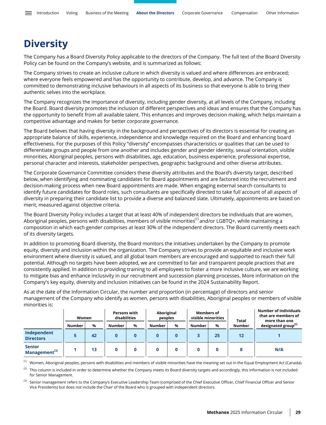 Diversity The Company has a Board Diversity Policy applicable to the directors of the Company. The full text of the Board Diversity Policy can be found on the Company’s website, and is summarized as follows: The Company strives to create an inclusive culture in which diversity is valued and where differences are embraced; where everyone feels empowered and has the opportunity to contribute, develop, and advance. The Company is committed to demonstrating inclusive behaviours in all aspects of its business so that everyone is able to bring their authentic selves into the workplace. The Company recognizes the importance of diversity, including gender diversity, at all levels of the Company, including the Board. Board diversity promotes the inclusion of different perspectives and ideas and ensures that the Company has the opportunity to benefit from all available talent. This enhances and improves decision making, which helps maintain a competitive advantage and makes for better corporate governance. The Board believes that having diversity in the background and perspectives of its directors is essential for creating an appropriate balance of skills, experience, independence and knowledge required on the Board and enhancing board effectiveness. For the purposes of this Policy “diversity” encompasses characteristics or qualities that can be used to differentiate groups and people from one another and includes gender and gender identity, sexual orientation, visible minorities, Aboriginal peoples, persons with disabilities, age, education, business experience, professional expertise, personal character and interests, stakeholder perspectives, geographic background and other diverse attributes. The Corporate Governance Committee considers these diversity attributes and the Board’s diversity target, described below, when identifying and nominating candidates for Board appointments and are factored into the recruitment and decision-making process when new Board appointments are made. When engaging external search consultants to identify future candidates for Board roles, such consultants are specifically directed to take full account of all aspects of diversity in preparing their candidate list to provide a diverse and balanced slate. Ultimately, appointments are based on merit, measured against objective criteria. The Board Diversity Policy includes a target that at least 40% of independent directors be individuals that are women, Aboriginal peoples, persons with disabilities, members of visible minorities(1) and/or LGBTQ+, while maintaining a composition in which each gender comprises at least 30% of the independent directors. The Board currently meets each of its diversity targets. In addition to promoting Board diversity, the Board monitors the initiatives undertaken by the Company to promote equity, diversity and inclusion within the organization. The Company strives to provide an equitable and inclusive work environment where diversity is valued, and all global team members are encouraged and supported to reach their full potential. Although no targets have been adopted, we are committed to fair and transparent people practices that are consistently applied. In addition to providing training to all employees to foster a more inclusive culture, we are working to mitigate bias and enhance inclusivity in our recruitment and succession planning processes. More information on the Company's key equity, diversity and inclusion initiatives can be found in the 2024 Sustainability Report. As at the date of the Information Circular, the number and proportion (in percentage) of directors and senior management of the Company who identify as women, persons with disabilities, Aboriginal peoples or members of visible minorities is: Women Persons with disabilities Aboriginal peoples Members of visible minorities Total Number Number of individuals that are members of more than one designated group(2)Number % Number % Number % Number % Independent Directors 5 42 0 0 0 0 3 25 12 1 Senior Management(3) 1 13 0 0 0 0 0 0 8 N/A (1) Women, Aboriginal peoples, persons with disabilities and members of visible minorities have the meaning set out in the Equal Employment Act (Canada). (2) This column is included in order to determine whether the Company meets its Board diversity targets and accordingly, this information is not included for Senior Management. (3) Senior management refers to the Company’s Executive Leadership Team (comprised of the Chief Executive Officer, Chief Financial Officer and Senior Vice Presidents) but does not include the Chair of the Board who is grouped with independent directors. Introduction Voting Business of the Meeting About the Directors Corporate Governance Compensation Other Information Methanex 2025 Information Circular 29