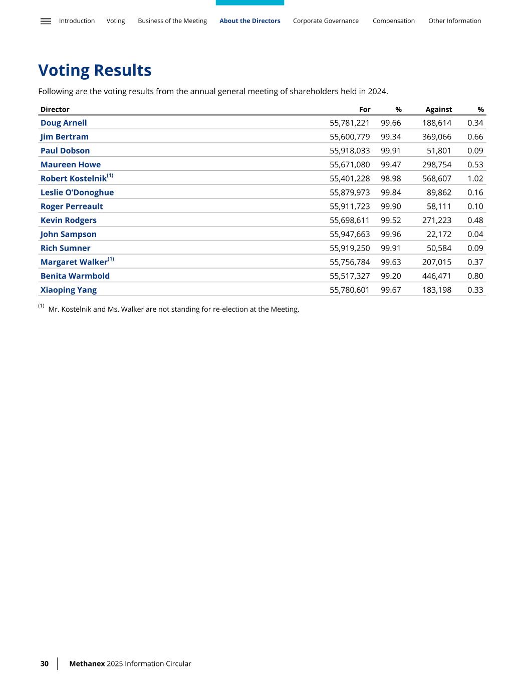 Voting Results Following are the voting results from the annual general meeting of shareholders held in 2024. Director For % Against % Doug Arnell 55,781,221 99.66 188,614 0.34 Jim Bertram 55,600,779 99.34 369,066 0.66 Paul Dobson 55,918,033 99.91 51,801 0.09 Maureen Howe 55,671,080 99.47 298,754 0.53 Robert Kostelnik(1) 55,401,228 98.98 568,607 1.02 Leslie O’Donoghue 55,879,973 99.84 89,862 0.16 Roger Perreault 55,911,723 99.90 58,111 0.10 Kevin Rodgers 55,698,611 99.52 271,223 0.48 John Sampson 55,947,663 99.96 22,172 0.04 Rich Sumner 55,919,250 99.91 50,584 0.09 Margaret Walker(1) 55,756,784 99.63 207,015 0.37 Benita Warmbold 55,517,327 99.20 446,471 0.80 Xiaoping Yang 55,780,601 99.67 183,198 0.33 (1) Mr. Kostelnik and Ms. Walker are not standing for re-election at the Meeting. Introduction Voting Business of the Meeting About the Directors Corporate Governance Compensation Other Information 30 Methanex 2025 Information Circular