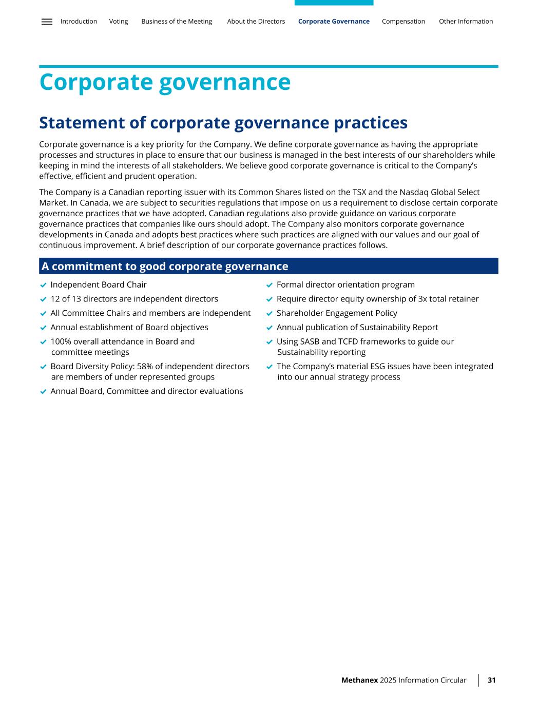 Corporate governance Statement of corporate governance practices Corporate governance is a key priority for the Company. We define corporate governance as having the appropriate processes and structures in place to ensure that our business is managed in the best interests of our shareholders while keeping in mind the interests of all stakeholders. We believe good corporate governance is critical to the Company’s effective, efficient and prudent operation. The Company is a Canadian reporting issuer with its Common Shares listed on the TSX and the Nasdaq Global Select Market. In Canada, we are subject to securities regulations that impose on us a requirement to disclose certain corporate governance practices that we have adopted. Canadian regulations also provide guidance on various corporate governance practices that companies like ours should adopt. The Company also monitors corporate governance developments in Canada and adopts best practices where such practices are aligned with our values and our goal of continuous improvement. A brief description of our corporate governance practices follows. A commitment to good corporate governance Independent Board Chair 12 of 13 directors are independent directors All Committee Chairs and members are independent Annual establishment of Board objectives 100% overall attendance in Board and committee meetings Board Diversity Policy: 58% of independent directors are members of under represented groups Annual Board, Committee and director evaluations Formal director orientation program Require director equity ownership of 3x total retainer Shareholder Engagement Policy Annual publication of Sustainability Report Using SASB and TCFD frameworks to guide our Sustainability reporting The Company’s material ESG issues have been integrated into our annual strategy process Introduction Voting Business of the Meeting About the Directors Corporate Governance Compensation Other Information Methanex 2025 Information Circular 31