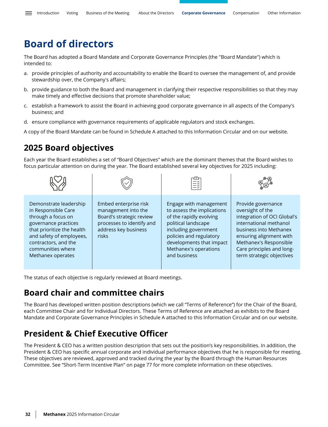 Board of directors The Board has adopted a Board Mandate and Corporate Governance Principles (the "Board Mandate") which is intended to: a. provide principles of authority and accountability to enable the Board to oversee the management of, and provide stewardship over, the Company's affairs; b. provide guidance to both the Board and management in clarifying their respective responsibilities so that they may make timely and effective decisions that promote shareholder value; c. establish a framework to assist the Board in achieving good corporate governance in all aspects of the Company's business; and d. ensure compliance with governance requirements of applicable regulators and stock exchanges. A copy of the Board Mandate can be found in Schedule A attached to this Information Circular and on our website. 2025 Board objectives Each year the Board establishes a set of “Board Objectives” which are the dominant themes that the Board wishes to focus particular attention on during the year. The Board established several key objectives for 2025 including: Demonstrate leadership in Responsible Care through a focus on governance practices that prioritize the health and safety of employees, contractors, and the communities where Methanex operates Embed enterprise risk management into the Board's strategic review processes to identify and address key business risks Engage with management to assess the implications of the rapidly evolving political landscape including government policies and regulatory developments that impact Methanex's operations and business Provide governance oversight of the integration of OCI Global's international methanol business into Methanex ensuring alignment with Methanex's Responsible Care principles and long- term strategic objectives The status of each objective is regularly reviewed at Board meetings. Board chair and committee chairs The Board has developed written position descriptions (which we call “Terms of Reference”) for the Chair of the Board, each Committee Chair and for Individual Directors. These Terms of Reference are attached as exhibits to the Board Mandate and Corporate Governance Principles in Schedule A attached to this Information Circular and on our website. President & Chief Executive Officer The President & CEO has a written position description that sets out the position’s key responsibilities. In addition, the President & CEO has specific annual corporate and individual performance objectives that he is responsible for meeting. These objectives are reviewed, approved and tracked during the year by the Board through the Human Resources Committee. See “Short-Term Incentive Plan” on page 77 for more complete information on these objectives. Introduction Voting Business of the Meeting About the Directors Corporate Governance Compensation Other Information 32 Methanex 2025 Information Circular