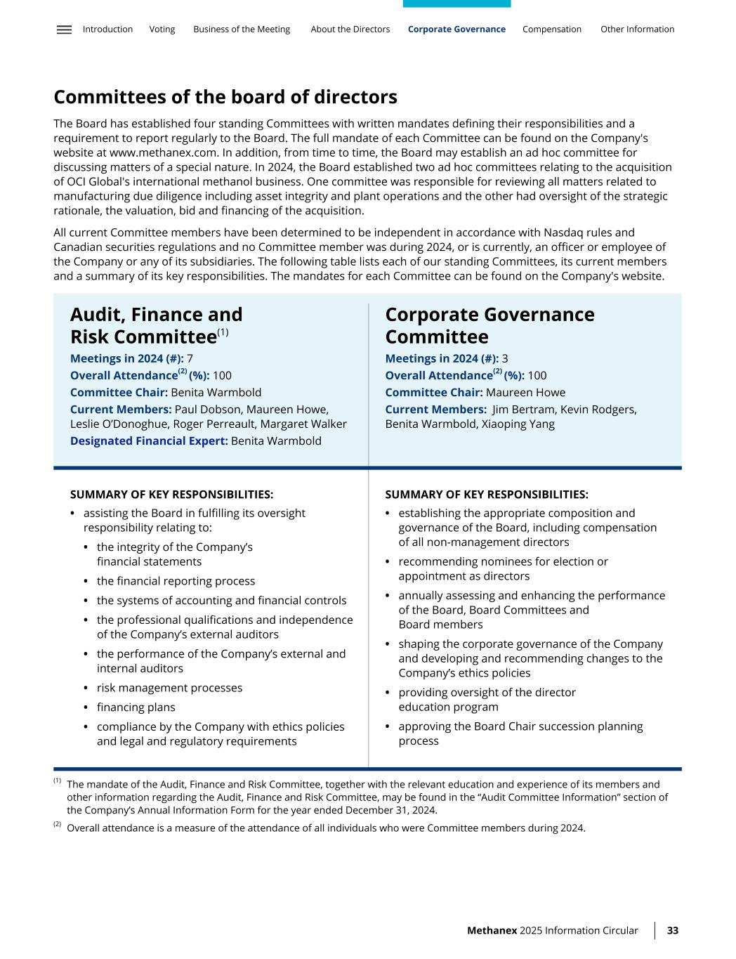 Committees of the board of directors The Board has established four standing Committees with written mandates defining their responsibilities and a requirement to report regularly to the Board. The full mandate of each Committee can be found on the Company's website at www.methanex.com. In addition, from time to time, the Board may establish an ad hoc committee for discussing matters of a special nature. In 2024, the Board established two ad hoc committees relating to the acquisition of OCI Global's international methanol business. One committee was responsible for reviewing all matters related to manufacturing due diligence including asset integrity and plant operations and the other had oversight of the strategic rationale, the valuation, bid and financing of the acquisition. All current Committee members have been determined to be independent in accordance with Nasdaq rules and Canadian securities regulations and no Committee member was during 2024, or is currently, an officer or employee of the Company or any of its subsidiaries. The following table lists each of our standing Committees, its current members and a summary of its key responsibilities. The mandates for each Committee can be found on the Company's website. Audit, Finance and Risk Committee(1) Meetings in 2024 (#): 7 Overall Attendance(2) (%): 100 Committee Chair: Benita Warmbold Current Members: Paul Dobson, Maureen Howe, Leslie O’Donoghue, Roger Perreault, Margaret Walker Designated Financial Expert: Benita Warmbold Corporate Governance Committee Meetings in 2024 (#): 3 Overall Attendance(2) (%): 100 Committee Chair: Maureen Howe Current Members: Jim Bertram, Kevin Rodgers, Benita Warmbold, Xiaoping Yang SUMMARY OF KEY RESPONSIBILITIES: • assisting the Board in fulfilling its oversight responsibility relating to: • the integrity of the Company’s financial statements • the financial reporting process • the systems of accounting and financial controls • the professional qualifications and independence of the Company’s external auditors • the performance of the Company’s external and internal auditors • risk management processes • financing plans • compliance by the Company with ethics policies and legal and regulatory requirements SUMMARY OF KEY RESPONSIBILITIES: • establishing the appropriate composition and governance of the Board, including compensation of all non-management directors • recommending nominees for election or appointment as directors • annually assessing and enhancing the performance of the Board, Board Committees and Board members • shaping the corporate governance of the Company and developing and recommending changes to the Company’s ethics policies • providing oversight of the director education program • approving the Board Chair succession planning process (1) The mandate of the Audit, Finance and Risk Committee, together with the relevant education and experience of its members and other information regarding the Audit, Finance and Risk Committee, may be found in the “Audit Committee Information” section of the Company’s Annual Information Form for the year ended December 31, 2024. (2) Overall attendance is a measure of the attendance of all individuals who were Committee members during 2024. Introduction Voting Business of the Meeting About the Directors Corporate Governance Compensation Other Information Methanex 2025 Information Circular 33