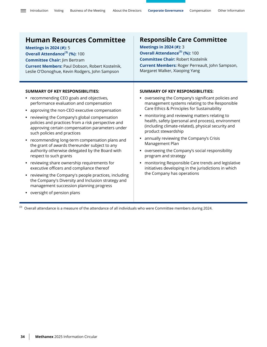 Human Resources Committee Meetings in 2024 (#): 5 Overall Attendance(3) (%): 100 Committee Chair: Jim Bertram Current Members: Paul Dobson, Robert Kostelnik, Leslie O'Donoghue, Kevin Rodgers, John Sampson Responsible Care Committee Meetings in 2024 (#): 3 Overall Attendance(3) (%): 100 Committee Chair: Robert Kostelnik Current Members: Roger Perreault, John Sampson, Margaret Walker, Xiaoping Yang SUMMARY OF KEY RESPONSIBILITIES: • recommending CEO goals and objectives, performance evaluation and compensation • approving the non-CEO executive compensation • reviewing the Company’s global compensation policies and practices from a risk perspective and approving certain compensation parameters under such policies and practices • recommending long-term compensation plans and the grant of awards thereunder subject to any authority otherwise delegated by the Board with respect to such grants • reviewing share ownership requirements for executive officers and compliance thereof • reviewing the Company's people practices, including the Company's Diversity and Inclusion strategy and management succession planning progress • oversight of pension plans SUMMARY OF KEY RESPONSIBILITIES: • overseeing the Company’s significant policies and management systems relating to the Responsible Care Ethics & Principles for Sustainability • monitoring and reviewing matters relating to health, safety (personal and process), environment (including climate-related), physical security and product stewardship • annually reviewing the Company’s Crisis Management Plan • overseeing the Company’s social responsibility program and strategy • monitoring Responsible Care trends and legislative initiatives developing in the jurisdictions in which the Company has operations (3) Overall attendance is a measure of the attendance of all individuals who were Committee members during 2024. Introduction Voting Business of the Meeting About the Directors Corporate Governance Compensation Other Information 34 Methanex 2025 Information Circular