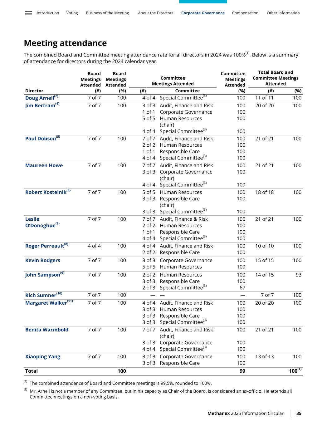 Meeting attendance The combined Board and Committee meeting attendance rate for all directors in 2024 was 100%(1). Below is a summary of attendance for directors during the 2024 calendar year. Board Meetings Attended (#) Board Meetings Attended (%) Committee Meetings Attended Committee Meetings Attended (%) Total Board and Committee Meetings Attended Director (#) Committee (#) (%) Doug Arnell(2) 7 of 7 100 4 of 4 Special Committee(3) 100 11 of 11 100 Jim Bertram(4) 7 of 7 100 3 of 3 1 of 1 5 of 5 4 of 4 Audit, Finance and Risk Corporate Governance Human Resources (chair) Special Committee(3) 100 100 100 100 20 of 20 100 Paul Dobson(5) 7 of 7 100 7 of 7 2 of 2 1 of 1 4 of 4 Audit, Finance and Risk Human Resources Responsible Care Special Committee(3) 100 100 100 100 21 of 21 100 Maureen Howe 7 of 7 100 7 of 7 3 of 3 4 of 4 Audit, Finance and Risk Corporate Governance (chair) Special Committee(3) 100 100 100 21 of 21 100 Robert Kostelnik(6) 7 of 7 100 5 of 5 3 of 3 3 of 3 Human Resources Responsible Care (chair) Special Committee(3) 100 100 100 18 of 18 100 Leslie O’Donoghue(7) 7 of 7 100 7 of 7 2 of 2 1 of 1 4 of 4 Audit, Finance & Risk Human Resources Responsible Care Special Committee(3) 100 100 100 100 21 of 21 100 Roger Perreault(8) 4 of 4 100 4 of 4 2 of 2 Audit, Finance and Risk Responsible Care 100 100 10 of 10 100 Kevin Rodgers 7 of 7 100 3 of 3 5 of 5 Corporate Governance Human Resources 100 100 15 of 15 100 John Sampson(9) 7 of 7 100 2 of 2 3 of 3 2 of 3 Human Resources Responsible Care Special Committee(3) 100 100 67 14 of 15 93 Rich Sumner(10) 7 of 7 100 — — — 7 of 7 100 Margaret Walker(11) 7 of 7 100 4 of 4 3 of 3 3 of 3 3 of 3 Audit, Finance and Risk Human Resources Responsible Care Special Committee(3) 100 100 100 100 20 of 20 100 Benita Warmbold 7 of 7 100 7 of 7 3 of 3 4 of 4 Audit, Finance and Risk (chair) Corporate Governance Special Committee(3) 100 100 100 21 of 21 100 Xiaoping Yang 7 of 7 100 3 of 3 3 of 3 Corporate Governance Responsible Care 100 100 13 of 13 100 Total 100 99 100(1) (1) The combined attendance of Board and Committee meetings is 99.5%, rounded to 100%. (2) Mr. Arnell is not a member of any Committee, but in his capacity as Chair of the Board, is considered an ex-officio. He attends all Committee meetings on a non-voting basis. Introduction Voting Business of the Meeting About the Directors Corporate Governance Compensation Other Information Methanex 2025 Information Circular 35