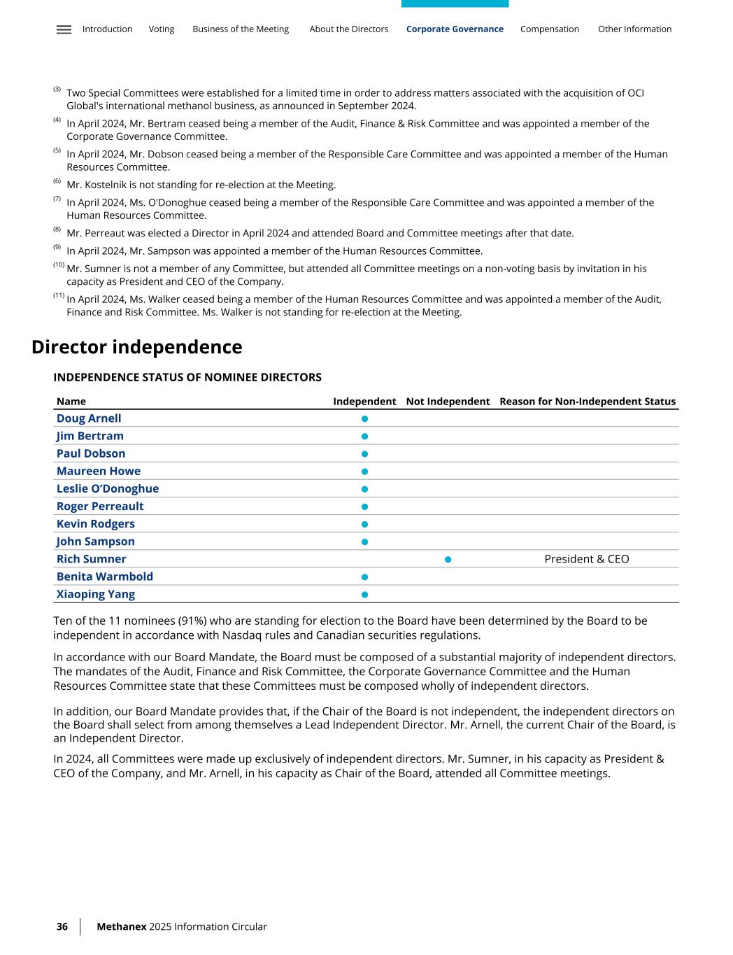 (3) Two Special Committees were established for a limited time in order to address matters associated with the acquisition of OCI Global's international methanol business, as announced in September 2024. (4) In April 2024, Mr. Bertram ceased being a member of the Audit, Finance & Risk Committee and was appointed a member of the Corporate Governance Committee. (5) In April 2024, Mr. Dobson ceased being a member of the Responsible Care Committee and was appointed a member of the Human Resources Committee. (6) Mr. Kostelnik is not standing for re-election at the Meeting. (7) In April 2024, Ms. O'Donoghue ceased being a member of the Responsible Care Committee and was appointed a member of the Human Resources Committee. (8) Mr. Perreaut was elected a Director in April 2024 and attended Board and Committee meetings after that date. (9) In April 2024, Mr. Sampson was appointed a member of the Human Resources Committee. (10) Mr. Sumner is not a member of any Committee, but attended all Committee meetings on a non-voting basis by invitation in his capacity as President and CEO of the Company. (11) In April 2024, Ms. Walker ceased being a member of the Human Resources Committee and was appointed a member of the Audit, Finance and Risk Committee. Ms. Walker is not standing for re-election at the Meeting. Director independence INDEPENDENCE STATUS OF NOMINEE DIRECTORS Name Independent Not Independent Reason for Non-Independent Status Doug Arnell l Jim Bertram l Paul Dobson l Maureen Howe l Leslie O’Donoghue l Roger Perreault l Kevin Rodgers l John Sampson l Rich Sumner l President & CEO Benita Warmbold l Xiaoping Yang l Ten of the 11 nominees (91%) who are standing for election to the Board have been determined by the Board to be independent in accordance with Nasdaq rules and Canadian securities regulations. In accordance with our Board Mandate, the Board must be composed of a substantial majority of independent directors. The mandates of the Audit, Finance and Risk Committee, the Corporate Governance Committee and the Human Resources Committee state that these Committees must be composed wholly of independent directors. In addition, our Board Mandate provides that, if the Chair of the Board is not independent, the independent directors on the Board shall select from among themselves a Lead Independent Director. Mr. Arnell, the current Chair of the Board, is an Independent Director. In 2024, all Committees were made up exclusively of independent directors. Mr. Sumner, in his capacity as President & CEO of the Company, and Mr. Arnell, in his capacity as Chair of the Board, attended all Committee meetings. Introduction Voting Business of the Meeting About the Directors Corporate Governance Compensation Other Information 36 Methanex 2025 Information Circular